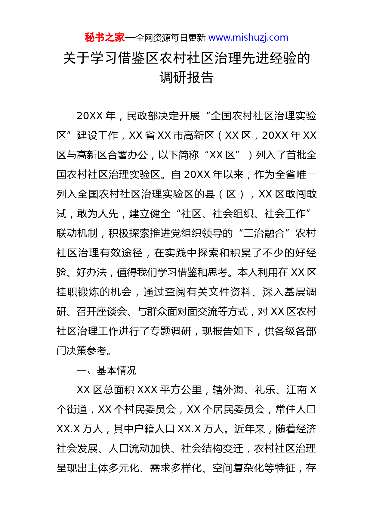 秘书之家—全网资源每日更新www.mishuzj.com关于学习借鉴区农村社区治理先进经验的调研报告20XX年,民政部决定开展“全国农村社区治理实验区”建设工作,XX省XX市高新区(XX区,20XX年XX区与高新区合署办公,以下简称“XX区”)列入了首批全国农村社区治理实验区。自20XX年以来,作为全省唯一列入全国农村社区治理实验区的县(区),XX区敢闯敢试,敢为人先,建立健全“社区、社会组织、社会工作”联动机制,积极探索推进党组织领导的“三治融合”农村社区治理有效途径,在实践中探索和积累了不少的好经验、好办法,值得我们学习借鉴和思考。本人利用在XX区挂职锻炼的机会,通过查阅有关文件资料、深入基层调研、召开座谈会、与群众面对面交流等方式,对XX区农村社区治理工作进行了专题调研,现报告如下,供各级各部门决策参考。一、基本情况XX区总面积XXX平方公里,辖外海、礼乐、江南X个街道,XX个村民委员会,XX个居民委员会,常住人口XX.X万人,其中户籍人口XX.X万人。近年来,随着经济社会发展、人口流动加快、社会结构变迁,农村社区治理呈现出主体多元化、需求多样化、空间复杂化等特征,存秘书之家—全网资源每日更新www.mishuzj.com在村(居)民参与社区治理积极性不高、组织化程度低,社会组织发育不充分,各类治理资源未能得到充分利用,基层群众自治的内容和载体相对单一等问题。为此,XX区以全国首批农村社区治理实验区建设为契机,围绕完善“农村社区三社联动机制建设”主题,完善农村社区治理机制、扩大农村公共服务供给,制定《推进农村社区治理三年行动计划》,以党建引领“三社联动”为主线,积极探索创新,逐步构建起“自治为基础、法治为保障、德治为支撑”的“三治融合”治理体系及“覆盖广泛、专业支撑、服务精准”的社会服务体系,高标准打造了XX村、XX村、XX社区、XX社区、XX社区等一批示范村(社区),呈现出“一村(社区)一品”的特色治理模式,形成了一批立得住、叫得响、可复制、可推广的好经验。一是党建引领是农村社区治理的重要基础。火车炮得快,全靠车头带。基层党组织能否发挥战斗堡垒作用事关农村社区治理的成效。近年来,XX区各级党政主要领导高度重视,始终坚持以党建为引领,围绕社区、社会组织、社工“三社联动”体制机制,聚焦解决群众身边事,扎实推进基层党建三年行动计划落地落实,建强班子,带动党员,一大批农村、社区、企业党建示范点获得省、市充分肯定,连续三年基层党建考核在全市排名前列,获“优秘书之家—全网资源每日更新www.mishuzj.com秀”等次。二是以人为本是农村社区治理的重要理念。民生无小事,枝叶总关情。近年来,XX区始终贯彻以人民为中心的发展理念,持续推进《农村社区治理三年行动计划》,实现了全区养老助残服务、儿童福利服务、专业社工服务、慈善公益服务、城乡志愿服务“五个全覆盖”,让广大人民群众更多更好地共享发展成果。三是民众参与是农村社区治理的重要力量。各村(社区)通过建立党员责任岗制度和村民居分制等,推动“党员带群众、干部带居民”,带动和辐射更多居民群众参与社区建设。此外,通过建立村民议事会、志愿者服务委员会、党员积分制、村民积分实施细则、街长制、志愿楼长、党员义工、“社工+党员志愿者”、“社工+志愿者+义工”、五彩亲子自愿服务队、长者生日会、长者饭堂、乡贤馆等载体,开展“最美家庭”、“最美村民”等评选活动,充分激发和调动广大群众自觉主动参与农村社区治理的积极性。四是制度建设是农村社区治理的重要保障。XX区在探索农村社区治理过程中,通过建立完善言简意赅或顺口溜的村规民约和村民议事会制度、党员责任岗制度、报告工作制度、村规民约积分管理细则等,推动了农村社区治理各项措施扎实有效落实。秘书之家—全网资源每日更新www.mishuzj.com五是“三治”融合是农村社区治理的重要抓手。XX区通过健全党组织领导下的多元主体参与机制、创新共治共享的基层民主法治新形式、引导群众树立崇德向善的文明新风等抓手,加强群众自我管理,推进自治、法治与德治相融合,构建了“自治为基础、法治为保障、德治为支撑”的现代化社区治理体系,实现了村(居)民的自我管理。六是社工组织是农村社区治理的重要补充。XX区通过以政府购买服务方式,区、街道、村级各出一点资金,通过区委政法委牵头和区民政局牵头两种渠道,分别引入公益创投社工(政府为完成一些面上工作,购买专业社工机构服务)和“双百”社工(区级层面统筹,按每人每年不少于7万元的总收入,给予每个街道聘请2个事务岗、每个村聘请1个服务岗的职数),这些社工组织经过专门针对性培训,通过与街道、村(居)签订有偿服务协议,深度参与接待群众办理事项、收集群众意见建议、积分制管理、村(居)务管理等事项,并且有一套比较完整规范的制度和工作范本,给村(社区)“两委”成员腾出了更多的时间抓党委、政府布置的各项工作,其工作成效得到广泛认可。二、主要经验做法(一)以党建引领“三社联动”,筑牢社区治理强大秘书之家—全网资源每日更新www.mishuzj.com根基一是强队伍,为基层治理注入新活力。全区63个村(社区)派驻基层党组织“第一书记”全覆盖,带动带强村(居)“两委”队伍;顺利完成2021年村(居)“两委”换届选