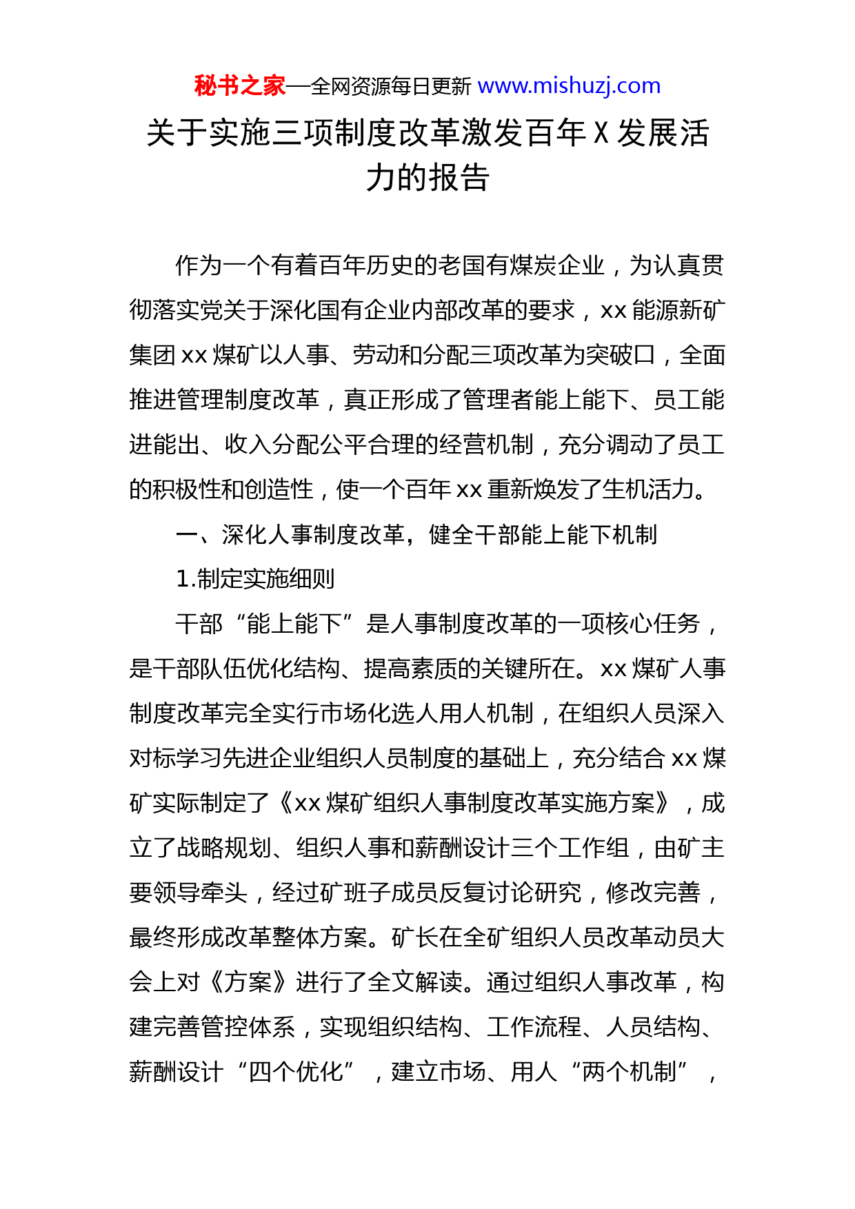 秘书之家—全网资源每日更新www.mishuzj.com关于实施三项制度改革激发百年X发展活力的报告作为一个有着百年历史的老国有煤炭企业,为认真贯彻落实党关于深化国有企业内部改革的要求,xx能源新矿集团xx煤矿以人事、劳动和分配三项改革为突破口,全面推进管理制度改革,真正形成了管理者能上能下、员工能进能出、收入分配公平合理的经营机制,充分调动了员工的积极性和创造性,使一个百年xx重新焕发了生机活力。一、深化人事制度改革,健全干部能上能下机制1.制定实施细则干部“能上能下”是人事制度改革的一项核心任务,是干部队伍优化结构、提高素质的关键所在。xx煤矿人事制度改革完全实行市场化选人用人机制,在组织人员深入对标学习先进企业组织人员制度的基础上,充分结合xx煤矿实际制定了《xx煤矿组织人事制度改革实施方案》,成立了战略规划、组织人事和薪酬设计三个工作组,由矿主要领导牵头,经过矿班子成员反复讨论研究,修改完善,最终形成改革整体方案。矿长在全矿组织人员改革动员大会上对《方案》进行了全文解读。通过组织人事改革,构建完善管控体系,实现组织结构、工作流程、人员结构、薪酬设计“四个优化”,建立市场、用人“两个机制”,秘书之家—全网资源每日更新www.mishuzj.com提高执行、服务“两个意识”,着力解决目前组织机构中存在的职能交叉、效率低下、权责不对等问题,逐步构建起精干高效、适应集团战略管控和产业发展要求、权责利相统一的服务型组织职能。此次人事改革共分7个步骤:第一步,根据集团公司规定确定各层级人员任职年龄界限;第二步,确定单位及单位正、副职职数设定,分离合并部分机构和人员;第三步,组织部门正副职竞聘、竞选工作;第四步,明确单位及机关部室职责划分,完善流程设计;第五步,制定相关支持性文件;第六步,结合运行情况,由专业领导和各部门负责人根据改革方案研究定岗定编定员的具体意见;第七步,完善薪酬改革方案,在此基础上制定薪酬管理办法。2.创新机构设置模式,调整优化组织架构(1)实行“以科带区、以区带科”的“大工区”制,构建职能综合、机构精简、人员精干、运行高效的管理体系。通过此项举措,不但精减了机关部室个数及人数,更是将机关部室管理职能及人员与工区职能相合并,有效提高了执行力与工作效率。(2)实行“一个部室、多个牌子”形式的“大部室”制,构建一专多能、一人多岗、一岗多责、交叉任职的管理体系。成立“三部两室”,即生产技术部、党群工作秘书之家—全网资源每日更新www.mishuzj.com部、经营管理部和生产调度室、综合办公室。这种管理体系不但精减了机关部室个数及人数,更是进一步优化了人力资源配置,提高了工作效率。(3)实行“大项目部”制,积极推进“专业化、区域化”整合。以“专业划分合理、职责界定清晰、作业流程规范、管理规模适度”为原则,将原工区进行合并。通过此项措施,不仅可以精减基层机构个数和管理人员职数,还可以实施区域性作业管理,合理集中生产,降低管理成本。(4)优化机关部室职能,下放部分管理职能。按照职能相近、业务相同的原则,对原机关科室进行合并。对部分具体工作职能划归生产单位,将人员分流至基层单位,从而进一步优化了各项业务管理流程。(5)合理确定上岗方式,确保实现平稳过渡。组织任用。为确保按时完成各项改革任务,新老机构实现平稳过渡,xx煤矿采用组织任用的方式对新成立的机关部室和基层单位正职人选进行确定,并严格按照动议、民主推荐、组织考察、公示、集体讨论等程序进行。竞聘上岗。对于基层单位副职岗位的选聘,xx煤矿以“公开、公平、竞争、择优”为原则,积极推行“职级档案化、岗位契约化”管理,各专业科学制定竞聘上岗办法,公开岗位任职资格条件,严格执行竞聘程序。各分管矿领导牵头,矿纪秘书之家—全网资源每日更新www.mishuzj.com委监察科、组织干部科等部门人员全程监督,做到有章可循、程序规范、步骤严密,确保优秀的管理人才得到使用,真正实现“能者上、平者让、庸者下”。兼职任用。对于机关部室、基层单位正职人选无法通过组织任用、竞聘上岗确定的,实行“矿领导、副总师”兼职制。双向选择。xx煤矿根据劳动用工改革文件精神,将组织人事制度改革与劳动用工改革同步进行,针对机关部室人员下发模拟调查问卷,了解其意愿动向。新选聘出的机关部室正、副职,根据机关部室人员调查问卷意愿及科室日常考核等情况,在整合科室中进行双向选择聘用。二、深化劳动用工制度改革,健全员工能进能出机制1.建立员工“能进能出”的用工制度企业的用工制度直接关系到经营机制的完善和企业活力。在劳动用工上,xx煤矿对标同行先进,积极推进市场化用工,依法建立以合同契约化管理为核心、岗位管理为基础的市场化用工机制,优化企业用工结构,规范用工形式,畅通进出渠道,形成正常流动机制。推行以劳动合同制用工为主、以劳务派遣用工为辅的用工形式,合理控制人员总量,建立适合各类人才的发展通道,全面实行全员竞争上岗制度,多渠道安置分流人员,以保证劳动生产率的持续提高。2.制定企业劳动用工中长期规划秘书之家—全网资源每日更新www.mishuzj.com为做好劳动用工改革工作,xx煤矿动员职工开展人力资源的统