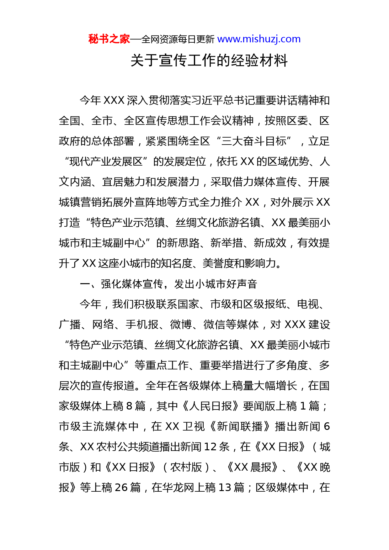秘书之家—全网资源每日更新www.mishuzj.com关于宣传工作的经验材料今年XXX深入贯彻落实习近平总书记重要讲话精神和全国、全市、全区宣传思想工作会议精神,按照区委、区政府的总体部署,紧紧围绕全区“三大奋斗目标”,立足“现代产业发展区”的发展定位,依托XX的区域优势、人文内涵、宜居魅力和发展潜力,采取借力媒体宣传、开展城镇营销拓展外宣阵地等方式全力推介XX,对外展示XX打造“特色产业示范镇、丝绸文化旅游名镇、XX最美丽小城市和主城副中心”的新思路、新举措、新成效,有效提升了XX这座小城市的知名度、美誉度和影响力。一、强化媒体宣传,发出小城市好声音今年,我们积极联系国家、市级和区级报纸、电视、广播、网络、手机报、微博、微信等媒体,对XXX建设“特色产业示范镇、丝绸文化旅游名镇、XX最美丽小城市和主城副中心”等重点工作、重要举措进行了多角度、多层次的宣传报道。全年在各级媒体上稿量大幅增长,在国家级媒体上稿8篇,其中《人民日报》要闻版上稿1篇;市级主流媒体中,在XX卫视《新闻联播》播出新闻6条、XX农村公共频道播出新闻12条,在《XX日报》(城市版)和《XX日报》(农村版)、《XX晨报》、《XX晚报》等上稿26篇,在华龙网上稿13篇;区级媒体中,在秘书之家—全网资源每日更新www.mishuzj.comXX电视台播出新闻及专题139条(个),在《XX日报》、《新XX》报、今日XX网、XX手机报、今日XX官方微博微信等上稿160余篇。特别是在《XX日报》(城市版)的报道实现新突破,全年刊发报道10多条,其中今年4月20日在《XX日报》头版头条刊登长篇图文报道《XX孝顺媳妇先后照顾瘫痪婆婆和公公》,介绍了获评“最美XX人”的欧玉兰的感人事迹,此外还刊发了其他版面头条4篇。二、开展城镇营销,提升小城市美誉度采取走出去和请进来相结合的方式,选好宣传点,营销XX,全面提升小城市美誉度。今年12月,XXX应邀参加XX市第三届微企发展论坛,镇党委书记在论坛上作交流发言,将XXX微型企业发展先进经验进行了对外推介,XXX亭子村在XX市首届微企创业大赛中被评为XX市“十强特色微企村”之首,各级媒体相继以微企发展壮大、微企户和村民生产生活变化等为切入点,在《人民日报》、《XX日报》、《XX新闻联播》等推出了一批反映企业发展、人物故事、村貌变化的重点报道。今年我们积极主动参加“XX最美小城镇”评选活动,《XX日报》于今年10月以《XX区XXX:用好美丽元素助推XX城市发展新区建设》为题对XXX小城市建设进行了专题报道,提升了我们的对外影响力,今年12月,XXX被评为XX市秘书之家—全网资源每日更新www.mishuzj.com“最佳生态宜居小城镇”。在今年的桃花节,我们邀请了区内媒体,组织召开了新闻发布会,宣传了XX桃花节的各项乡村旅游活动内容。在桃花节期间,我们还主动邀请了XX周边区县20余家网络媒体到XXX实地赏花和新闻采访报道,打响了“XX桃花”节会在XX周边区县的品牌影响力。三、拓宽外宣阵地,展示小城市新形象在紧密联系各级主流媒体的基础上,我们大力拓展自有宣传渠道。今年以来,在“美丽XX”官方微博发布56条,印发内部刊物《XX宣传简报》7期,在官方网站上发布新闻及信息44条,自办广播节目发布信息136条,在场镇LED上发布信息63条,利用7块大型户外广告位制作宣传广告3期15幅。其中,官方微博发布《XX胡萝卜滞销,大家都来帮帮忙》的信息,受到了网友的广泛关注,经XX官方微博、微信转发进一步扩大了关注度,有效帮助农户缓解了销售压力。通过全方位宣传XX、推介XX、营销XX,不仅提升了XX的形象,也助推了XX经济社会的全面发展。今年,XXXGDP突破X亿元,工业总产值突破X亿元,共接待游客X万人,实现旅游收入X万元,预计提前5年实现“到2021年城乡居民人均纯收入比2010年翻一翻”的目标。外宣工作强力推进,创新推进,合力推进,不断收获秘书之家—全网资源每日更新www.mishuzj.com新成果,也为全镇转型发展、提质发展、健康发展提供了有力的外部环境和舆论支持。四、深化一体推进“三不”以案促改“治未病”以“学党史、强三力、倡廉洁、开新局”为主题开展“党风廉政建设宣传教育月”活动,编制案例汇编XX份,召开警示教育大会XX次,发布时政新闻XX篇,警示案例XX篇,引导和激励干部职工知廉守廉,进一步筑牢不敢腐、不能腐、不想腐的思想防线。五、坚守政治定位,深化政治巡察落实整改工作督促推动总局混合所有制改革专项巡视和违规挂靠专项巡视反馈意见整改工作,对三级单位及兄弟单位开展常规巡察及交叉巡察工作,对XX家三级单位开展违规挂靠专项巡察,共发现问题XX个。持续加强制度建设、考核体系建设、队伍建设,巡察工作水平持续提升。六、多元谋划创突破,全面提振“XX”品牌实效以德育企、文化育人。XX坚持文化成果赋能经济发展,把具有地勘行业特色的行业精神和文化建设底蕴内化为全员共同的理念认知和行为自觉,内强素质、外塑形象,逐步完善品牌体系建设,夯实集团品牌实力。打造多元媒体矩阵,扩大“XX”品牌影响力。“网(网站)、报(简报)、微(企业微信、公众号)、视(视频号)、墙(宣传展板墙)”齐发力,放大融媒体优势,以秘书之家—全网资源每日更新www.mishuzj.com长篇通讯、主题报道、深度报道、微视频等多种传播模式为抓手,扩大“XX”品牌知名度。选树宣传先进典型,实现以德育企