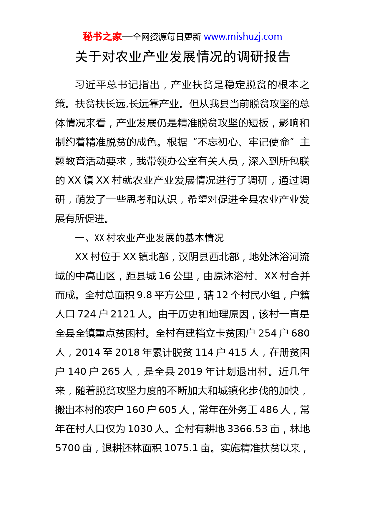 秘书之家—全网资源每日更新www.mishuzj.com关于对农业产业发展情况的调研报告习近平总书记指出,产业扶贫是稳定脱贫的根本之策。扶贫扶长远,长远靠产业。但从我县当前脱贫攻坚的总体情况来看,产业发展仍是精准脱贫攻坚的短板,影响和制约着精准脱贫的成色。根据“不忘初心、牢记使命”主题教育活动要求,我带领办公室有关人员,深入到所包联的XX镇XX村就农业产业发展情况进行了调研,通过调研,萌发了一些思考和认识,希望对促进全县农业产业发展有所促进。一、XX村农业产业发展的基本情况XX村位于XX镇北部,汉阴县西北部,地处沐浴河流域的中高山区,距县城16公里,由原沐浴村、XX村合并而成。全村总面积9.8平方公里,辖12个村民小组,户籍人口724户2121人。由于历史和地理原因,该村一直是全县全镇重点贫困村。全村有建档立卡贫困户254户680人,2014至2018年累计脱贫114户415人,在册贫困户140户265人,是全县2019年计划退出村。近几年来,随着脱贫攻坚力度的不断加大和城镇化步伐的加快,搬出本村的农户160户605人,常年在外务工486人,常年在村人口仅为1030人。全村有耕地3366.53亩,林地5700亩,退耕还林面积1075.1亩。实施精准扶贫以来,秘书之家—全网资源每日更新www.mishuzj.com该村的农业产业有了长足发展。据统计,到2019年11月底,全村已形成中长期农业产业2600余亩,占耕地总面积70.8%。该村注重因地制宜,突出本地优势和特色,大力发展种植、养殖,以产业带动脱贫,农业产业发展取得了初步成效,基本形成了以老树茶、花椒、油茶、畜牧为主导的四个产业和三个具有初级产品加工能力的龙头企业,培育了以土地资源和扶贫资金为纽带的4个村集体经济合作组织。(一)老树茶及茶叶产业。一是老树茶建设。由XX镇退休财政干部、县人大代表沈桂树牵头组建的XX村茶叶专业合作社,承包经营XX村800亩老树茶。该茶园建成于上世纪70年代,由于经营管理不善,一度处于荒芜状态,经过沈桂树近几年的改造和建设,目前处于盛产期。与此同时,由村集体合作社与茶叶生产企业联合新建的500余亩富硒茶基地基本建成,合作社吸收社员56名,带贫益贫效果明显,并优先聘用XX村及附近村的贫困户就地务工。据统计,在采茶旺季(主要集中在1至6月),用工最高峰时有60至80余人,贫困户人均采茶日工资可达180至200元。2018年至2019年上半年,旺季每季度向务工群众(含非贫困户)发放工资达5至6万元,淡季(7-12月)每季度发放工资2至3万元。同时,贫困户还可以土地、资金入股等形式参与到茶园管理、分红,获得稳定收秘书之家—全网资源每日更新www.mishuzj.com入,一个贫困户全年稳定收入达8千至1万元左右。二是2019年初,县委政府出台了加快推进“加入一个产业专业合作社、发展一项长效特色产业、扶持一笔产业奖补资金”的“三个一”产业扶贫政策,XX村“三委”在在调研论证和征求意见的基础上,成立了XX镇首家农旅专业合作社,并确定以茶叶产业作为主导产业,按照贫困户户均配股5000元的标准发展茶园500亩,截止2019年11月上旬,全面完成了栽植任务。(二)花椒产业。花椒种植主要是以XX村村民曾兆敏的愚公生态农业科技发展有限公司和愚公花椒种植专业合作社为主,现建成标准化花椒种植示范基地1000亩,带动周边农户种植花椒4000亩,实现产值500余万元。截止2019年10月,愚公花椒种植专业合作社建花椒园1500亩,常年用工在50-100个人之间,2018年实发放用工工资36万元,2019年发放用工工资45万元,通过固定用工带动贫困户19户,种植托管带动贫困户6户,股金入股分红带动贫困户5户,流转土地带动贫困户46户。同时对青花椒进行深加工,制作成干花椒、花椒油、保鲜花椒等产品,创造更多的附加值。(三)油茶产业。XX村油茶产业主要由县人大代表程言勇经营的永胜生态农业开发有限公司承担,油茶基地共1600亩,年摘油茶果20至30万斤,生产油茶籽10万秘书之家—全网资源每日更新www.mishuzj.com斤,以委托加工的方式,产品销往本地及北京、上海等地,永胜生态农业有限公司上游的油茶加工,由于企业目前正处于起步阶段,主要是委托江西油茶企业加工,并通过其销售渠道出售,2018年累计销售额100余万元,2019年通过电商平台进行了销售,半年销售额达到47.5万元。(四)畜牧养殖。XX村畜牧养殖主要以牛、生猪、土鸡等为主,尤其是养牛产业初现规模,2019年,XX村养牛存栏710头,户均养殖1头,是汉阴名副其实的“养牛大村”。主要经营组织有XX村蓝翔专业养殖合作社、坤圣隆养殖专业合作社等,以西门塔尔肉牛养殖为主。二、XX村农业产业发展出现了一些可喜的变化(一)规模种养业均为能人引领。小学教师、财政干部出身的“茶专家”沈桂述经过几年的探索,在2013年开发了爆款产品茶枕,先后获得11项国家专利。如今,沈桂述以800亩老树茶为起点,新建基地500亩,还有一片没开发的老树茶300亩。她成立了陕西秦岭XX山富硒茶叶科技有限公司和XX镇XX山茶叶合作社,通过“公司+合作社”的模式,带动产业发展农民增收。在她的计划里,还要以XX老树茶为重点,不断整合汉阴茶产业,通过茶旅融合、茶文化培训、发展民宿等。曾兆敏,现年33岁,初中文化,在深圳、杭州务工4年,回乡创业,发展秘书之家—全网资源每日更新www.mishuzj.com花椒产业。程言勇,初中文化,在外跑车10余年,很早就开始从事油茶果的生产销售,但一直没有干出名堂,直到2016年请