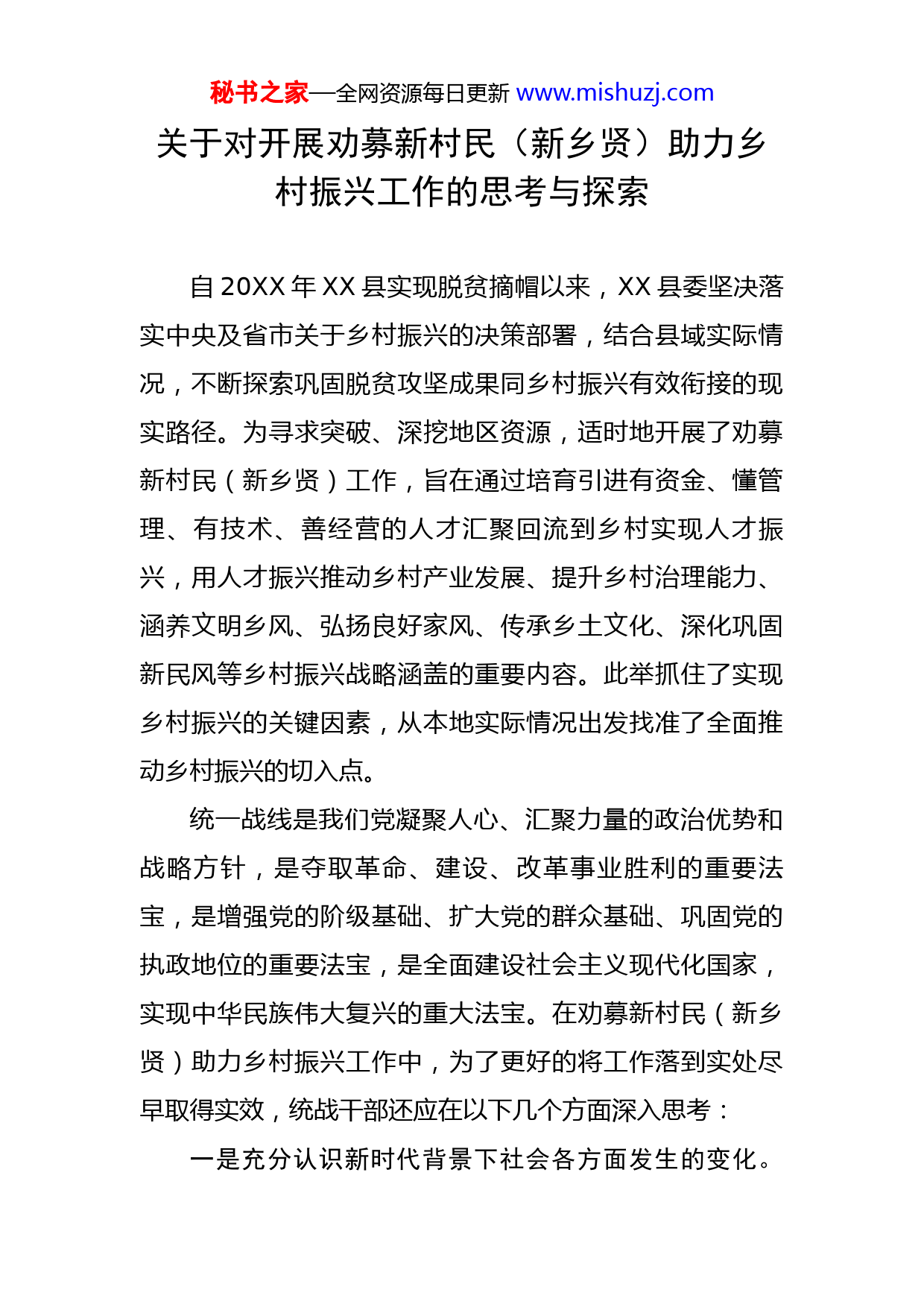 秘书之家—全网资源每日更新www.mishuzj.com关于对开展劝募新村民(新乡贤)助力乡村振兴工作的思考与探索自20XX年XX县实现脱贫摘帽以来,XX县委坚决落实中央及省市关于乡村振兴的决策部署,结合县域实际情况,不断探索巩固脱贫攻坚成果同乡村振兴有效衔接的现实路径。为寻求突破、深挖地区资源,适时地开展了劝募新村民(新乡贤)工作,旨在通过培育引进有资金、懂管理、有技术、善经营的人才汇聚回流到乡村实现人才振兴,用人才振兴推动乡村产业发展、提升乡村治理能力、涵养文明乡风、弘扬良好家风、传承乡土文化、深化巩固新民风等乡村振兴战略涵盖的重要内容。此举抓住了实现乡村振兴的关键因素,从本地实际情况出发找准了全面推动乡村振兴的切入点。统一战线是我们党凝聚人心、汇聚力量的政治优势和战略方针,是夺取革命、建设、改革事业胜利的重要法宝,是增强党的阶级基础、扩大党的群众基础、巩固党的执政地位的重要法宝,是全面建设社会主义现代化国家,实现中华民族伟大复兴的重大法宝。在劝募新村民(新乡贤)助力乡村振兴工作中,为了更好的将工作落到实处尽早取得实效,统战干部还应在以下几个方面深入思考:一是充分认识新时代背景下社会各方面发生的变化。秘书之家—全网资源每日更新www.mishuzj.com随着改革开放政策的实施,社会、经济、文化等方面均出现了巨大变化,在先富带后富的政策指引下,改革开放XX年创造了巨大的经济财富,社会整体朝着共同富裕的目标持续迈进,但社会结构也出现了较明显的变化,地区差异、个体差异逐渐明显。经济高速发展的同时,地区和个体在追求经济价值的过程中自然而然的形成了优势地区的虹吸效应,资源、人才流出地区形成了必经阶段的“被动落后”。我们应该认识到,脱贫攻坚解决的是区域和个体在基本需求上的问题,乡村振兴要解决的是发展角度上的区域和个体追求的问题,为的是实现共同富裕的伟大目标。二是科学定位和分析部分劝募新村民(新乡贤)在乡村振兴作用的发挥。新村民(新乡贤)是对具有乡土情怀、有资金、懂管理、有技术、善经营的外来投资主体、有为返乡人士以及本地在外事业有成、思想先进、热爱公益、关心集体且具有良好社会声望、具有典型示范带头作用的一切参与推动、助力乡村振兴的积极因素的社会称谓或是一种新的社会荣誉,要求新村民(新乡贤)具有一定的奉献性、自愿性、公益性和高度社会责任感。新村民(新乡贤)的培育和壮大中必须特别重视乡土情怀纽带的维系,我们要发挥统一战线的凝聚作用,引导和号召他们自愿参与加入到乡村振兴战略的实施中来,推动产业发秘书之家—全网资源每日更新www.mishuzj.com展、改变传统落后观念,带动引导区域经济发展,实现乡村振兴这一伟大战略布局。三是正确认识新村民(新乡贤)队伍培育以及效用的发挥。新村民(新乡贤)作为一个包含社会阶层较为广泛的对象来劝募和培育,首先要在对象筛选上做到精准细致,坚持自愿原则,发展壮大规模,形成一定的聚集效应来发挥最大的潜在作用。公益性、传承性、参与性在整个劝募和培育新村民(新乡贤)中应占有一定比例,这样才能构成坚固的基础。通过活动的开展、政策宣传加大新发展理念、新价值观念、新合作方式、新共享意识、新链接机制的传播和推广,潜移默化的改变一切不利因素。重视优秀传统的传承(优秀家风、家训、传统技艺、特色习俗等)才能在同质化的发展浪潮中保持特色,建立新的优势。四是着力创造新村民(新乡贤)培育条件和环境。面对城市化进程还必须考虑新村民(新乡贤)代际“孵化”的问题,就要求我们在教育上必须重视乡土概念和情怀的培养,从长远来看,就是要为“归雁”领航,为“候鸟”筑巢。村级作为自治组织应当从优势条件出发进一步准确定位,有针对性的开展新村民(新乡贤)培育。乡村振兴最终实现的面貌必将是一处主导牵头,“五大振兴”同步推进的局面,从整体来看也必将是有着某种特点的全面振秘书之家—全网资源每日更新www.mishuzj.com兴。统一战线工作在新时代背景下坚持围绕中心、服务大局的原则要求我们在推动乡村振兴奋力实现“第二个百年”目标中,必须要发挥统战部门和统战干部的自身优势找准创新推动工作的抓手,牵头、协调各方创造有利于推动乡村振兴的环境和条件,组织好各方力量、用好社会力量。同时更要抓住工作重点勇于担当,积极作为,结合本职工作创新工作思路和工作方法,丰富新时代统一战线工作内容,践行新时代赋予统一战线工作的新使命,让新时代的统一战线工作继续发挥法宝作用。