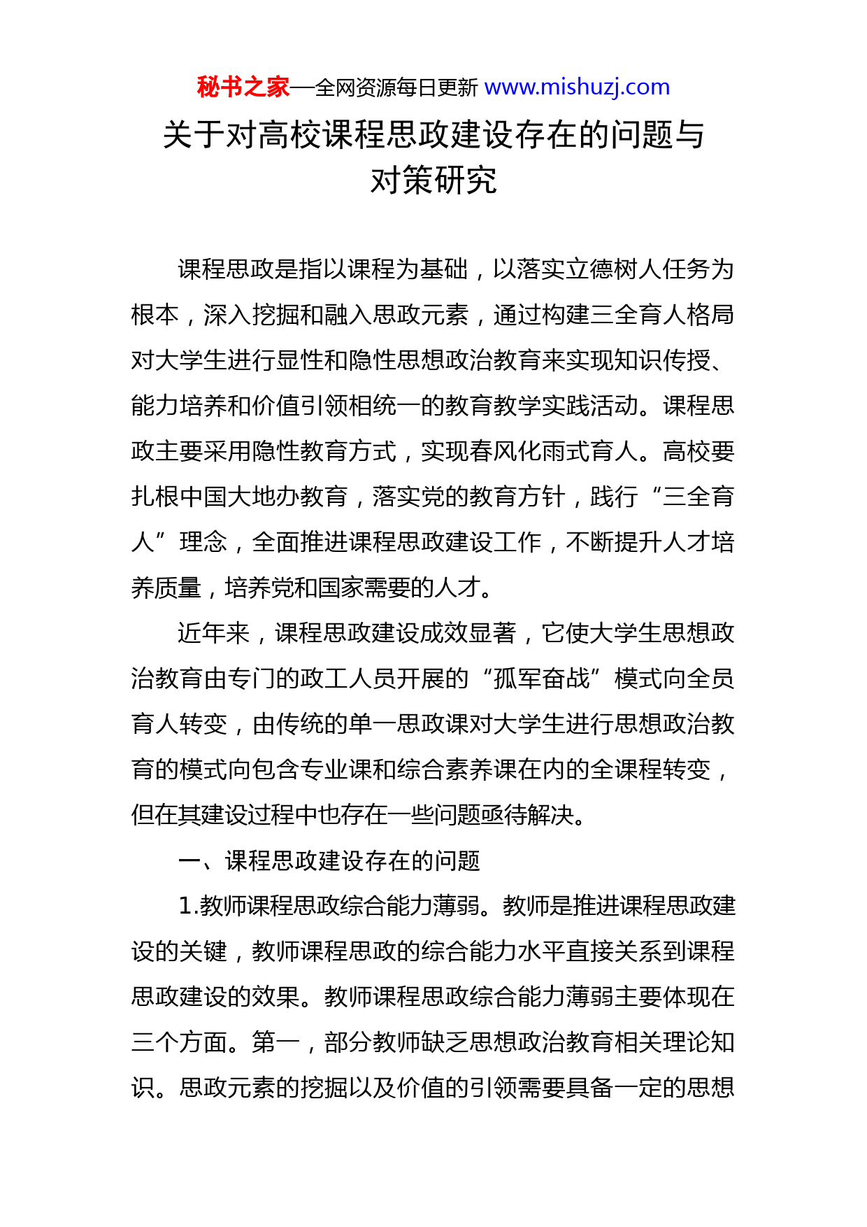 秘书之家—全网资源每日更新www.mishuzj.com关于对高校课程思政建设存在的问题与对策研究课程思政是指以课程为基础,以落实立德树人任务为根本,深入挖掘和融入思政元素,通过构建三全育人格局对大学生进行显性和隐性思想政治教育来实现知识传授、能力培养和价值引领相统一的教育教学实践活动。课程思政主要采用隐性教育方式,实现春风化雨式育人。高校要扎根中国大地办教育,落实党的教育方针,践行“三全育人”理念,全面推进课程思政建设工作,不断提升人才培养质量,培养党和国家需要的人才。近年来,课程思政建设成效显著,它使大学生思想政治教育由专门的政工人员开展的“孤军奋战”模式向全员育人转变,由传统的单一思政课对大学生进行思想政治教育的模式向包含专业课和综合素养课在内的全课程转变,但在其建设过程中也存在一些问题亟待解决。一、课程思政建设存在的问题1.教师课程思政综合能力薄弱。教师是推进课程思政建设的关键,教师课程思政的综合能力水平直接关系到课程思政建设的效果。教师课程思政综合能力薄弱主要体现在三个方面。第一,部分教师缺乏思想政治教育相关理论知识。思政元素的挖掘以及价值的引领需要具备一定的思想秘书之家—全网资源每日更新www.mishuzj.com政治教育理论素养,需要有马克思主义理论的指导,但部分综合素养课和专业课教师缺乏主动学习思想政治教育相关理论的意识,在科研和教学以及其他工作的压力下,他们也无暇进行学习,从而制约了课程思政工作的开展。第二,部分综合素养课和专业课教师课程思政理念尚未完全转变。当前仍有部分专业课和综合素养课教师认为大学生思想政治教育是思政课教师和政工干部的事情,自己只要做好专业知识传授和能力培养工作即可,没有真正认识到自己同样也担负着育人的使命,致使只“教书”不“育人”,只“授业”不“解惑”的状况一直存在。第三,部分教师挖掘思政元素能力欠缺。部分其他课程教师重视专业知识教育而轻视思想政治教育,教学中不注重思政元素的挖掘和积累,甚至有部分教师不知道什么是思政元素,也不知道如何挖掘,更不知道应该如何将其有效融入教学过程以及采用什么方式对学生进行价值引领。2.课程体系建设欠缺。课程思政建设以高校所开设的各类课程为载体。目前,高校课程体系建设中主要存在三个方面的问题。第一,课程教学存在“课程”+“思政课”两张皮现象。课程思政要求将思政元素有机融入课程教学中,达到“溶盐于汤”的效果。目前来看,部分教师在课程设计以及授课过程中达不到预期状态,把课程思政异化成“课程”+“思政课”,将思政知识硬性加入课程教学秘书之家—全网资源每日更新www.mishuzj.com中,把专业课和综合素养课上成了思政课。第二,课程思政缺乏一体化建设。在推进课程思政建设过程中,多是专业课教师自己在努力,从所讲授的课程中挖掘思政元素,融入价值引领。从专业和学科的角度来说,专业负责人未能有效整合自己所负责专业的所有课程,有重点的挖掘思政元素;学科负责人未能站在学科高度上有效动员教师挖掘和梳理学科范围内各专业及其课程所包含的思政元素,不能合理统筹不同思政元素在不同课程中的讲授,课程思政建设未能实现“课程—专业—学科”一体化建设。第三,不同类型课程的横向协同存在短板。思政课、综合素养课和专业课从授课内容、功能定位上看是三类性质不同的课,思政课主要是系统讲授马克思主义理论,综合素养课是对学生进行通识性教育和人文素养教育,专业课主要是向学生传授专业知识以及培养学生专业技能。三类课程之间存在壁垒,综合素养课和专业课未能有效融入爱国主义、价值观、职业道德等思政元素,协同育人效果不明显。3.体制机制不健全。体制机制在课程思政建设中具有整体性、长远性和保障性的功能和作用。目前,高校在推进课程思政建设的过程中仍存在体制机制不健全问题,具体体现在顶层设计、考核评价、协同机制等环节和方面。第一,顶层设计不完善。顶层设计是高校从全局上对课程思秘书之家—全网资源每日更新www.mishuzj.com政建设工作做出的整体部署,部分高校顶层设计不完善,对于谁来领导、谁来牵头、怎样组织动员、如何做好保障等问题缺乏清晰明确的规定,如,部分高校强调课程思政建设工作中学校党委的领导作用,毋庸置疑,党委在办学治校中承担主体责任,但在高校中仍旧需要一个特定部门或者机构具体负责课程思政建设工作。第二,考核评价机制不健全。为有序有效推进课程思政建设,大部分高校根据自身实际情况制定了实施方案,其中强调了考核评价的重要性。学校会定期对课程思政工作实施情况进行评价,但在实际操作中,考核评价存在评价主体单一、考核指标体系笼统、考核结果利用率不足等问题,未能调动起所有教师主动参与的热情,考核评价的应有作用未能得到有效发挥。二、课程思政建设的实践路径1.抓住教师队伍“主力军”。“教师是立教之本、兴教之源”,在课程思政建设过程中高校要发挥教师的积极性、主动性,“把教师队伍建设作为基础工作”。第一,不断提升教师的马克思主义理论素养。具备一定的马克思主义理论素养,掌握一定的思想政治教育方法,是教师推进课程思政工作的前