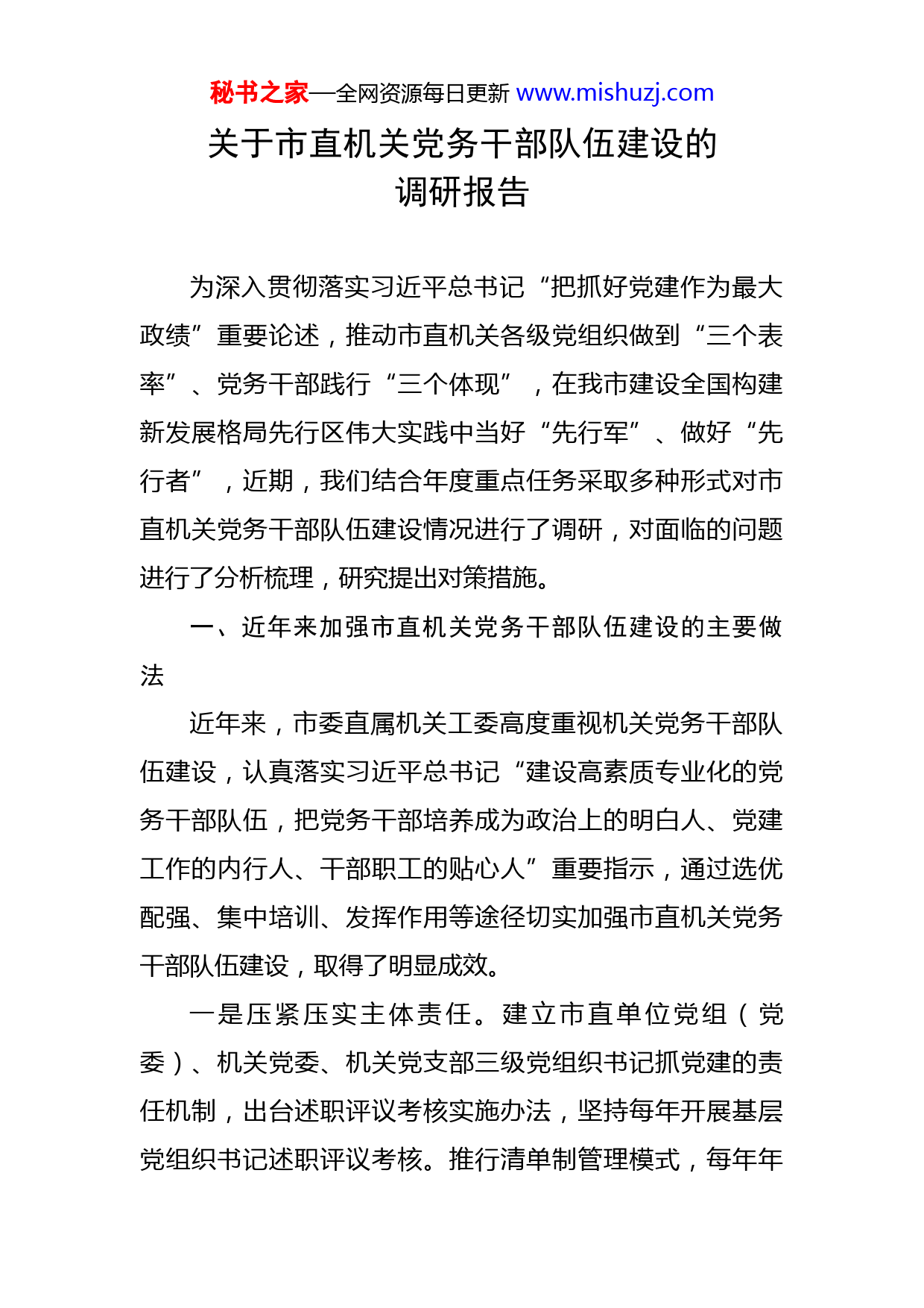 秘书之家—全网资源每日更新www.mishuzj.com关于市直机关党务干部队伍建设的调研报告为深入贯彻落实习近平总书记“把抓好党建作为最大政绩”重要论述,推动市直机关各级党组织做到“三个表率”、党务干部践行“三个体现”,在我市建设全国构建新发展格局先行区伟大实践中当好“先行军”、做好“先行者”,近期,我们结合年度重点任务采取多种形式对市直机关党务干部队伍建设情况进行了调研,对面临的问题进行了分析梳理,研究提出对策措施。一、近年来加强市直机关党务干部队伍建设的主要做法近年来,市委直属机关工委高度重视机关党务干部队伍建设,认真落实习近平总书记“建设高素质专业化的党务干部队伍,把党务干部培养成为政治上的明白人、党建工作的内行人、干部职工的贴心人”重要指示,通过选优配强、集中培训、发挥作用等途径切实加强市直机关党务干部队伍建设,取得了明显成效。一是压紧压实主体责任。建立市直单位党组(党委)、机关党委、机关党支部三级党组织书记抓党建的责任机制,出台述职评议考核实施办法,坚持每年开展基层党组织书记述职评议考核。推行清单制管理模式,每年年秘书之家—全网资源每日更新www.mishuzj.com初下发责任清单,每季度下发一次问题清单,持续抓好问题的整改落实,通过清单管理模式明责、亮责、考责,形成了责任落实的工作闭环。通过多种举措督促机关党务干部认真履职尽责、积极担当作为,同时指导督促市直机关落实谈心谈话、思想动态分析、党内关怀帮扶等制度。二是选优配强党务干部。认真落实机关基层组织工作条例对选拔配备机关党务干部比例、条件和程序的要求,进一步明确党务干部的政治条件和选拔标准。严格落实党组织任期制度,及时督促指导市直机关党组织做好换届、补选工作,切实通过换届将政治素养好、党性修养高、业务能力强的党员选进党组织班子成员。建立党务干部备案制度,实行动态调整审批机制,仅2022年市委直属机关工委共办理党务干部任免等批复XXX件XXX人次。截至目前,市直机关(一级单位)共有党务干部XXX名,其中,机关党委书记XXX人,机关党委专职副书记XXX人,机关党委副书记XXX人,专兼职党务干部XXX人。三是分层分类示范培训。坚持“走出去”和“请进来”相结合,分层分类强化党务干部培训,分别在江西瑞金、山东临沂、陕西延安等地举办机关党委负责人培训班,坚持每年举办机关党委负责人,机关党支部书记专(兼)职党务干部、入党积极分子和发展对象等示范培训班。2019年以来,市委直属机关工委共培训机关党委书记秘书之家—全网资源每日更新www.mishuzj.comXX人、机关党委专职副书记XX人、一级单位党支部书记XXX人、二级单位党委(党支部)书记XXX人;市直机关共举办党员培训XXX期约XX万余人,分层分类开展党务干部培训的做法得到了市直机关的高度认可和普遍好评,已成为市委直属机关工委的靓丽品牌。二、当前市直机关党务干部队伍建设存在的主要问题近年来,我们通过XXX人次匿名问卷调查、XXX人次党务知识小测试、集体座谈交流发言、课后个别交谈等形式,收集市直机关在职党务干部、参加培训学员其他干部职工意见建议XXX余条。综合平时检查考核等了解掌握的情况,梳理了当前市直机关党务干部队伍建设存在的问题和不足。一是思想认识有偏差。整体来看,大多数市直机关认真落实机关党建工作主体责任,但也有少数机关依然存在对党建工作重视程度不够的问题。比如,个别机关主要领导认为党建工作是副业,业务工作才是主业,主责主业实打实、硬碰硬,机关党建任务虚、指标软,主业必须主抓,副业可以应付。少数分管领导把主要精力放在业务工作上,对党务工作“说起来重要、做起来次要、忙起来不要”,领导干部“厚此薄彼”的做法,严重挫伤了党务干部工作的积极性。还有的认为业务工作是中心、业务干部是骨干,在业务科室有盼头,而党务工作是服务党务干部秘书之家—全网资源每日更新www.mishuzj.com是边缘,党务干部的出路不畅、获得感不高在受访的XXX名专(兼)职党务干部中,33%的党务干部对所处岗位不满意,不愿意做党务工作,对提升自身泰质不重视,学习、工作的积极性和热情不高。二是履职能力有短板。市直机关部分党务干部存在综合素养不高、履职能力较弱的情况,主要表现在:对本机关的中心工作不太熟悉,对党建的政治引领、服务保证等属性功能认识不到位,人为造成党建与业务两张皮",学习意识不强,对党内新规定、新要求一知半解,出现“老办法不管用、新办法不会用”的被动局面,缺乏调查研究能力,不能准确靠提本机关科室、基层支部的党建工作实情开展工作找不准方向、抓不住重点:参加党务培训不积极,一周的培训学习笔记不到3页纸,座谈发言无话可说:有的机关以经费紧张为借口,不主动组织本机关党务干部培训,以会代训、消极等训岗外替训的情况不同程度存在。截至2022年12月底市直机关XXX名(一级单位)党务干部中,参加过市委直属机关工委组织的为期一周的示范培训XXX人参训率XX%,专兼职党务干部XXX人中,XXX人参加过正规培训,参训率XX%。三是工作机制有缺陷。部分市直机关的组织人事部门和党务部门由不同领导分管,涉及干部培训、党员管理、走访慰问、奖励表彰等事项,容易出现相互推诿扯皮问秘书