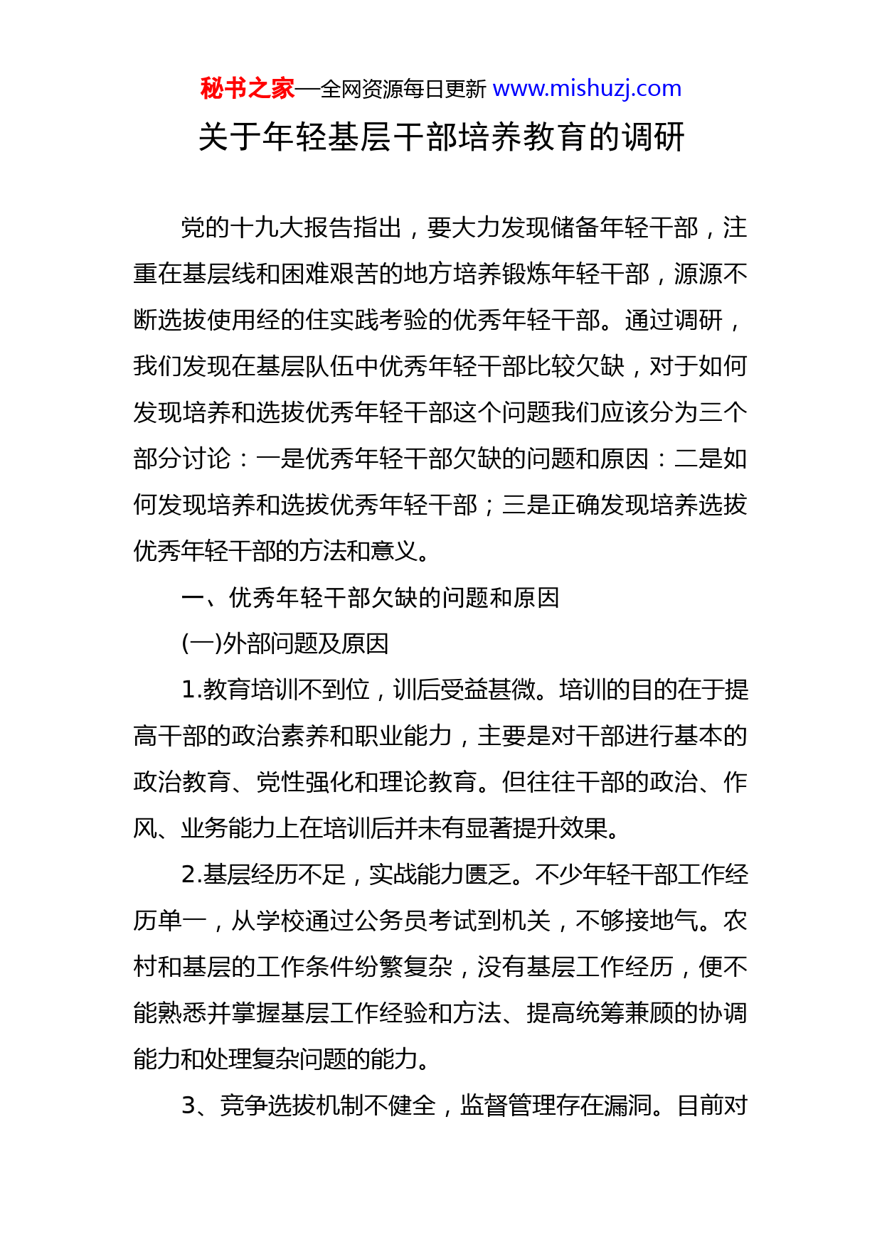 秘书之家—全网资源每日更新www.mishuzj.com关于年轻基层干部培养教育的调研党的十九大报告指出,要大力发现储备年轻干部,注重在基层线和困难艰苦的地方培养锻炼年轻干部,源源不断选拔使用经的住实践考验的优秀年轻干部。通过调研,我们发现在基层队伍中优秀年轻干部比较欠缺,对于如何发现培养和选拔优秀年轻干部这个问题我们应该分为三个部分讨论:一是优秀年轻干部欠缺的问题和原因:二是如何发现培养和选拔优秀年轻干部;三是正确发现培养选拔优秀年轻干部的方法和意义。一、优秀年轻干部欠缺的问题和原因(一)外部问题及原因1.教育培训不到位,训后受益甚微。培训的目的在于提高干部的政治素养和职业能力,主要是对干部进行基本的政治教育、党性强化和理论教育。但往往干部的政治、作风、业务能力上在培训后并未有显著提升效果。2.基层经历不足,实战能力匮乏。不少年轻干部工作经历单一,从学校通过公务员考试到机关,不够接地气。农村和基层的工作条件纷繁复杂,没有基层工作经历,便不能熟悉并掌握基层工作经验和方法、提高统筹兼顾的协调能力和处理复杂问题的能力。3、竞争选拔机制不健全,监督管理存在漏洞。目前对秘书之家—全网资源每日更新www.mishuzj.com年轻干部选拔资格要求不够明确,岗位的特殊性和专业性没有得到完全体现,没有形成全面有效的竞争选拔机制,有时难以选拔真正符合要求的人才。同时,在对年轻干部监督管理方面存在漏洞,有些单位和机关内部管理混乱,制度执行不严,日常检查不到位,使一些意志薄弱的年轻干部出现了腐败的侥幸心理和投机心理,容易走向职务犯罪的道路。(二)内部问题及原因部分年轻干部主动学习能力不强,自我约束力不强。少数年轻干部仍存在“考上就是铁饭碗”的老旧观念。在工作中缺乏学习的自觉性、主动性和积极性,不能够及时主动学习业务知识和能力,抱着“干多干少一个样”的念头得过且过。也有部分年轻干部因噎废食,一些年轻干部平时在工作中由于害怕出错误、害怕被责骂从而在工作遇到难题的时候第一时间想到的是逃避却不是主动寻求解决办法。二、如何发现培养和选拔优秀年轻干部(一)培养培训应抓好,着力提升年轻干部能力素质。培训应注重理想信念教育和业务能力提升。注重加强年轻干部的理想信念教育,让广大党员干部原原本本学党章,学习近平总书记系列讲话,学党的历史,不断夯实理想信念根基;抓好职业能力素质培训,采取集中培训、分类组秘书之家—全网资源每日更新www.mishuzj.com训、对策研究、交流互动等方法,采用培训与考试相结合的方式,在避免“为学而学”的基础上调动年轻干部的参学积极性。举办年轻干部主体培训班,科学设置参训条件,甄选各方面比较成熟、有真才实学的年轻干部进行重点培训。也可组织干部就相关领域,走出去进行实地考察学习,召开以小组为单位的无领导讨论会议,就各自考察了解的情况进行分解剖析,广泛吸收考察对象优点以提升自身相关业务能力。健全干部教育培训激励机制,将教育培训情况作为干部考核的内容和任职、晋升的重要依据,与干部个人成长进步相结合,激发年轻干部积极参加教育培训。(二)基层培养要加强,大力拓展年轻干部锻炼渠道。从适应新时代发展要求的能力需要出发,加大年轻干部专业能力培养力度,坚持强化实践导向,在实践中观察识别年轻干部,在实践中磨砺摔打年轻干部。对年轻干部必须坚持递进式培养:新录用的公务员应先到基层工作、缺少基层工作经历年轻干部也要到基层进行锻炼、优秀且有潜力的年轻干部更应该安排到基层一线去“接地气”。对组织上看得准,有较好发展潜质的年轻干部,大胆委以重任,给他们“压担子”,全面增强领导能力和综合素质。加大年轻干部挂职交流力度,推荐优秀年轻干部交流任职和挂职锻炼,丰富岗位任职经历,提升综合能力素质。秘书之家—全网资源每日更新www.mishuzj.com(三)选拔标准须严格,努力改进年轻干部选拔任用机制。严格落实党政领导干部选拔任用要求,建立健全常态化选拔工作机制。坚持把年轻干部整体配备目标和领导班子具体情况相结合,把年轻干部的选拔配备寓于干部日常管理和经常性工作之中,列入党委和领导干部职责目标。对于经过长期考验、基层经历丰富、各方面比较成熟的年轻干部,大胆提拔使用。坚持把功夫下在平时,注重从工作业绩、一贯表现和群众口碑中考察了解干部,分层分类始终掌握一定数量年轻干部,防止突击配备、急用现找。健全完善后备干部培养锻炼、适时使用、定期调整、有进有出的机制,科学安排培养锻炼周期,实行动态管理,不搞“呵护式”培养,防止“备而不用”和“有备必上”,及时将符合后备干部人选标准、综合素质好、班子建设需要的年轻干部吸纳进来。(四)干部监督管理更严格,努力营造健康向上的成长环境。建立年轻干部思想动态定期分析和谈心谈话制度,及时了解掌握年轻干部的思想状况、作风表现和工作生活情况。坚持关口前移,对年轻干部的管理要注重管早、管小、管在平时,对苗头性、倾向性、潜在性问题,及时教育提醒,及时调整纠正。积极疏通和拓宽群众监督渠道,结合干部考察、年度考核等时机,深入到群众当中,通过民主评议、发放征求意见表、走访调查等形
