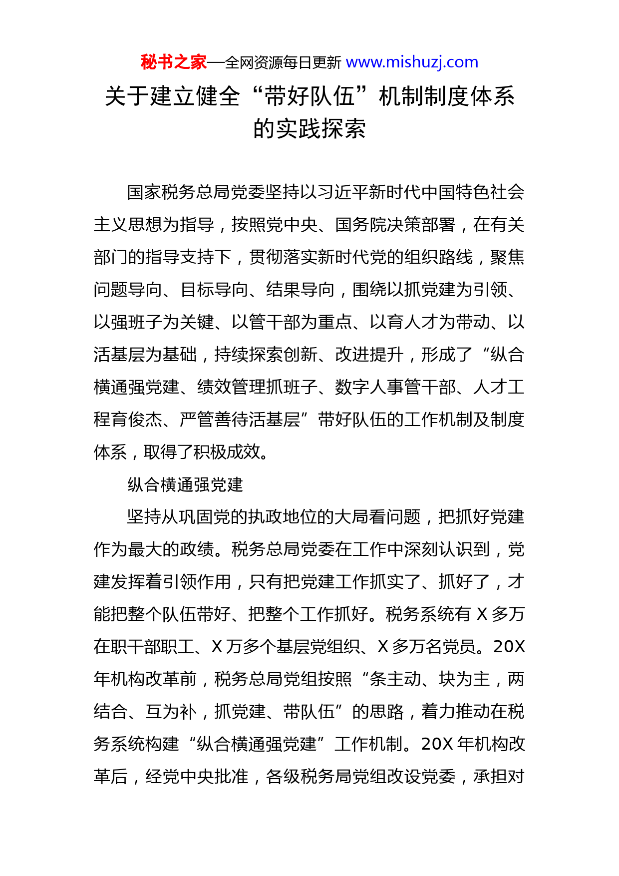 秘书之家—全网资源每日更新www.mishuzj.com关于建立健全“带好队伍”机制制度体系的实践探索国家税务总局党委坚持以习近平新时代中国特色社会主义思想为指导,按照党中央、国务院决策部署,在有关部门的指导支持下,贯彻落实新时代党的组织路线,聚焦问题导向、目标导向、结果导向,围绕以抓党建为引领、以强班子为关键、以管干部为重点、以育人才为带动、以活基层为基础,持续探索创新、改进提升,形成了“纵合横通强党建、绩效管理抓班子、数字人事管干部、人才工程育俊杰、严管善待活基层”带好队伍的工作机制及制度体系,取得了积极成效。纵合横通强党建坚持从巩固党的执政地位的大局看问题,把抓好党建作为最大的政绩。税务总局党委在工作中深刻认识到,党建发挥着引领作用,只有把党建工作抓实了、抓好了,才能把整个队伍带好、把整个工作抓好。税务系统有X多万在职干部职工、X万多个基层党组织、X多万名党员。20X年机构改革前,税务总局党组按照“条主动、块为主,两结合、互为补,抓党建、带队伍”的思路,着力推动在税务系统构建“纵合横通强党建”工作机制。20X年机构改革后,经党中央批准,各级税务局党组改设党委,承担对秘书之家—全网资源每日更新www.mishuzj.com本单位本系统党的建设、全面从严治党主体责任,税务总局党委按照“条主责、块双重,纵合力、横联通,齐心抓、党建兴”的思路,及时对这套工作机制进行了调整,并按照习近平总书记在中央和国家机关党的建设工作会议上的重要讲话精神,不断加以完善。特别是始终做到旗帜鲜明讲政治,把学习习近平新时代中国特色社会主义思想作为首要政治任务,作为各级税务局党委会议的“第一议题”,并形成制度化安排,确保始终在思想上政治上行动上同以习近平同志为核心的党中央保持高度一致。纵合。即在系统上下“纵向”形成“两个合力”。一方面,形成税务总局党委与地方党委及其工作部门共抓税务系统党建的合力。税务总局党委和各级税务局党委在坚决扛起管党治党主体责任的同时,积极争取各级地方党委及机关工委、组织部、纪委监委等工作部门的指导支持。同时,要求各级税务局党委每年至少向地方党委及其工作部门汇报2次党建工作情况,上一级税务局党委与下一级税务局所在地党委及其工作部门建立常态化沟通协调机制。另一方面,形成总局党委与各级税务局党委共抓税务系统党建的合力。制定税务系统落实“两个责任”实施办法,并根据中央精神多次修订完善,清单式逐一明确X类责任主体的X项具体责任事项,做到主体、方式、对象、措施“四明确”。探索建立“下抓两级、抓深一层”工作秘书之家—全网资源每日更新www.mishuzj.com机制,实行总局主抓省局、延伸带市局,省局主抓市局、延伸带县局,市局主抓县局、延伸带分局(税务所),以主抓推动延伸,以延伸倒逼主抓,打通主体责任落实的“最后一公里”。比如,税务总局每名班子成员选取X个市级税务局作为基层党建联系点,每年听取党建工作述职并指导其党建工作。各省、市税务局班子成员也都在县局、税务分局建立基层党建联系点,促进管党治党责任压紧压实。横通。即在税务机关内部“横向”实现“七个打通”。实行党建工作领导小组和党风廉政建设领导小组合署办公、实体化运行,总局成立党建工作局,省局、市局分别设置系统党建工作处、科,承担领导小组日常工作,建立领导小组各成员单位协作配合机制,打通党建与党风廉政建设、机关党建与系统党建、党建与机关及系统人事工作、党建与税务执法监督及内控、党建与干部教育培训、党建与系统绩效管理、党建与税收业务工作,把内部相关部门党建工作的职责理得更顺。及时总结各级税务机关坚持“两结合、四一起”融合抓党建和业务工作的有效做法,出台了X项具体措施,有力促进了以党建促业务促改革促发展。比如,在营改增、国税地税机构合并、落实减税降费、助力脱贫攻坚以及抗疫情、防汛情等重点工作中,都坚持发挥党建引领的作用,让党的旗帜在税收改革发展的前沿阵地高高飘扬。秘书之家—全网资源每日更新www.mishuzj.com绩效管理抓班子建设好领导班子是抓好改革发展稳定各项工作的关键。领导干部要狠抓落实、善抓落实,层层传导压力、级级落实责任。税务总局党委在实践中深刻认识到,沿着党建引领的正确方向抓好工作,关键在抓好班子。税务系统从总局到省市县局共有X级班子,从20X年起,探索建立了纵向到底、横向到边的“绩效管理抓班子”工作机制,形成围绕战略定目标、聚焦目标抓落实、盯紧落实严考评、根据考评促改进的闭环管理体系,促进各级领导班子特别是一把手主动担当求作为、奋勇争先抓落实。突出战略引领,让绩效管理成为抓班子促落实的“指挥棒”。每年初都将习近平总书记对税收工作的重要指示批示精神、中央经济工作会议精神、中央纪委国家监委全面从严治党要求、《政府工作报告》等重大决策部署,细化为可量化的绩效考评指标,明确路线图、时间表、责任人。执行中,根据新情况新要求,再及时调整补充。各省税务局也照此原则制定考评本局机关和市局的绩效指标。以此类推,建立了从总局到省市县局一级抓一级促重点工作落实的考核评价机制。突出责任共担,让绩效管