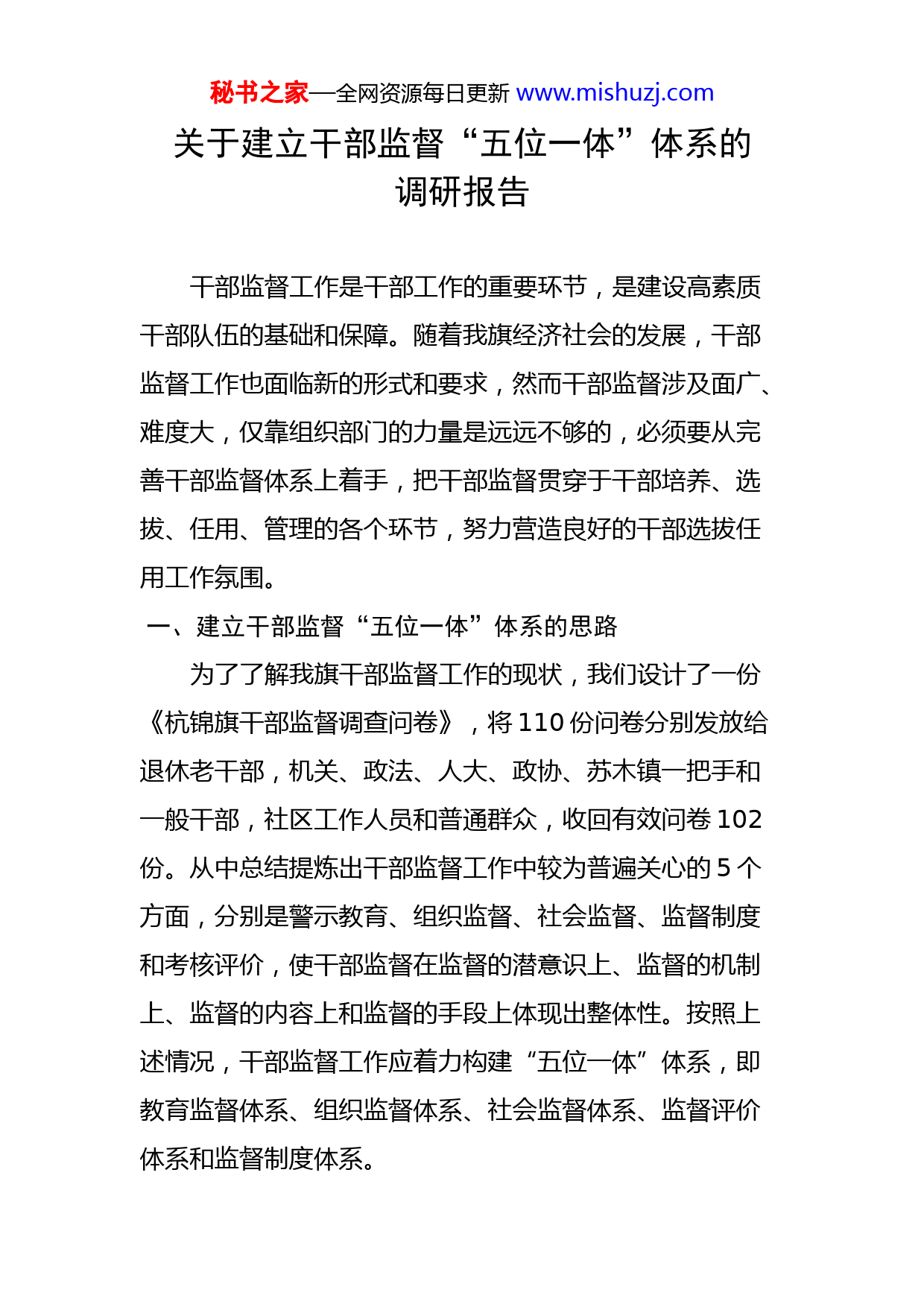 秘书之家—全网资源每日更新www.mishuzj.com关于建立干部监督“五位一体”体系的调研报告干部监督工作是干部工作的重要环节,是建设高素质干部队伍的基础和保障。随着我旗经济社会的发展,干部监督工作也面临新的形式和要求,然而干部监督涉及面广、难度大,仅靠组织部门的力量是远远不够的,必须要从完善干部监督体系上着手,把干部监督贯穿于干部培养、选拔、任用、管理的各个环节,努力营造良好的干部选拔任用工作氛围。一、建立干部监督“五位一体”体系的思路为了了解我旗干部监督工作的现状,我们设计了一份《杭锦旗干部监督调查问卷》,将110份问卷分别发放给退休老干部,机关、政法、人大、政协、苏木镇一把手和一般干部,社区工作人员和普通群众,收回有效问卷102份。从中总结提炼出干部监督工作中较为普遍关心的5个方面,分别是警示教育、组织监督、社会监督、监督制度和考核评价,使干部监督在监督的潜意识上、监督的机制上、监督的内容上和监督的手段上体现出整体性。按照上述情况,干部监督工作应着力构建“五位一体”体系,即教育监督体系、组织监督体系、社会监督体系、监督评价体系和监督制度体系。秘书之家—全网资源每日更新www.mishuzj.com教育监督体系。通过经常性的思想教育,使干部充分认识到监督管理工作的重要性和必要性,为干部监督组织体系的建立创造良好环境基础。抓好三方面工作,相关政策法规教育、警示教育、谈话教育。组织监督体系。组织部门落实干部日常监督的主体责任,充分发挥干部监督工作的正面导向和激励作用。重点抓好领导班子和领导干部的监督,对党政领导干部选拔任用工作的监督,完善干部监督工作协调配合机制,完善组织部门干部选拔任用工作的内部监督机制。社会监督体系。依靠和发动社会群众参与干部监督工作,充分发挥群众监督和舆论监督的作用。着重建立和完善舆论监督机制、社区监督机制、网络监督机制和信访举报机制。监督评价体系。建立客观公正和合理规范的干部监督评价体系,实事求是地反映和评价干部,有效地调动干部的积极性。抓好科级干部考核指标的科学设置,干部日常考核的长效机制,及考核结果的反馈应用,突出导向作用。监督制度体系。完善符合工作实际的监督制度,促进干部监督管理合理、规范、有效,建立健全完整的监督制度体系。二、建立干部监督“五位一体”体系调查情况及结果分析秘书之家—全网资源每日更新www.mishuzj.com近年来,杭锦旗从制度建设着手,不断创新方法和途径,坚持对干部严格要求、严格教育、严格管理、严格监督,干部监督工作取得了一定成效,但也不同程度存在失之于宽、失之于软的问题。现将此次调查问卷情况反馈如下,从中分析提炼干部监督工作存在的问题和不足,以便改进。(一)调查对象构成情况调查人群年龄30岁以下的占31%、30-40岁的占36%、41-50岁的占30%。其中,文化和程度大专以下的占39%、本科及以上学历占55%,党群政府部门的占38%、苏木镇(管委会)的占21%、政法信访及其他部门的占31%,科级干部占51%,中共党员占68%,基本涵盖了我旗在职干部和参与社会活动的主要人群。(二)调查结果分析1.对干部监督工作的内容和性质认识不到位。95%的人认为加强干部监督很有必要,59%的人对我旗干部监督工作总体持满意态度,但超过57%的参与者对《党政干部选拔任用工作条例》细节内容和干部监督制度不够清楚。从中反映出群众对干部监督工作的作用发挥不乐观,认为难以发挥应有的作用,给人的印象是讲起来重要,做起来难。虽然82%的人认为晋升干部职务最主要的激励是人生秘书之家—全网资源每日更新www.mishuzj.com价值,但是个别党政领导干部认为组织上对自己监督是对自己不信任,听到监督就反感。2.监督机制不具体。加强干部监督需要重点推进的工作55%的人认为应加大案件查办、惩处力度,54%的人认为要完善各项制度、加强教育培训,50%的人认为要提高制度执行力。这其中,建议建立“日常化”干部监督制度和“干部个人重大事项报告制度”的各占70%,建议建立干部经济责任审计制度的占61%。同时,57%的人认为廉政教育有很大作用,而警示教育被认为是最受欢迎也最有效的一种教育,其次是谈话提醒和先进典型教育,47%的人认为目前廉政教育存在的主要问题是缺乏针对性、走过场和时断时续。从中反映出干部监督制度机制建设中有的制度滞后,缺乏前瞻性和预见性,造成一定的后果才亡羊补牢,有的制度在实际过程中缺乏规范性,内容过于含糊,不做具体详细的规定,也缺少对执行者的有效约束。3.监督合力不强。调查问卷反映,对干部监督最直接、最有效、最现实的监督中,纪检监察部门监督占58%、下级监督占48%、媒体网络监督占46%、上级监督占45%。68%的人认为纪检监察、组织、宣传、信访、公检法等部门在干部监督中的履职作用还是很明显的,而72%的人认为影响干部监督效果的主要原因是“信息公开不够,群众不知情,无法实施有效监督”。从中可以看出,干部秘书之家—全网资源每日更新www.mishuzj.com监督主体之间在工作上的联系和联合还不够紧密,影响了监督网络整体合力的发挥。4.监督存在盲区。干部监督存在的主要不足58%的人认为是监督的死角和漏洞太多,47%的人认为是监督的力度和成效不大。79%的人