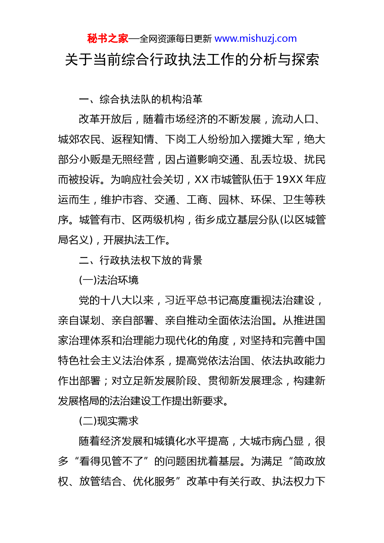 秘书之家—全网资源每日更新www.mishuzj.com关于当前综合行政执法工作的分析与探索一、综合执法队的机构沿革改革开放后,随着市场经济的不断发展,流动人口、城郊农民、返程知情、下岗工人纷纷加入摆摊大军,绝大部分小贩是无照经营,因占道影响交通、乱丢垃圾、扰民而被投诉。为响应社会关切,XX市城管队伍于19XX年应运而生,维护市容、交通、工商、园林、环保、卫生等秩序。城管有市、区两级机构,街乡成立基层分队(以区城管局名义),开展执法工作。二、行政执法权下放的背景(一)法治环境党的十八大以来,习近平总书记高度重视法治建设,亲自谋划、亲自部署、亲自推动全面依法治国。从推进国家治理体系和治理能力现代化的角度,对坚持和完善中国特色社会主义法治体系,提高党依法治国、依法执政能力作出部署;对立足新发展阶段、贯彻新发展理念,构建新发展格局的法治建设工作提出新要求。(二)现实需求随着经济发展和城镇化水平提高,大城市病凸显,很多“看得见管不了”的问题困扰着基层。为满足“简政放权、放管结合、优化服务”改革中有关行政、执法权力下秘书之家—全网资源每日更新www.mishuzj.com放给基层的实际需求,XX市深化党建引领“街乡吹哨、部门报到”改革,决定将部分行政处罚权、行政强制权下放至街道办事处和乡镇人民政府,并由其依法行使与之相关的行政检查权,实行综合执法。三、基层综合执法工作特点及挑战20XX年X月X日职权下放以来,综合行政执法队以街、乡人民政府名义开展综合执法工作。下放的执法权涉及生态环境、水务、农业农村、卫生健康部门和城管执法X个部门的XXX项。当前综合行政执法工作,主要呈现出四个特点:(一)专业性。为职权下放,“接得住、管得好”,区政府高度重视,制发了《关于街乡落实行政执法责任制的工作意见》《关于明确有关行政执法范围和执法事项的决定》和《朝阳区行政执法事项管辖规定》等工作制度。综合执法队在行政执法工作中要符合行政行为的合法要件,要遵循合法行政、合理行政、程序正当、诚实守信、高效便民、权责统一等六大原则。具体工作中,准确适用法律法规、严格依照法定程序执法,贯彻落实好《行政执法公示制度》、《执法全过程记录制度》、《重大行政执法决定法制审核制度》“三项制度”、两人执法等基本业务要求,避免引发不必要的行政复议和诉讼。秘书之家—全网资源每日更新www.mishuzj.com(二)广泛性。“上管天、下管地、中间管空气”,行政管理对象广泛。综合执法队职权由原来的XXX多项增加到现在的XXX项,辖区所有商户、住户,甚至路人都有可能成为执法对象,执法范围广泛。除执法职权外,综合执法队还承担了环境管理、生活垃圾分类管理;重大活动保障等工作。XXXX小时不间断值守;XXXXX接诉即办;违建入户;广告牌匾拆除;共享单车清运;无主垃圾清除;生活垃圾早晚高峰时段桶前值守坚持一年有余;疫情防控检查,落实辖区商户、“七小门店”检查、督导全覆盖;“六包”责任制动态走遍辖区单位等。(三)动态性。“执法工作没有完成时。”执法工作是动态的过程,新的违法行为会随时、随地,偶然发生。而且,行政处罚行为作出的环节有时限要求,违法行为自发现起XX小时内立案,作出行政处罚决定X日内信息公开等。例如某小区昨天秩序良好,今天可能有人新建违法建设,综合执法队应建立日常巡查制度,居(村)委会、业主委员会、物业管理委员会、物业服务人员,发现辖区内有违法建设的,应予以劝阻,并报告综合执法队。新的违法行为不断出现,仅靠执法队巡查,很容易产生无效的重复劳动、浪费执法成本。秘书之家—全网资源每日更新www.mishuzj.com三、当前面临的有利条件和不利因素(一)有利条件一是法治环境逐渐提升。朝阳区政府高度重视法治工作。20XX年,XX区成功获评全国首批法治政府建设示范地区。法治政府建设围绕全区中心工作进一步加强法治政府建设,夯实基层执法基础,深化政务服务机制,为执法工作提供了良好支撑。领导干部带头尊法守法学法用法,全民守法的氛围开始形成,为执法工作提供了良好环境。二是执法要求愈发明确。职权下放以来,综合执法队以街乡名义执法,职权和依据比较明确,便于执法。2021年X月XX日,新《行政处罚法》正式施行,为街乡综合执法工作提供了明确的法律支撑。同时,对执法工作提出了明确要求。如《行政处罚法》明确规定,调查或检查时的执法人员不得少于X人。执法人员应主动出示执法证件。对执法全过程记录、执法证据收集、信息公开和重大法审也作出明确要求。三是基层治理模式引领。东风地区“XXXXXX”基层治理模式,先进、明确、有高度,对基层全面工作都有非常好的引领作用。综合执法队统一“根本在人,关键在认识,核心在思想”的认知,紧密围绕着东风乡发展大局,发扬自我革命精神,系统学习新的文件、法规,全面提升自身能力,以事业为己任、勤奋思考并努力做好本职工作。队员们充分发扬“三主精神”,落实主秘书之家—全网资源每日更新www.mishuzj.com体责任、积极主动参与、营造主人感觉,以“接诉即办”工作为载体,发现问题在基层,解决问题在机关。与乡党委和地区人民同心、同向、同力、同步地建设新东风、稳东风、美东风、福东风、暖东风。(二)不利因素一是处
