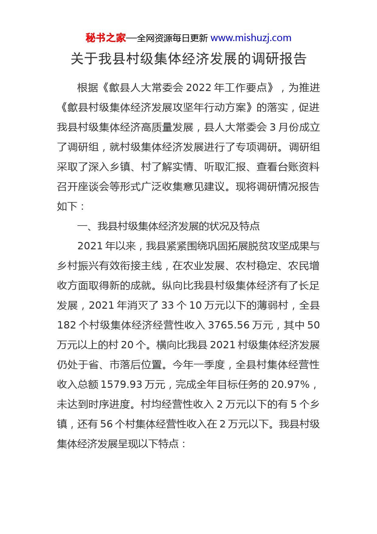 秘书之家—全网资源每日更新www.mishuzj.com关于我县村级集体经济发展的调研报告根据《歙县人大常委会2022年工作要点》,为推进《歙县村级集体经济发展攻坚年行动方案》的落实,促进我县村级集体经济高质量发展,县人大常委会3月份成立了调研组,就村级集体经济发展进行了专项调研。调研组采取了深入乡镇、村了解实情、听取汇报、查看台账资料召开座谈会等形式广泛收集意见建议。现将调研情况报告如下:一、我县村级集体经济发展的状况及特点2021年以来,我县紧紧围绕巩固拓展脱贫攻坚成果与乡村振兴有效衔接主线,在农业发展、农村稳定、农民增收方面取得新的成就。纵向比我县村级集体经济有了长足发展,2021年消灭了33个10万元以下的薄弱村,全县182个村级集体经济经营性收入3765.56万元,其中50万元以上的村20个。横向比我县2021村级集体经济发展仍处于省、市落后位置。今年一季度,全县村集体经营性收入总额1579.93万元,完成全年目标任务的20.97%,未达到时序进度。村均经营性收入2万元以下的有5个乡镇,还有56个村集体经营性收入在2万元以下。我县村级集体经济发展呈现以下特点:秘书之家—全网资源每日更新www.mishuzj.com(一)总量偏低。全县村集体经营性收入总量3年来每年都在3000万元左右徘徊。2021年,我县徽城镇七川村集体经营性收入为138.61万元,居全县村级集体经济收入第一。同期,徽州区广惠村高达2600万元,黟县西递、宏村门票分红也达2000多万元。2021年我县村均经营性收入首次突破20万元达到20.69万元,但仅为全市村均的50%,低于全市平均水平39.78万元的村有161个。(二)结构失衡。2021年村集体经营性收入百万元以上只有3个村,20万元以下的村142个,占78%。全年村集体一次性经营收入1492.55万元,占39.64%;可持续收入2273万元,占60.36%,收入笔数多,数额小,而且稳定性不高。(三)来源单一。全县大部分村集体经营性收入还是停留在村集体公房出租,山场、园地发包等传统方式,缺少新渠道、新途径、新业态,没有新的增长点。2021年涉及24个乡镇50个村的集体经营性收入出现严重下滑,仅为297.48万元。二、我县村级集体经济发展存在的困难和问题(一)发展环境不优。客观上我县实行农村家庭联产承包责任制过程中,大部分乡村对集体资产分得比较彻底乡村集体企业均已改制。发展村集体经济的环境改变了,发展集体经济的意识被淡化了。目前,全县五分之一的村秘书之家—全网资源每日更新www.mishuzj.com几乎没有可以利用的资源和资产;少数村也存在处置村集体资产程序不规范,产权不明晰等情况。另一方面不具区位优势的部分村集体土地、山林和集体房产利用价值低,交通不便,开发成本高,见效周期长,难以带来即期收入随着城镇化发展,目前我县村多基数大,村域人口规模不平衡。据第七次人口普查数据,我县182个行政村中常住人口千人以下的有68个村占40.48%,其中常住人口500人以下近20个行政村,且常住人口中大多数为60岁以上的老人。而实际情况更为严重,村庄空心化、村民老龄化人口数量减少趋势在不断加快。杞梓里镇最具代表性:全镇16个村其中“三无”村(无资源、无资产、无资金)3个,常住人口在1000人以下有11个村占68.75%,其中500人以下的村4个占25%。霞坑镇石潭村户籍人口4500多人,在疫情防控入户逐人核酸检测中,实际在家只有800多人仅占17.78%,其中60岁以上的600余人占在家人口的75%。乡村振兴任重道远,村集体经济发展同样面临严峻的形势。(二)“堡垒作用”不强。一是少数村两委干部对发展村集体经济站位不高,动能不足。停留在“要我发展”,而不是“我要发展”。只满足应付日常的工作,对本村的发展优势把握不够全面,无法根据本村特点制定出相应发展集体经济的对策。二是“等、靠、要”依赖思想严重。秘书之家—全网资源每日更新www.mishuzj.com缺乏敢想敢为的勇气和魄力,瞻前顾后,认为发展村集体经济有风险,不敢担当,等政策、靠帮扶、要钱物。考核时想方设法应付完成任务。三是只顾眼前利益,缺乏长远规划。少数村两委班子成员缺乏远见,只考虑当前利益,“守住家业”,集体资产一包了之,村集体经济经营性收入虚高。(三)发展氛围不浓。现在村民个人发家致富的愿望十分强烈。不少村民集体意识十分淡薄,参与发展集体经济的热情不高。少数农村党员、能人不愿意参选村两委干部,也不愿意参与发展集体经济,还担风险。乡镇统筹协调能力不强,缺少系统谋划,存在“年初下目标,年底抓统计”的问题。少数干部未能真正把发展村集体经济当作本职工作用心用力去对待。少数县直涉农部门缺少主动参与村级集体经济发展工作的意识,存在多一事不如少一事思想。金融部门在支持村集体经济发展上步子不快,对村集体经营性项目信贷的投放力度不大。(四)发展手段不多。党中央十分重视农村发展问题,大力提倡发展农村集体经济。中央层面往往给予指导性、原则性、方向性的指导,但在乡镇村更需要的是有力的、具体的、可操作的扶持政策和优惠措施。目前尚未出台与发展集体经济相关的配套法律,导致村集体经济发展优惠措施不多,扶持政策不足,规范指导不够。各地做法也是秘书之家—全网资源每日更新www.mishuzj.com各显神通,执行标准各取所需。目前我县乡镇、村虽然都已成立股份经济合作社、振兴公司、强村公司