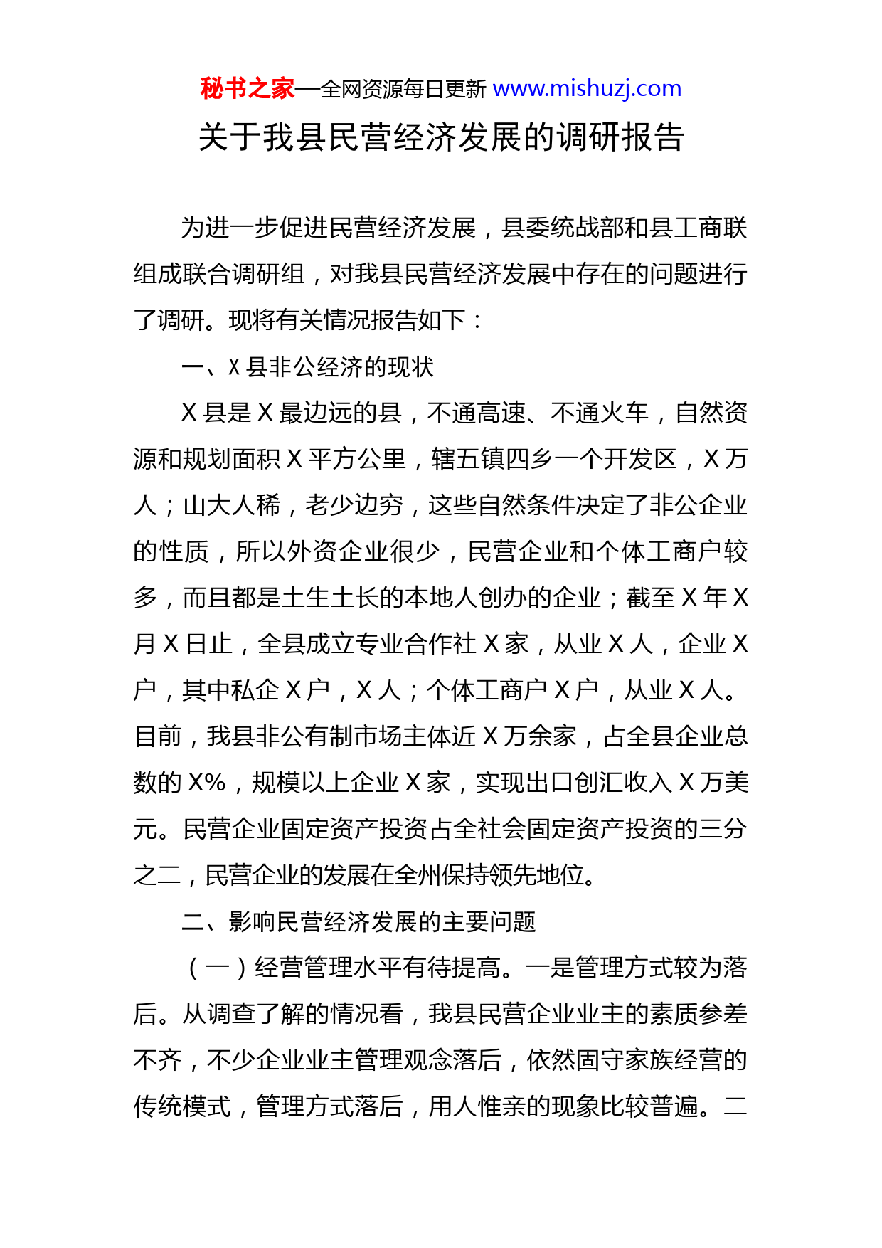 秘书之家—全网资源每日更新www.mishuzj.com关于我县民营经济发展的调研报告为进一步促进民营经济发展,县委统战部和县工商联组成联合调研组,对我县民营经济发展中存在的问题进行了调研。现将有关情况报告如下:一、X县非公经济的现状X县是X最边远的县,不通高速、不通火车,自然资源和规划面积X平方公里,辖五镇四乡一个开发区,X万人;山大人稀,老少边穷,这些自然条件决定了非公企业的性质,所以外资企业很少,民营企业和个体工商户较多,而且都是土生土长的本地人创办的企业;截至X年X月X日止,全县成立专业合作社X家,从业X人,企业X户,其中私企X户,X人;个体工商户X户,从业X人。目前,我县非公有制市场主体近X万余家,占全县企业总数的X%,规模以上企业X家,实现出口创汇收入X万美元。民营企业固定资产投资占全社会固定资产投资的三分之二,民营企业的发展在全州保持领先地位。二、影响民营经济发展的主要问题(一)经营管理水平有待提高。一是管理方式较为落后。从调查了解的情况看,我县民营企业业主的素质参差不齐,不少企业业主管理观念落后,依然固守家族经营的传统模式,管理方式落后,用人惟亲的现象比较普遍。二秘书之家—全网资源每日更新www.mishuzj.com是管理水平不高。部分民营企业缺乏战略思维,不注重品牌建设,市场开拓和产品开发能力不强,产品科技含量低、市场竞争力弱,企业“生得早,长不大”的现象比较突出。三是企业发展的内生动力不足。部分企业业主存在小富即安的思想,加之我县民营企业业主大多是本土人士,地域观念和排外思想较浓,“走出去”、“引进来”的愿望都不很强烈,影响了企业做大做强。(二)人才技术方面短板较多。从调查情况看,在人才方面,由于我县民营企业内部的家族式管理机制,以及区位条件较差,生活条件艰苦,经济待遇较低等原因,民营企业人才引进难度较大,企业管理人员中高学历、高职称、高技能的人才严重不足,复合型的管理人才更是少之又少。在生产技术和产品科技含量方面,由于专业技术人员严重不足,新技术、新产品的研发,新技术的应用与推广相对落后,产品技术含量低,品牌建设落后,产品同质化问题十分突出,企业市场竞争力不强,经济效益不高。(三)融资难问题仍十分突出。近年来,我县通过做实融资性担保机构,召开银企对结会,开展“助保贷”、“政银集合贷”风险补偿资金贷款等措施,民营企业融资问题有所改善,但融资难仍是民营企业反映最为突出的问题。如齐云春茶业有限公司,该公司X年计划投资X万元完成X平方米精制茶车间和X平方米包装车间设备技术改秘书之家—全网资源每日更新www.mishuzj.com良以及购置自动化包装生产线等项目,加上生产流动资金X万元,资金总需求为X万元,由于财政扶持企业的X万元调度资金今年收回后没有再发放,加之政府招商时承诺的X-X万元农业综合开发发展扶持资金一直没有到位,目前公司通过自有资金完成包装车间标准化建设与改造等工程后,资金缺口达X万元,而争取到的银行贷款只有邮政银行的新型农业小额信贷资金X万元(正在办理相关手续,能否审批还不得而知),相关设备拉不回来,生产经营活动无法正常开展,融资难已严重影响到企业的生产经营。据了解,有部分企业因资信和缺少抵押等原因无法获得银行支持,不得已转向民间借贷,甚至吸收民间高利贷,结果生产成本越来越高,有的硬着头皮经营,经营越多亏得越多,最后走向破产。我县民营企业融资难的主要原因,一是企业自身可抵押的资产少或信用度不高,不能满足银行方面的要求。二是部分企业因历史等原因,资产未进行登记办证,进而无法进行资产评估与抵押。三是金融机构出于经营风险和经营效率考虑,在金融产品定位和客户选择上,与我县民营经济发展水平还存在一定差距。(四)发展氛围需要进一步增强。从调查的情况看,一是民营企业普遍反映现在党委政府抓民营经济的力度不如前些年,更不如现在抓的党建等工作,各级各部门领导到民营企业调研与协调工作的次数有所减少。二是党委政秘书之家—全网资源每日更新www.mishuzj.com府的报告、文件、会议等,研究和强调民营经济的相对减少,全社会对民营经济的关注度有所下降。三是由于上述等原因,部分民营企业产生了一定的失落感,自我发展和加快发展的信心与动力不足,干事创业的氛围不浓。(五)办证问题有待彻底解决。由于历史等方面的原因,我县有部分民营企业存在审批手续不全等问题,造成企业在目前政策条件下难以办理产权登记等方面的手续,进而影响到企业资产评估、投融资、项目申报和政策争取等工作。办证难问题得到县委、县政府高度重视,不仅召开专题会议研究,而且还出台了《县人民政府办公室关于印发<X县解决分部企业不动产登记有关遗留问题工作方案>的通知》。今年X月,县经信局牵头,协调自然资源和规划、住建、消防、不动产中心等多个部门到相关企业现场查看,并根据企业的实际情况提出了办理不动产登记相关方案。截止X月底,已为X等企业办理了不动产登记。X等X家已经报批国有土地的企业的不动产登记正在办理过程中,X等X家企业正在开展国有土地的报批。解决办证难工作虽然取得了明显成效,但问题仍未彻底解决,下余的工作量还较大,与企业的现实需求还有一定差距。三、加快民营经济发展