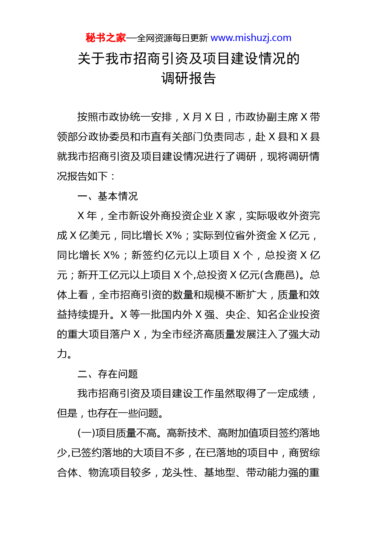 秘书之家—全网资源每日更新www.mishuzj.com关于我市招商引资及项目建设情况的调研报告按照市政协统一安排,X月X日,市政协副主席X带领部分政协委员和市直有关部门负责同志,赴X县和X县就我市招商引资及项目建设情况进行了调研,现将调研情况报告如下:一、基本情况X年,全市新设外商投资企业X家,实际吸收外资完成X亿美元,同比增长X%;实际到位省外资金X亿元,同比增长X%;新签约亿元以上项目X个,总投资X亿元;新开工亿元以上项目X个,总投资X亿元(含鹿邑)。总体上看,全市招商引资的数量和规模不断扩大,质量和效益持续提升。X等一批国内外X强、央企、知名企业投资的重大项目落户X,为全市经济高质量发展注入了强大动力。二、存在问题我市招商引资及项目建设工作虽然取得了一定成绩,但是,也存在一些问题。(一)项目质量不高。高新技术、高附加值项目签约落地少,已签约落地的大项目不多,在已落地的项目中,商贸综合体、物流项目较多,龙头性、基地型、带动能力强的重秘书之家—全网资源每日更新www.mishuzj.com大产业项目较少,外资项目更少,对经济的支撑和拉动作用不足。(二)工作进展不平衡。各县(市、区)招商引资及项目建设工作参差不齐,个别县(市、区)由于脱贫攻坚、环保攻坚等任务繁重,精力分配不均,招商力量薄弱,主动走出去、请进来不够,招商效果不明显。(三)方式方法有待创新。传统的招商方式多,现代招商方式少;会议招商多,专业招商少;土地招商多,产业招商少。意向项目信息质量不高,科学有效的招商信息捕捉网络亟待建立。招商目标需进一步明确,围绕主导产业和特色产业进行对口招商需协商议政助发展进一步加强,优良的生态环境资源优势还需进一步转化成招商比较优势。(四)产业链还不完善。我市工业基础相对薄弱,产业链配套加工能力不强。大部分产业上下游配套条件不够完备,没有形成产业集聚的优势,招商引资需要的地理空间上相对集中和关联产业的分工协作群还未形成。(五)体制机制尚不健全。招商引资一体化推进机制有待进一步健全,招商队伍建设管理机制有待进一步优化,招商引资考核奖惩机制有待进一步完善,招商引资服务保障机制有待进一步落实。(六)环境有待进一步优化。一是硬环境不够完善。个别县(市、区)基础设施建设不足,配套设施建设滞后,对产秘书之家—全网资源每日更新www.mishuzj.com业、资金、人才的吸引力不强。此外,一些县(市、区)土地储备量不足,项目建设用地指标有限,土地征用困难,影响项目落地。二是软环境需进一步优化。“放管服”改革不够到位,个别职能部门缺乏大局观,办事效率不高,表现为重签约轻落地,跟踪服务不到位,承诺落实不到位。三、意见建议(一)凝神聚力,强化开放招商。在经济全球化和经济下行压力依然存在的大背景下,要加快X发展,实现全面建成小康社会,就必须坚定不移的实施开放带动主战略,采取强有力的措施,切实把招商引资及项目建设工作放在心上、抓在手上,加压驱动,实现常态化、制度化、规范化,为全市经济高质量发展提供强大动力。(二)突出实效,提升项目质量。实施“招商引资提升年”活动,坚持大招商、招大商,重点抓好外资项目、出口型项目、龙头企业和重大项目招商,瞄准国内外X强企业、央企等与我市主导产业关联度高的企业,精准对接项目,把实效性和针对性放在首位,提高项目的成熟度和可行性。加大对外宣传,强化X发展优势,推进招商引资到招商选资转变,抓住产业链中关键环节招商,达到引进一个项目、带动一个产业的目的。(三)因地制宜,延伸产业链条。突出招商重点,有针对性的延长产业链。围绕打造“满城文化半城水、内联外通秘书之家—全网资源每日更新www.mishuzj.com达江海”的中原港城的发展定位,把临港经济作为招商重点,将长三角、珠三角和京津冀等产业发达地区作为招商引资的重点区域,围绕我市六大主导产业,编制产业招商图谱和招商线路图,把产业链招商作为主攻方向,突出补链、延链、强链,增强配套能力,打造产业集群,优化产业结构,促进产业升级。(四)解放思想,创新方式方法。开展以商招商、亲情招商、产业招商、专业招商、小分队招商、专题推介会招商、小型“圆桌式”招商,实现从全民招商转变为专业招商、从粗放招商转变为精细招商、从盲目招商转变为目标招商、从政策招商转变为环境招商,把招商引资和招才引智结合起来,提高招商项目的“对接率”和“成功率”。用足用好用活国家、省、市出台的一系列鼓励性政策,做好项目对接,不断扩大有效投资。建立健全我市招商信息共享平台,充分利用“互联网+”,拓宽信息渠道,推进项目落地。(五)长效推进,完善工作机制。一是完善招商引资一体化推进机制,构建一体化招商格局,促进招商引资工作提质增效。二是完善招商队伍建设管理机制。将德才兼备、熟悉经济、了解政策的干部,选配到招商引资工作第一线,注重招商人员培养,邀请专家、学者定期授课或组织人员外出考察学习,不断提高招商队伍的素质和能力。三秘书之家—全网资源每日更新www.mishuzj.com是完善招商引资考核评价机制。将签约项目落地率、年度固定资产投资额、带动就业、增加税收等作为考核标准,确保招商引资项目实现“企业有利润、政府有税收、社会有就业、环境有改善”的目标