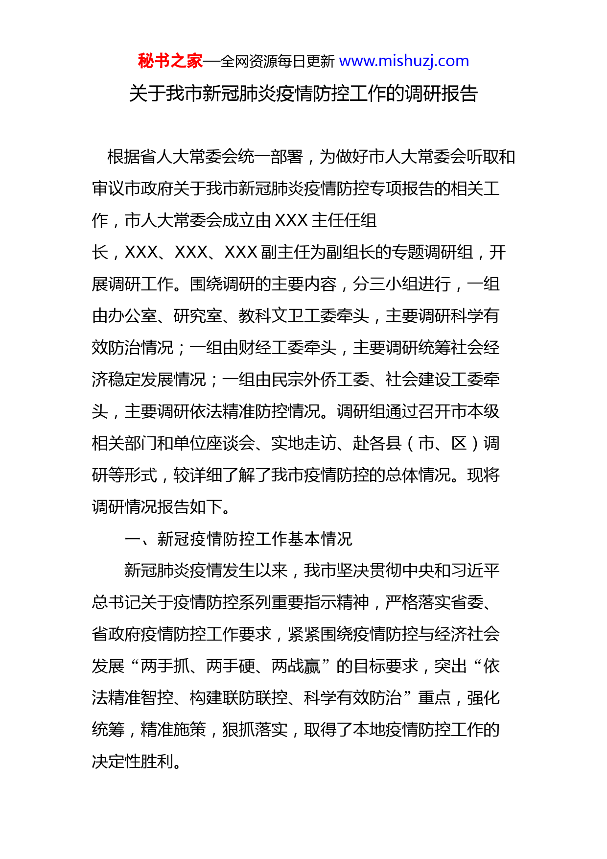 秘书之家—全网资源每日更新www.mishuzj.com关于我市新冠肺炎疫情防控工作的调研报告根据省人大常委会统一部署,为做好市人大常委会听取和审议市政府关于我市新冠肺炎疫情防控专项报告的相关工作,市人大常委会成立由XXX主任任组长,XXX、XXX、XXX副主任为副组长的专题调研组,开展调研工作。围绕调研的主要内容,分三小组进行,一组由办公室、研究室、教科文卫工委牵头,主要调研科学有效防治情况;一组由财经工委牵头,主要调研统筹社会经济稳定发展情况;一组由民宗外侨工委、社会建设工委牵头,主要调研依法精准防控情况。调研组通过召开市本级相关部门和单位座谈会、实地走访、赴各县(市、区)调研等形式,较详细了解了我市疫情防控的总体情况。现将调研情况报告如下。一、新冠疫情防控工作基本情况新冠肺炎疫情发生以来,我市坚决贯彻中央和习近平总书记关于疫情防控系列重要指示精神,严格落实省委、省政府疫情防控工作要求,紧紧围绕疫情防控与经济社会发展“两手抓、两手硬、两战赢”的目标要求,突出“依法精准智控、构建联防联控、科学有效防治”重点,强化统筹,精准施策,狠抓落实,取得了本地疫情防控工作的决定性胜利。秘书之家—全网资源每日更新www.mishuzj.com(一)组织领导坚强有力。第一时间进入战时状态,成立由市委书记、市长担任双组长的疫情防控工作领导小组,XX位市领导担任副组长。领导小组下设指挥部,建立X个工作组,全部实体化办公,统筹协调全市疫情防控工作。各县(市、区)上下联动,全部成立领导小组和指挥部。全面贯彻落实省人大《关于依法全力做好当前新型冠状病毒感染肺炎疫情防控工作的决定》要求,严格履行属地管理职责,市、县、乡、村四级层层签订责任书,织密织紧防控网。市人大常委会第一时间下发通知,要求压紧压实疫情防控工作责任,号召各级人大机关和各级人大代表积极行动起来,为疫情防控工作贡献人大力量。(二)筑牢防线精密有形。健全“一图一码一指数”精密智控机制,采用“五色图”进行区域疫情风险评估,实行分区分级防控,科学统筹疫情防控和复工复产。健全完善“健康码”通行查验机制,全民申领、凭码通行。开发“四色预警”系统,全力加强重点人群分类管控,不留盲区死角。采取“大数据+网格化”管理手段,运用“基层党建+社会治理”模式,构建社区疫情防控网格体系。实施“三类三色”管理模式,根据基层实际分别按绿色、蓝色、橙色分类分级落实管控措施,守牢疫情防控最小防控单元。把握“外防输入、内防扩散”要求,排查更加细致、管控更加精准,做好全流程管理工作闭环,排除潜在秘书之家—全网资源每日更新www.mishuzj.com风险。及时发布疫情权威信息,主动回应社会关切,做到依法公开透明。(三)救治诊疗科学有效。严格按照“集中病例、集中专家、集中资源、集中救治”的原则,完善救治网络和机制。坚持“应收尽收、应治尽治”,实行XX小时值守和发热门诊日报告制度,严格筛查疑似病人,确诊后立即由市中心医院与XX、XX、XX定点医院收治。市级层面实施医疗救治专家组对所有病例实行一个专班、一套方案的救治模式。优化核酸检测流程,实验室XX小时接收病例标本,确保在最短时间得出检测结果。深化全链条溯源排查,在报告检测阳性病例后,第一时间开展流行病学调查、做好阳性病例常出现区域消杀。利用好大数据信息化手段,及时核查疑似病例、密切接触人员、发热人员基本信息和活动分布。积极选派XXX名医务、疾控人员赴湖北、武汉参与疫情防控。(四)统筹保障发展有为。精准施策推动企业复工复产,出台《XX市大力实施减税减费减租减息减支共克时艰行动方案》,加大金融财政支持力度,促进企业降本减负。加强监管保障社会经济秩序,疫情以来全市市场总体保持平稳,重要民生商品、防疫用品价格相对稳定。强化防疫防护物资生产和生活物资供应保障。有力打击疫情期间制售假冒伪劣医护用品、虚假宣传误导消费者、哄抬价秘书之家—全网资源每日更新www.mishuzj.com格等违法行为。高效推行政务服务“不见面”办理模式,在全省率先推出XX市“五减”政策通平台,全省首创“企业开办移动钉钉审”。积极引导零售企业线上突围,办好“网上菜场”“网上超市”等电商服务模式。完善突发公共事件舆论引导和处置,确保面上舆情平稳。建立疫情期间心理干预工作组织机构、队伍,开展群众心理健康服务。二、存在的主要问题这次新冠肺炎疫情是新中国成立以来传播速度最快、感染范围最广、防控难度最大的重大突发公共卫生事件。虽然我市目前在依法精准有效防控疫情工作中主动作为、举措得力、成效较为突出,但在面临这场没有模拟考的突击大考过程中,也暴露了不少问题和短板。(一)依法精准防控方面X.公共卫生应急指挥体系不健全。一是公共卫生应急指挥中心未建立。全市未建立公共卫生应急指挥中心,此次疫情防控初期,曾出现指挥部架构多次调整,存在指挥层级不清、多头指挥、政令不畅和信息滞后等现象,导致各部门协同配合不同步,各级接收指令不一致,指令末端落实不到位,各类信息出现多头上报、重复汇总的问题,在一定程度上影响指挥效能。二是公共卫生应急联动机制不完善。此次疫情防控工作之前,虽已建立公共卫生