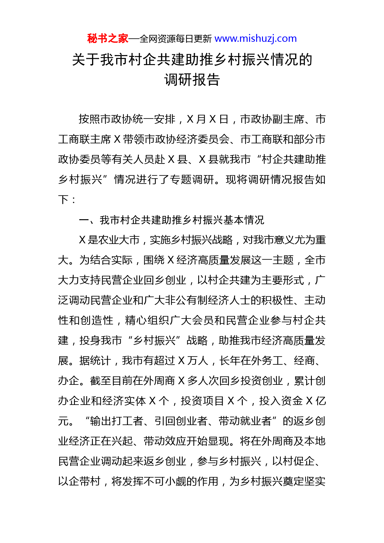 秘书之家—全网资源每日更新www.mishuzj.com关于我市村企共建助推乡村振兴情况的调研报告按照市政协统一安排,X月X日,市政协副主席、市工商联主席X带领市政协经济委员会、市工商联和部分市政协委员等有关人员赴X县、X县就我市“村企共建助推乡村振兴”情况进行了专题调研。现将调研情况报告如下:一、我市村企共建助推乡村振兴基本情况X是农业大市,实施乡村振兴战略,对我市意义尤为重大。为结合实际,围绕X经济高质量发展这一主题,全市大力支持民营企业回乡创业,以村企共建为主要形式,广泛调动民营企业和广大非公有制经济人士的积极性、主动性和创造性,精心组织广大会员和民营企业参与村企共建,投身我市“乡村振兴”战略,助推我市经济高质量发展。据统计,我市有超过X万人,长年在外务工、经商、办企。截至目前在外周商X多人次回乡投资创业,累计创办企业和经济实体X个,投资项目X个,投入资金X亿元。“输出打工者、引回创业者、带动就业者”的返乡创业经济正在兴起、带动效应开始显现。将在外周商及本地民营企业调动起来返乡创业,参与乡村振兴,以村促企、以企带村,将发挥不可小觑的作用,为乡村振兴奠定坚实秘书之家—全网资源每日更新www.mishuzj.com基础。除对X、X两县进行专题调研外,我们还通过座谈、走访等形式对其他县(市、区)“村企共建助推乡村振兴”情况进行了广泛了解,全市各县(市、区)以工业企业带动型、特设产业带动型、畜牧养殖带动型、休闲产业带动型、商贸流通带动型、旅游产业带动型、合作组织带动型、劳务经济带动型等模式,因地制宜,结合自身实际,进行大胆积极的探索,全市的这项工作充满了生机和活力。二、存在问题综合分析我市“村企共建助推乡村振兴”工作实际情况,我们认为还存在如下两个方面的问题:一是相关政策机制不够完善,原来较为分散政策资源没有理顺,共建村与企业之间的关系不够明晰,村企双方的信任和约束机制有待完善;二是共建企业资金不充分。由于民营企业参与共建资金压力大,有些项目前期资金投入大、周期长、见效慢,协商议政助发展资金回笼慢,有些民营企业本身资金不足又很难获得银行贷款支持,因此共建企业在资金上存在较大缺口,一定程度上影响了企业参与乡村建设的积极性。三、意见建议(一)村企共建要突出党建引领。一是选优配强村班子和基层支部班子,把村班子和基层党支部建成带动村民致富的“战斗堡垒”和“尖刀班”,以高质量党建推进乡村振秘书之家—全网资源每日更新www.mishuzj.com兴。二是充分发挥基层党组织建设的引领带动作用。通过把基层党支部建在村小组,建在企业,建在生产合作社,以党建带工建、带团建、带社会综合治理、带精神文明建设。三是提升村企双方的党建工作总体水平。鼓励村企互派党员兼职,实行“双向介入、交叉任职”,村企共同开展主题党日、文体活动、党员志愿服务等活动,以党建推动村企双向融入,融洽村企关系。四是充分发挥党员在乡村治理中的先锋模范作用,带动群众积极参与村企共建,增强党员的服务意识、提高党员的凝聚力和战斗力,从而进一步提高基层党组织的影响力、凝聚力。(二)村企共建要建立长效机制。村企共建作为引导民营企业参与乡村振兴工作新模式,需要激发造血功能,才能建立长效机制。一是注重产业帮扶,拓宽增收就业渠道。实施乡村振兴战略,产业兴旺是重点。以产业连结农业,通过拓展“村企共建”的深度和广度,以村促企、以企带村。实现产业带村、技术帮扶、安置就业、劳务助村、帮助创业、资金帮扶等多模式并举,有效促进农村经济发展和农民增收。二是注重基础设施投入,改善生产生活环境。引导民营企业有针对性地开展帮建,特别是在教育、卫生、道路、农田设施等方面给予具体的帮助和支持,切实改善农民的生产生活条件。三是注重政策支持,增添企业创业活力。要为鼓励引导民营企业返乡创业提供制度保秘书之家—全网资源每日更新www.mishuzj.com障,通过优化创业服务、落实创业政策、加强创业培训,为返乡创业人员搭建良好创业载体;建立鼓励、支持民营企业参与乡村振兴的长效机制,在财政、金融、税务、用地、人才、科技等方面给予集中支持;加强与有关职能部门沟通联系,明确农委、扶贫、林业、商务、旅游等部门加强对帮村企业的扶持力度,提供政策、项目、资金、信息等方面的集中服务,让企业在帮村的同时不断壮大自身发展,实现村企双赢、村民共富。(三)村企共建要营造宽松平台。一是要以点带面,带动示范指导。根据我市的探索和实践,结合现有的企业家任村官,支持村企共建的典型代表,建立村企共建示范点,以示范引领作用带动更多的社会资源涌入农村,参与村企共建、乡村振兴战略。通过建立示范点,培植有特色、有影响、有推广价值的典型村企共建点,为全面开展“村企共建”工作提供示范、树立标杆。二是营造环境,提升服务能力。持续优化营商环境,打造高效便捷的政务环境,进一步释放市场活力;加强与企业沟通,建立常态化机制,定期举办企业服务日等活动,积极协调解决帮村企业在生产经营过程中遇到的困难和问题。三是加大宣传,深化教育引导。通过采取多种形式的教育引导,使民营企业充分认识到中央关于乡村振兴战略部署的重大