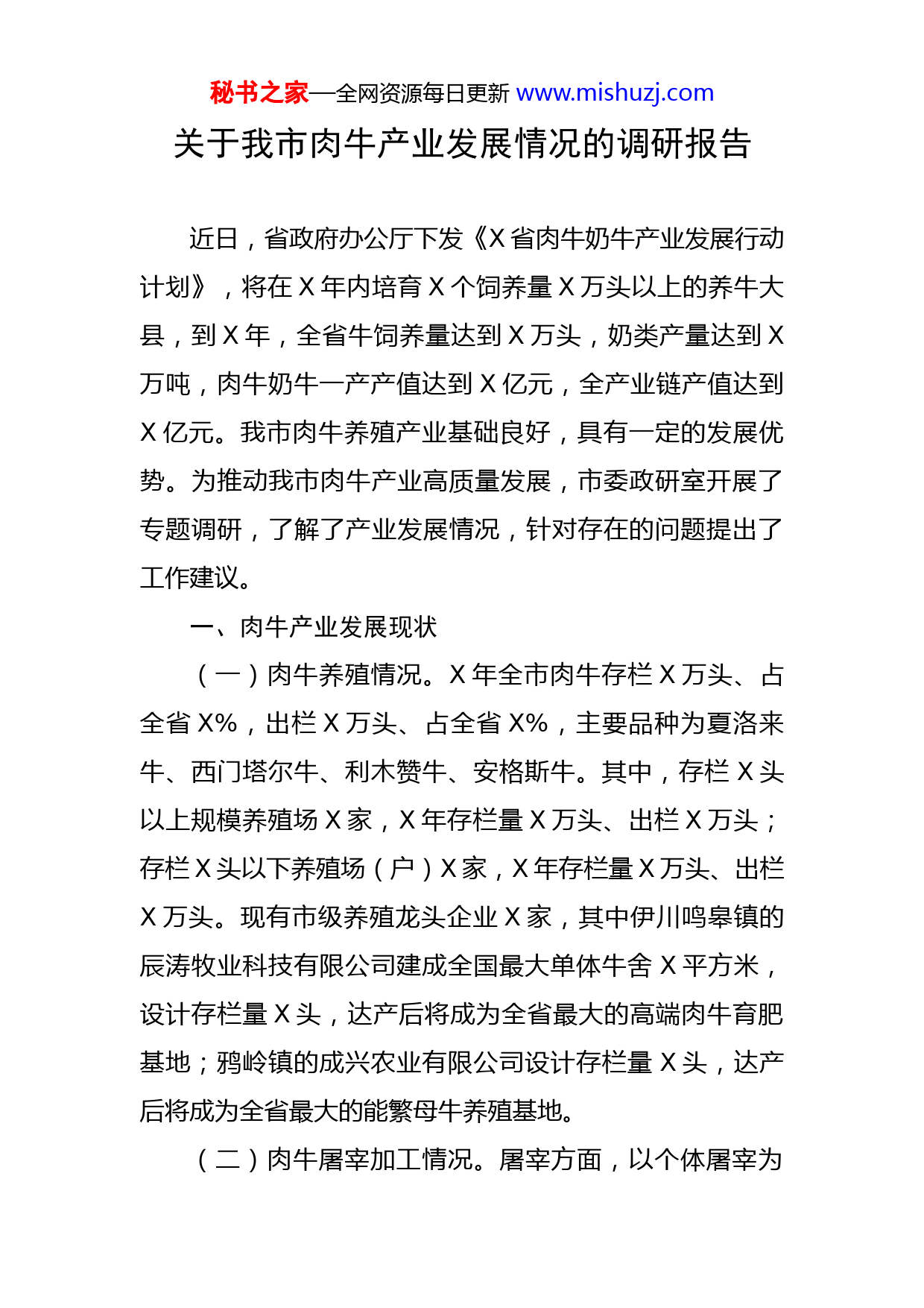 秘书之家—全网资源每日更新www.mishuzj.com关于我市肉牛产业发展情况的调研报告近日,省政府办公厅下发《X省肉牛奶牛产业发展行动计划》,将在X年内培育X个饲养量X万头以上的养牛大县,到X年,全省牛饲养量达到X万头,奶类产量达到X万吨,肉牛奶牛一产产值达到X亿元,全产业链产值达到X亿元。我市肉牛养殖产业基础良好,具有一定的发展优势。为推动我市肉牛产业高质量发展,市委政研室开展了专题调研,了解了产业发展情况,针对存在的问题提出了工作建议。一、肉牛产业发展现状(一)肉牛养殖情况。X年全市肉牛存栏X万头、占全省X%,出栏X万头、占全省X%,主要品种为夏洛来牛、西门塔尔牛、利木赞牛、安格斯牛。其中,存栏X头以上规模养殖场X家,X年存栏量X万头、出栏X万头;存栏X头以下养殖场(户)X家,X年存栏量X万头、出栏X万头。现有市级养殖龙头企业X家,其中伊川鸣皋镇的辰涛牧业科技有限公司建成全国最大单体牛舍X平方米,设计存栏量X头,达产后将成为全省最大的高端肉牛育肥基地;鸦岭镇的成兴农业有限公司设计存栏量X头,达产后将成为全省最大的能繁母牛养殖基地。(二)肉牛屠宰加工情况。屠宰方面,以个体屠宰为秘书之家—全网资源每日更新www.mishuzj.com主,X年瀍河区建成蒙原牧业有限公司,设计年屠宰能力X万头,目前仍处于发展初期,日屠宰量不高。加工方面,产品主要是未经处理的热鲜肉、冷冻肉和少量熟食,全市尚无大型肉牛加工企业。(三)肉牛流通情况。规模以上肉牛养殖场一般有固定销售渠道,规模以下养殖场一般根据市场行情、通过经纪人或交易市场自销。现有规模肉牛交易市场X个,即嵩县闫庄黄牛交易市场,发起于解放初期,占地X余亩,有经纪人X名、管理人员X名、运输等其他相关从业者X名,每年大约交易X万头肉牛、交易额X亿元,辐射西北、东北、西南等多个省份,是我省最大、国内知名的交易市场。(四)发展优势。产业基础较好。我市肉牛养殖规模一直位于全省前列,群众养牛历史悠久,具有一定的养殖经验。在脱贫攻坚期间,肉牛产业得到了进一步发展。饲草饲料丰富。我市有天然草场X万亩、饲草产量X亿公斤,玉米种植面积X万亩、年产秸秆X亿公斤,饲料加工企业X家、年生产能力X万吨。同时,南部山区半山区大量的荒山荒坡可用于放牧,基本可实现X至X个月时间“零成本”饲养。技术力量雄厚。我市有畜牧良种繁育推广中心,前身为白马寺种牛站,是X年农业部首批建设的X家国家级种牛站之一,可为畜牧良种繁育提供冻精及技术秘书之家—全网资源每日更新www.mishuzj.com服务,公牛冻精单产量全国最高。X科技大学动物科技学院每年培养本专科毕业生X人左右。市县乡三级畜牧服务机构拥有技术人员X多人,可提供配种和疫病防控等技术服务。市场潜力巨大。目前,国内牛肉消费需求总量处于世界前列且逐年上升,但人均消费量与美国、日本等国家相比依旧较低,而且牛肉供需缺口自X年后不断扩大。据行业分析报告,X年我国牛肉供需除进口外存在近X万吨缺口,约占总需求的X%。二、存在问题一是产业规模发展慢。随着群众饮食观念的变化,牛肉成为健康消费的代表,特别是X年发生非洲猪瘟导致猪肉价格暴涨后,肉牛产业开始进入扩张期,抢占肉类消费市场份额。但是我市肉牛产业规模发展较慢,从X年起我国肉牛饲养量年均增幅达X%,而我市仅为X%。X年,我市肉牛饲养量仅占全省的X%,相当于南阳的X%。原宜阳县韩城黄牛交易市场,高峰时年交易量达X万头,后因交易量萎缩关闭。二是产业链关键环缺失。肉牛产业链的关键环节主要有饲料供应、育种、育肥、屠宰加工和流通,我市饲料供应、育种、育肥和流通环节虽有但不强,屠宰加工环节缺失,制约了产业整体发展。比如,优质的种群是肉牛产业高质量发展的基础保障,X年全市基础母牛X万头、同比秘书之家—全网资源每日更新www.mishuzj.com增长X%,数量少、增幅小,难以满足规模养殖场需求,造成我市大中型育肥场需要到内蒙、辽宁、吉林、甘肃等地购进犊牛或架子牛,由于远距离运输容易引起热应激综合征等疾病。又如,屠宰加工可以提高肉牛利用率、放大价值,我市缺乏大型屠宰加工企业,造成绝大部分肉牛活体运输到外地屠宰加工,利益大量流失。三是龙头企业带动能力弱。X年全省存栏X头以上规模养殖场有X家,而我市仅有X家。我市肉牛养殖龙头企业主要从事肉牛的育种和育肥,产业链条短、经营模式封闭、辐射带动农户少,缺乏内联农户、外联市场、引导生产、深化加工、带动产业发展的龙头企业,“龙头企业+基地+农户”的产业化经营格局尚未形成。四是专业化程度不高。目前规模以下养殖场(户),特别是散户专业培训程度偏低,习惯依赖自有经验,推广品种改良、饲料配给、精准防疫等新技术难度很大。专业化程度低导致生产效率低下,比如,规模较大的养殖场基本都采用全价日粮混合技术(TMR)、疫病防控等技术,肉牛一个月即可增重X斤左右,而散户养殖一般只能增重X至X斤。五是土地、金融等保障不够有力。土地方面,肉牛产业用地紧缺,多数养殖场缺乏养殖场地、配套青贮种植场地等生产用地。资金方面,由于规模养牛场土地多为租赁秘书之家—全网资源每日更新www.mishuzj.com性质,活体牲畜也不能作为抵押物,获得银行贷款难度较大。保险方面,针对肉牛养殖仅有中原农险一家开展