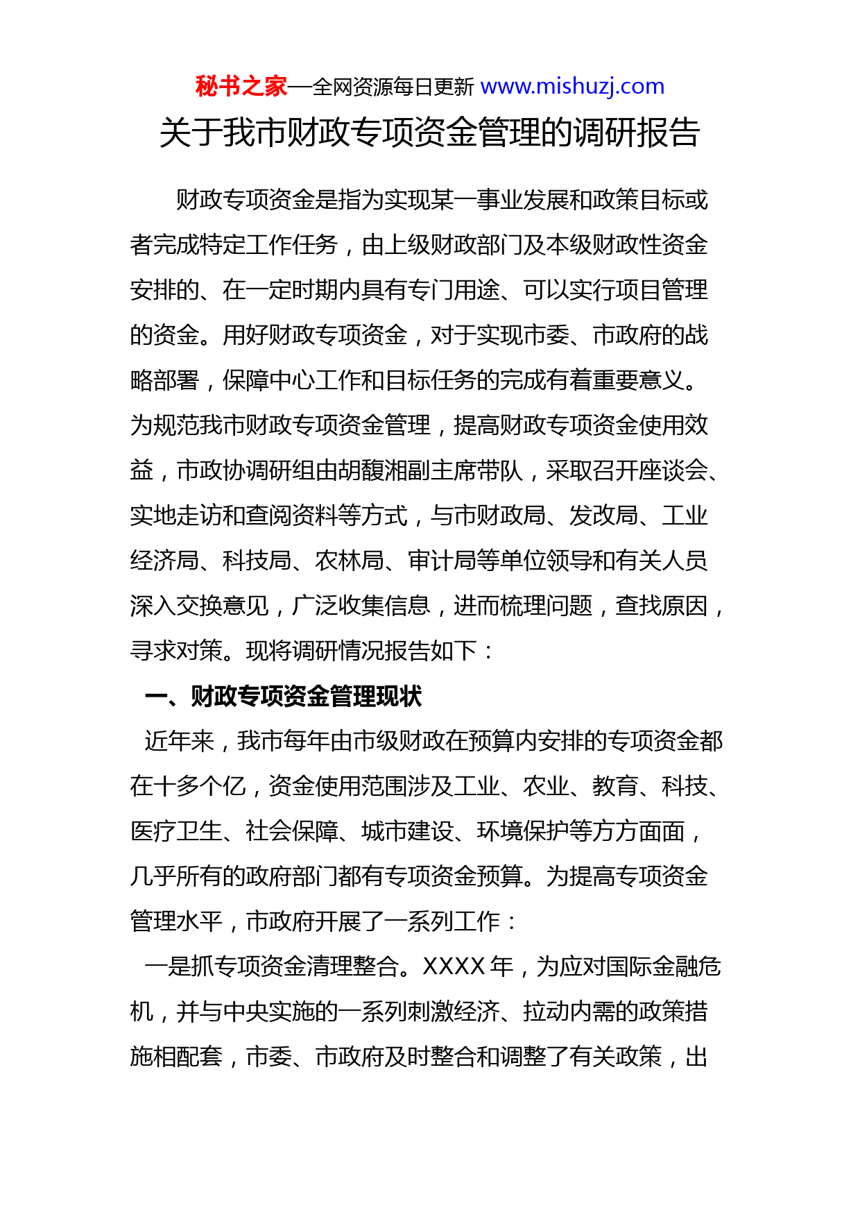 秘书之家—全网资源每日更新www.mishuzj.com关于我市财政专项资金管理的调研报告财政专项资金是指为实现某一事业发展和政策目标或者完成特定工作任务,由上级财政部门及本级财政性资金安排的、在一定时期内具有专门用途、可以实行项目管理的资金。用好财政专项资金,对于实现市委、市政府的战略部署,保障中心工作和目标任务的完成有着重要意义。为规范我市财政专项资金管理,提高财政专项资金使用效益,市政协调研组由胡馥湘副主席带队,采取召开座谈会、实地走访和查阅资料等方式,与市财政局、发改局、工业经济局、科技局、农林局、审计局等单位领导和有关人员深入交换意见,广泛收集信息,进而梳理问题,查找原因,寻求对策。现将调研情况报告如下:一、财政专项资金管理现状近年来,我市每年由市级财政在预算内安排的专项资金都在十多个亿,资金使用范围涉及工业、农业、教育、科技、医疗卫生、社会保障、城市建设、环境保护等方方面面,几乎所有的政府部门都有专项资金预算。为提高专项资金管理水平,市政府开展了一系列工作:一是抓专项资金清理整合。XXXX年,为应对国际金融危机,并与中央实施的一系列刺激经济、拉动内需的政策措施相配套,市委、市政府及时整合和调整了有关政策,出秘书之家—全网资源每日更新www.mishuzj.com台了《关于推进创业创新加快产业转型升级的若干意见》(温市委发[XXXX]XX号)、《关于进一步加快服务业发展的若干意见》(温市委发[XXXX]XX号)等,设立临时性的重点推进项目,有效促进了我市经济企稳回升,维护了地方经济的稳定发展。XXXX年,市政府及相关部门认真贯彻落实省政府《关于清理整合和规范财政专项资金管理的意见》,先后三次组织专项资金清理,减少部门专项结余XXXX万元,清理历史遗留专项X项,整合政府出台的各项奖励政策,减少、合并同类奖励,明确业务主管部门的管理职责,避免多头管理、重复奖励。二是抓规范运行。开展国库集中支付试点并逐步扩大试点深度和广度,规范用款计划和资金申拨,深化“收支两条线”管理,从程序上规范资金运行。三是抓监督管理。围绕打造“绩效财政”目标,逐步构建以绩效评价为龙头的预算监督体系,加强财政专项支出的全过程管理,做好事前的专业审核机制,介入事中监控环节,搞好事后绩效评价,努力提高财政资金的使用效益。二、财政专项资金管理存在的主要问题从调研情况看,虽然市政府及相关部门按照公共财政的要求,根据我市经济社会发展需要,不断地调整专项资金的使用方向,强化专项资金(基金)的管理,使其发挥“四两拨千斤”的作用,取得了较好的社会效益,但财政专项秘书之家—全网资源每日更新www.mishuzj.com资金的使用和管理仍存在许多不容忽视的问题。(一)专项资金设立不够科学。各业务主管部门是设立专项资金的主体。实行部门预算后,部门除了人员经费和必要的办公经费外很少有机动财力,因此专项资金成为各部门千方百计追逐的对象。出于自身利益考虑,各部门会寻找各种理由设立专项资金,有的强调上级业务部门有要求,有的提出要学习先进地区的经验,在经过一番考察学习后就提出设立专项资金的要求。这些项目往往未经充分论证和可行性研究,也没有完全从事业发展的实际需要出发,更缺少对经济运行状况和社会发展趋势的科学预测和分析。出台的政策则是集各地优惠政策之大成,不仅脱离我市人口多,人均财力薄的市情,也脱离我市经济社会发展的实际。(二)专项资金管理分散,难以形成合力。我市专项资金有部门化倾向,设置的项目繁多,资金管理、使用分散,难以达到整合财政资源、发挥财政资金使用合力的作用。如根据市委《关于进一步加快服务业发展的若干意见》设立的三产扶持资金,涉及发改、贸粮、外经贸、旅游等多个部门,各部门从履行自身职能出发都要求切一块由自己支配,有限的资金被不合理地分割和分散使用。这些三产类扶持项目,补助在X万元以下的比较普遍,面广分散,使我们解决三产发展中的重点、难点问题的能力受到削弱。秘书之家—全网资源每日更新www.mishuzj.com不仅如此,因部门职能有交叉,部分专项资金的扶持对象和范围也难免出现重叠。如市工业经济局、外贸局、贸粮局都列有支持企业参加各类会展的经费;市国土资源局负责的土地整理项目与市农业综合开发办公室实施的一些农综项目建设内容基本相同;市科技局根据(温市委办发〔XXXX〕XX号)文件对工业、农业产业化项目进行扶持,而市工业经济局、农林局都有各自的产业化专项资金。一些企业和个人就利用政策上的漏洞将同一个项目向多个部门申报,达到重复享受的目的。(三)每年专项资金余额较大。业务主管部门普遍存在“钱多好办事”的观念,考虑到自身利益和财政批复习惯,为避免预算被削减,每年编制专项资金预算时大多会虚高预算额度;一些部门对年度工作缺乏客观预期,对项目具体涵盖的内容、实施的进度等不够明确,导致资金预算失真;财政部门对一些项目的审核缺乏标准和依据,对于大范围的超标预算采取“一刀切”的方法来平衡,预算编制存在主观性和随意性。XXXX年,市审计局的审计报告反映,抽查市建设规划局XXXX年XX项专项资金,XX个专项上年结转结余XXXX.XX万元,其中X项当年无支出,X项当年支出XXX.XX万元,占预算