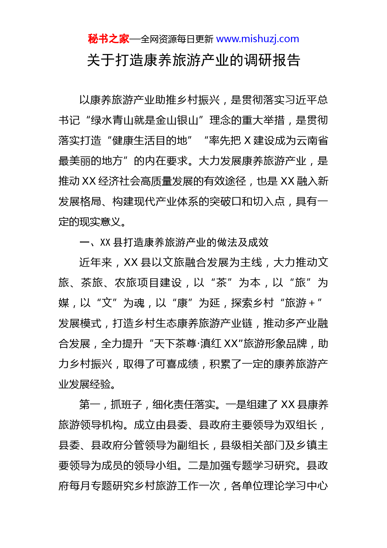 秘书之家—全网资源每日更新www.mishuzj.com关于打造康养旅游产业的调研报告以康养旅游产业助推乡村振兴,是贯彻落实习近平总书记“绿水青山就是金山银山”理念的重大举措,是贯彻落实打造“健康生活目的地”“率先把X建设成为云南省最美丽的地方”的内在要求。大力发展康养旅游产业,是推动XX经济社会高质量发展的有效途径,也是XX融入新发展格局、构建现代产业体系的突破口和切入点,具有一定的现实意义。一、XX县打造康养旅游产业的做法及成效近年来,XX县以文旅融合发展为主线,大力推动文旅、茶旅、农旅项目建设,以“茶”为本,以“旅”为媒,以“文”为魂,以“康”为延,探索乡村“旅游+”发展模式,打造乡村生态康养旅游产业链,推动多产业融合发展,全力提升“天下茶尊·滇红XX”旅游形象品牌,助力乡村振兴,取得了可喜成绩,积累了一定的康养旅游产业发展经验。第一,抓班子,细化责任落实。一是组建了XX县康养旅游领导机构。成立由县委、县政府主要领导为双组长,县委、县政府分管领导为副组长,县级相关部门及乡镇主要领导为成员的领导小组。二是加强专题学习研究。县政府每月专题研究乡村旅游工作一次,各单位理论学习中心秘书之家—全网资源每日更新www.mishuzj.com组每月至少开展一次乡村旅游工作集中学习活动。三是建立验收机制。项目一个一个部署、问题一个一个解决、工程一项一项验收,形成了各级领导对康养旅游项目负责督促、检查、验收、跟踪、问效评价考核机制。第二,抓重点,明确目标定位。立足“世界滇红之乡”独具特色的文化品牌优势,依托丰富的优质茶园、茶旅、滇红茶技艺、滇红茶文化等茶元素资源,加快以茶为主题的乡村旅游、康养度假产业全面发展,突出“北看茶马”定位,以全域旅游为目标,以乡村旅游为突破口,以寻找最美村庄为抓手,精准定位康养旅游产业,将康养旅游产业打造成战略性支柱产业。第三,抓宣传,提升康养旅游品牌影响力。紧紧围绕打造世界一流“健康生活目的地牌”,建设宜居宜业宜游的美丽家园,全力打造全省一流的康养度假胜地,积极承办各类健康旅游赛事活动,打造了农事体验、户外亲子游戏、餐饮住宿、田园观赏、文艺展演元素在内的体验式家庭农场消费经营产业链,打造了汽车场地越野赛、健康跑、徒步、骑行、自驾、团队体验等赛事赛会活动,打造了以“春游长湖山花、夏拜茶尊芳华、秋享硕果玉露、冬临乡愁人家”为主题的7条精品乡村旅游线路,全方位、多角度、宽领域打造“天下茶尊·滇红XX”的旅游形象品牌取得初步成效。秘书之家—全网资源每日更新www.mishuzj.com第四,抓样板重示范,延伸康养旅游产业链。加快打造XX个乡村旅游示范村,鲁史古镇、“中国滇红第一村”成功创建为国家3A级景区;石洞寺、古墨传统村落成功创建为国家2A级景区;鲁史古镇和古墨村、安石村、箐头村分别被评为云南省旅游名镇及旅游名村;鲁史镇和沿河村、锦秀村、箐头村分别被评为云南省旅游扶贫示范镇及示范村。据统计,2022年,XX县接待海内外旅游人次达XXX万人次,旅游总收入XX亿元,接待乡村旅游XXX万人次,实现乡村旅游总收入XX亿元。二、XX县打造康养旅游产业存在的短板第一,缺乏乡村旅游规划引领。目前,各旅游示范村没有专门做旅游村建设规划,大多依据“万名干部规划家乡行动”所做的村庄规划来指导乡村旅游规划建设,指导性不强,随意性较大。有些地方存在规划时群众参与多,实施时参与少,“主导”包揽较多,“主体”作用发挥不充分,只满足于项目完成,示范效应不明显,“等、靠、要”依赖思想严重,群众依托乡村旅游平台创业的积极性主动性不足,新增就业岗位少,在补充修补完善“规划”、激发群众内生动力、创新体制机制和管理方式方面存在不足;部分地方乡村旅游定位不准,照搬照抄,规划同质化严重,难以落地,缺乏清晰思路、规划、策略、模式、目标定位等问题。秘书之家—全网资源每日更新www.mishuzj.com第二,旅游基础设施建设滞后。XX县拥有丰富的旅游资源,但受制于交通不便,民间投资者望而却步,引入社会资本非常困难,重点旅游基础设施项目建设缺少资金投入;规划未能落实,优质的旅游资源优势未能转化为经济优势;通往各旅游景区的交通道路设施等级低,大部分达不到旅游通达条件要求;旅游住宿餐饮设施档次较低,缺乏具有较强吸引力的休闲娱乐项目和购物体验;未能很好地满足文化旅游、康体休闲、养生养老等多样化的功能需求;旅游城市的氛围营造不够,县城及旅游景区周边大环境绿化、净化、美化、亮化亟待系统打造和提升。第三,文化旅游产业带动能力不强。目前,XX的旅游多是凭借现有资源开展单纯的观光游。内部缺少民宿、餐厅、娱乐、旅游纪念品以及依据现有资源开发相关的游乐项目,地方特色的旅游纪念品开发不够,品种不多、档次偏低、品位不足,没有进行必要的深层次“加工”“提纯”“包装”,文化旅游产业关联度和融合度低;在延伸产业链,带动相关产业发展,促进一、二、三产业深度融合不够,特别是旅游产业与现代农业、文化产业、房地产业及城镇化推进和美丽乡村建设等方面融合不够紧密,文化旅游产业的综合带动能力不强,尚未形成“大旅游、大产业、大市场、大文化、大服务”的工作态势和发展格局。秘书之