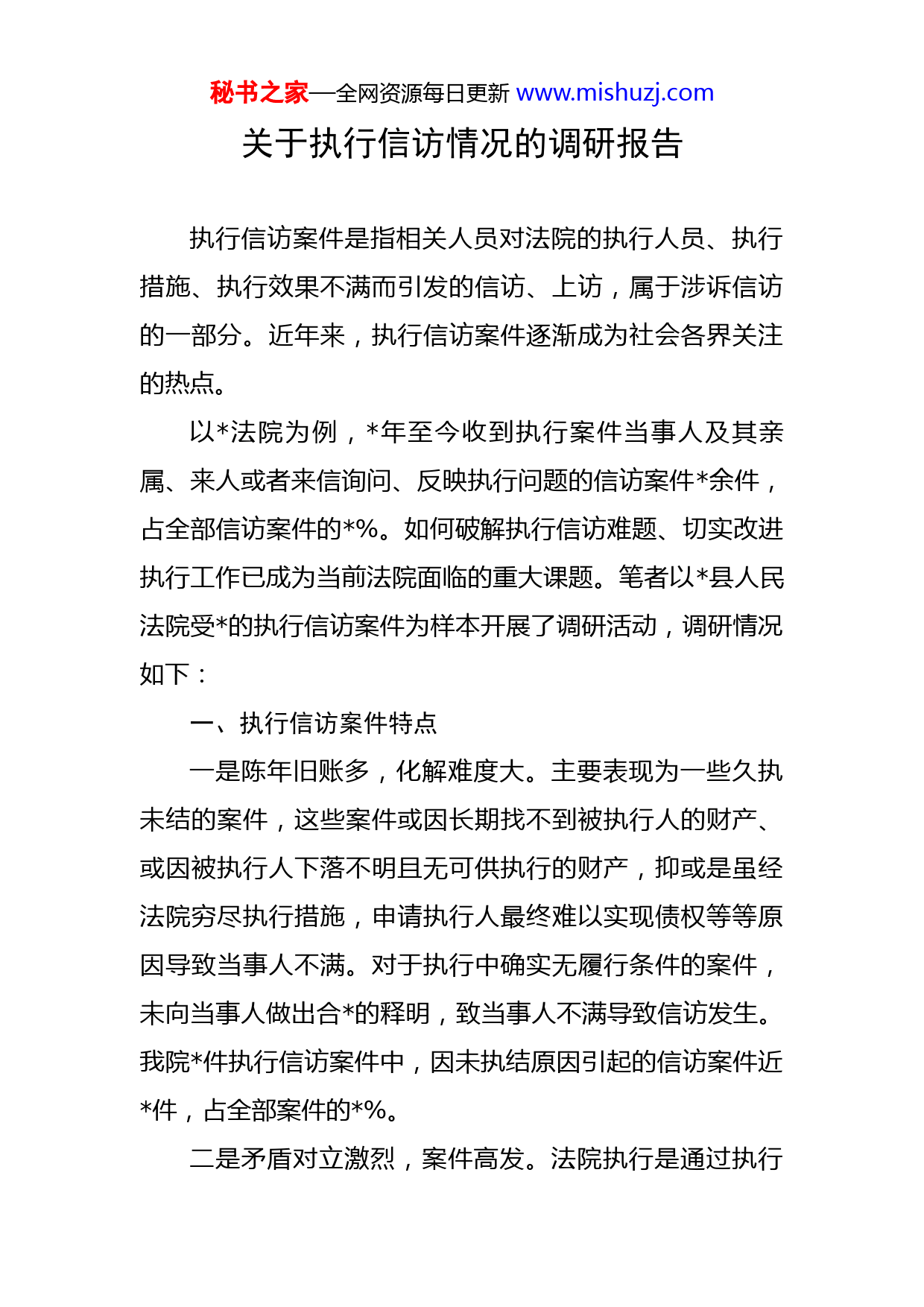 秘书之家—全网资源每日更新www.mishuzj.com关于执行信访情况的调研报告执行信访案件是指相关人员对法院的执行人员、执行措施、执行效果不满而引发的信访、上访,属于涉诉信访的一部分。近年来,执行信访案件逐渐成为社会各界关注的热点。以法院为例,年至今收到执行案件当事人及其亲属、来人或者来信询问、反映执行问题的信访案件余件,占全部信访案件的%。如何破解执行信访难题、切实改进执行工作已成为当前法院面临的重大课题。笔者以县人民法院受的执行信访案件为样本开展了调研活动,调研情况如下:一、执行信访案件特点一是陈年旧账多,化解难度大。主要表现为一些久执未结的案件,这些案件或因长期找不到被执行人的财产、或因被执行人下落不明且无可供执行的财产,抑或是虽经法院穷尽执行措施,申请执行人最终难以实现债权等等原因导致当事人不满。对于执行中确实无履行条件的案件,未向当事人做出合的释明,致当事人不满导致信访发生。我院件执行信访案件中,因未执结原因引起的信访案件近件,占全部案件的%。二是矛盾对立激烈,案件高发。法院执行是通过执行秘书之家—全网资源每日更新www.mishuzj.com被执行人的财产和行为从而保护申请人的合法权益,其对被执行人、申请人乃至案外人的利益都会产生直接的影响,因此执行过程中当事人矛盾更趋集中、更易激化。不充分做好当事人的工作,可能导致其诉讼前甚至是审判过程中累积的矛盾在执行过程中爆发,将怨气撒在执行人员身上,形成信访案件,实践中,申请人与被执行人同时上访的有件之多,占全部执行信访案件的%,此类信访案件化解难度较大。三是被执行主体履行不能问题突出。执行效果与被执行主体的经济实力密切相关,执行信访案件也存在“巧妇难为无米之炊”现象。申请执行人或被执行人属弱势群体的案件,大多集中在刑事附带民事人身损害赔偿、交通事故、工伤事故、财产损害赔偿、追索劳动报酬等类案件,此类执行案件化解难度大,最易引发信访。目前,因执行主体履行不能而造成执行难,已成为不可忽视的重要问题,从审判实践中可以看出,这类案件共有件,占所有执行信访案件的%,尤其是涉及到交通事故损害赔偿纠纷的执行案件,巨额的赔偿数额即便是让被执行人倾家荡产都无能为力,执行工作陷入无物可执,双方皆有实际难处的两难怪圈。四是诱因众多、涉及面广。相对于审判工作中反映的“不公”问题,执行信访诱因显得更为多样,除了执行秘书之家—全网资源每日更新www.mishuzj.com“不力”、执行差错问题,执行人员态度乃至合法正当执行行为本身都可能成为信访由。实践中还存在一些被执行人为达到拒不履行生效判决的目的,利用信访掣肘法院。而从涉及主体看,执行不仅涉及被执行人的财产,也可能涉及第三人甚至案外人的财产,而且执行程序中与银行、登记主管机关等单位联系密切,涉及面广、需要综合考虑的因素多也是执行信访高发的重要原因。从本院情况看,近年来由上述原因引发的执行信访案件有愈演愈烈之势。五是重信重访率高、息诉罢访难。法院的执行是有条件的执行,执行的成功与否是多方因素综合的结果。执行过程中的无财产可供执行、个案执行周期长等等很多情况都是执行工作特殊性所在,但其与当事人要求快速执行完毕的愿望显然存在差距,对此缺乏共识的情况下,案件只要不是全部执行完毕,就存在上访的隐患,执行过程的长期性一定程度上决定了执行信访的长期性和反复性。个别干警接到交办的信访件后,缺乏责任心或不善于做群众工作,致使有者重访,无者也重访。在受的执行信访案件中,有十余件执行案件申请人多次信访,息诉罢访难度可想而知。二、执行信访的成因(一)法律意识和风险意识欠缺及“信访不信法”的心。一方或双方当事人对人民法院正确执行工作缺乏解秘书之家—全网资源每日更新www.mishuzj.com或对执行结果不满、对法律条文解不清,或通过执行人员的解释仍然不解,特别是有些申请人没有树立正确的市场风险意识,对具备申请执行效力的法律文书的心预期过高,甚至有些申请执行人偏执地认为,法院掌握无限国家权力,不管被执行人财产状况如何,都应当给其执行到位,不论执行干警是否穷尽执行手段或是否依法执行,就把生效法律文书得不到执行的原因归咎于法院和执行人员。此外,大多信访人把“权”与“法”位置颠倒,认为“大闹大解决,小闹小解决,不闹不解决”,希望通过信访让上级领导和法院领导重视过问,加速案件的执行,如果影响自己的利益,就“信访鸣冤”,以免执行人员“消极怠工”。(二)权利未能实现或利益受损是执行信访产生的主要原因。对申请人来讲,就是执行期望落空或不能完全到位。这些案件主要有下几种类型:被执行人长期下落不明,或无执行能力,亦无可供执行财产;被执行人有偿还能力,但通过各种手段隐匿、转移财产,造成无力偿还假象,法官通过各种方式仍不能获取线索;案件未执行完毕,申请人的请求只实现一部分;同一案件有两个或者两个以上的申请人,只有部分申请人的权益得到实现。因上述各种原因导致无法执行,但信访人认为法院执行力度不够导致执行不能,得不到赔偿就不断上访。对被执行人及秘书之家—全网资源每日更新www.mishuzj.com案外人来讲,执行信访