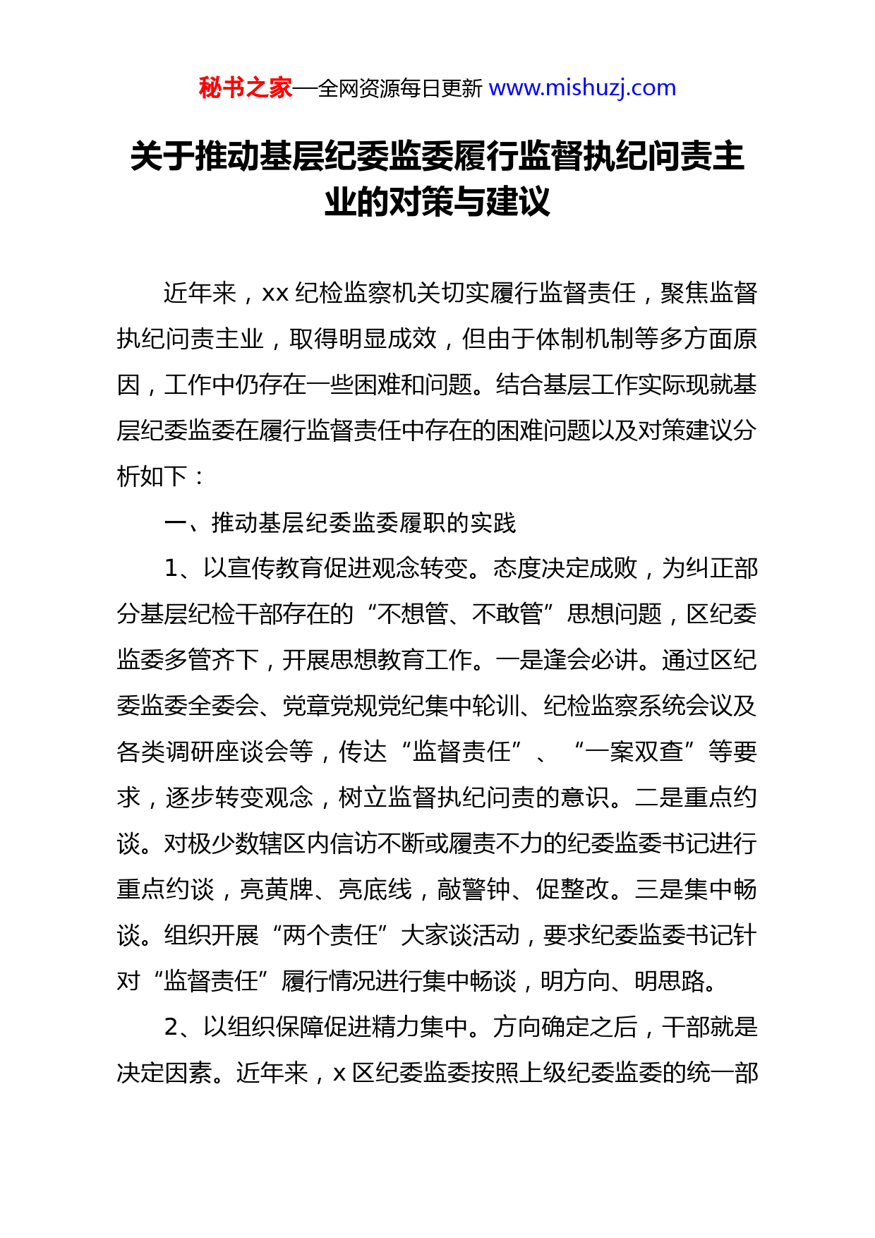 秘书之家—全网资源每日更新www.mishuzj.com关于推动基层纪委监委履行监督执纪问责主业的对策与建议近年来,xx纪检监察机关切实履行监督责任,聚焦监督执纪问责主业,取得明显成效,但由于体制机制等多方面原因,工作中仍存在一些困难和问题。结合基层工作实际现就基层纪委监委在履行监督责任中存在的困难问题以及对策建议分析如下:一、推动基层纪委监委履职的实践1、以宣传教育促进观念转变。态度决定成败,为纠正部分基层纪检干部存在的“不想管、不敢管”思想问题,区纪委监委多管齐下,开展思想教育工作。一是逢会必讲。通过区纪委监委全委会、党章党规党纪集中轮训、纪检监察系统会议及各类调研座谈会等,传达“监督责任”、“一案双查”等要求,逐步转变观念,树立监督执纪问责的意识。二是重点约谈。对极少数辖区内信访不断或履责不力的纪委监委书记进行重点约谈,亮黄牌、亮底线,敲警钟、促整改。三是集中畅谈。组织开展“两个责任”大家谈活动,要求纪委监委书记针对“监督责任”履行情况进行集中畅谈,明方向、明思路。2、以组织保障促进精力集中。方向确定之后,干部就是决定因素。近年来,x区纪委监委按照上级纪委监委的统一部秘书之家—全网资源每日更新www.mishuzj.com署,扎实推进基层纪检监察组织建设。一是深化乡镇纪委专职专用。通过专项督查通报、飞行检查、分工报批等举措,确保全区x个乡镇街道纪委书记、副书记全部实现了专职专用。其中,规模较大的x个乡镇街道还配备了x名专职纪检干部。二是完成派驻机构改革工作。在x地区率先完成派驻机构改革工作,在全区设置x个派驻(出)纪检组,有效整合了区级机关的监督力量。三是健全国有企业纪检组织设置和人员保障。在充分调研和沟通基础上,在x家国有企业设立纪检组织,并充实国有企业纪检组织负责人岗位,确保纪委监委监督网络不留空白。3、以培训指导促进能力提升。党风廉政建设和反腐败工作的深入推进迫切要求加强纪检干部业务培训指导工作。近年来,区纪委监委采取有效措施,不断加大培训指导力度,促进能力提升。一是立体化培训。通过集中培训、每月轮训、挂职锻炼等多种方式,重点学习“四种形态”、“两个新规”等新形势新要求及信访处理、纪律审查等业务知识并以实战提升业务能力。二是清单式指导。下发基层纪委监委履行监督责任工作清单,分别明确了五大方面x项和x项工作任务,解决了基层纪委监委专职专用后干什么的问题。统一标准指导基层信访谈话点建设,并严格执行问题线索上报制度,确保安全文明。三是制度化巩固。总结基层党风廉政建设好的做法,建立健全秘书之家—全网资源每日更新www.mishuzj.com“家访制”等有效管用制度,着力化解疑难信访问题。建立村级“廉心报”工作机制,乡镇街道纪(工)委每季度将各村“三务”信息在“廉心报”上刊登,以“公开”促规范。4、以强化考核促进责任落实。一是工作考核。建立月度清单考核制度,每月由各室下达当月需完成的任务,增强工作饱和度。对不完成任务的在月底点评时予以扣分,对一季度工作开展不力的予以谈话提醒,强化过程考核,倒逼切实履职。如截至目前,全区x个乡镇(街道)纪检监察组织已全部完成x件以上自办案件,共计完成x件。二是日常考核。通过全覆盖的调查摸底,加强对全区纪检监察干部的情况收集和掌握,初步建立纪检干部档案库,开展纪检干部单列考核工作。三是结果运用。对排名靠后的,进行约谈提醒,两次排名后三位的,坚决予以调整,去年以来对x名纪委监委书记进行了调整。二、面临的问题和困惑经过两级纪委监委的共同努力,乡镇部门纪委在履行监督责任上总体是好的,初步纠正了“越位、错位、缺位”等问题,但也存在一些不容忽视的问题,应引起高度重视。1、观念理念上还不够到位。党风廉政建设,“主体责任”是根本,“监督责任”是关键,两者缺一不可。从目前情况看,有的纪检组织对纪委在党要管党、从严治党中肩负的重秘书之家—全网资源每日更新www.mishuzj.com大责任认识不深刻,责任感、使命感不强。怕“做难人”,怕“断后路”,怕“失票子”,不敢监督、不善监督,尤其是考虑到“x小地方”,顾忌方方面面关系,在监督执纪工作中存在应付心理,抹不下面子、放不开手脚、犯“软骨病”、做“老好人”,影响监督作用发挥。2、责任落实上还不够到位。“两个责任”落实逐级递减、逐级乏力问题是普遍存在的问题,x也不例外。尽管下发了工作清单,明确了工作任务,每月还有月度工作清单,应该说是解决了专职专用后该干什么的困惑。但从实际情况看,还是缺少具体化的责任落实机制。单位之间工作量不平衡。监督责任落实还是不够有力,在信访化解、纪律审查各项工作都有体现。同时,对履职不力的责任追究还没有动真格,特别是对履行监督责任不力的责任追究还没有启动。3、能力水平上还不够到位。新的形势对纪检干部能力提出了更高要求,导致出现“跟不上”的状况。一是结构不尽合理。长期以来,基层纪检岗位存在安置性安排的情况,基层纪委监委书记、纪检组长的年龄、学历、专业结构不合理,办信办案能力相对较差,不适应新形势的要求。二是干部调整频繁。近几年来,纪检干部逐渐趋于年轻化,但调整频繁。有的刚刚