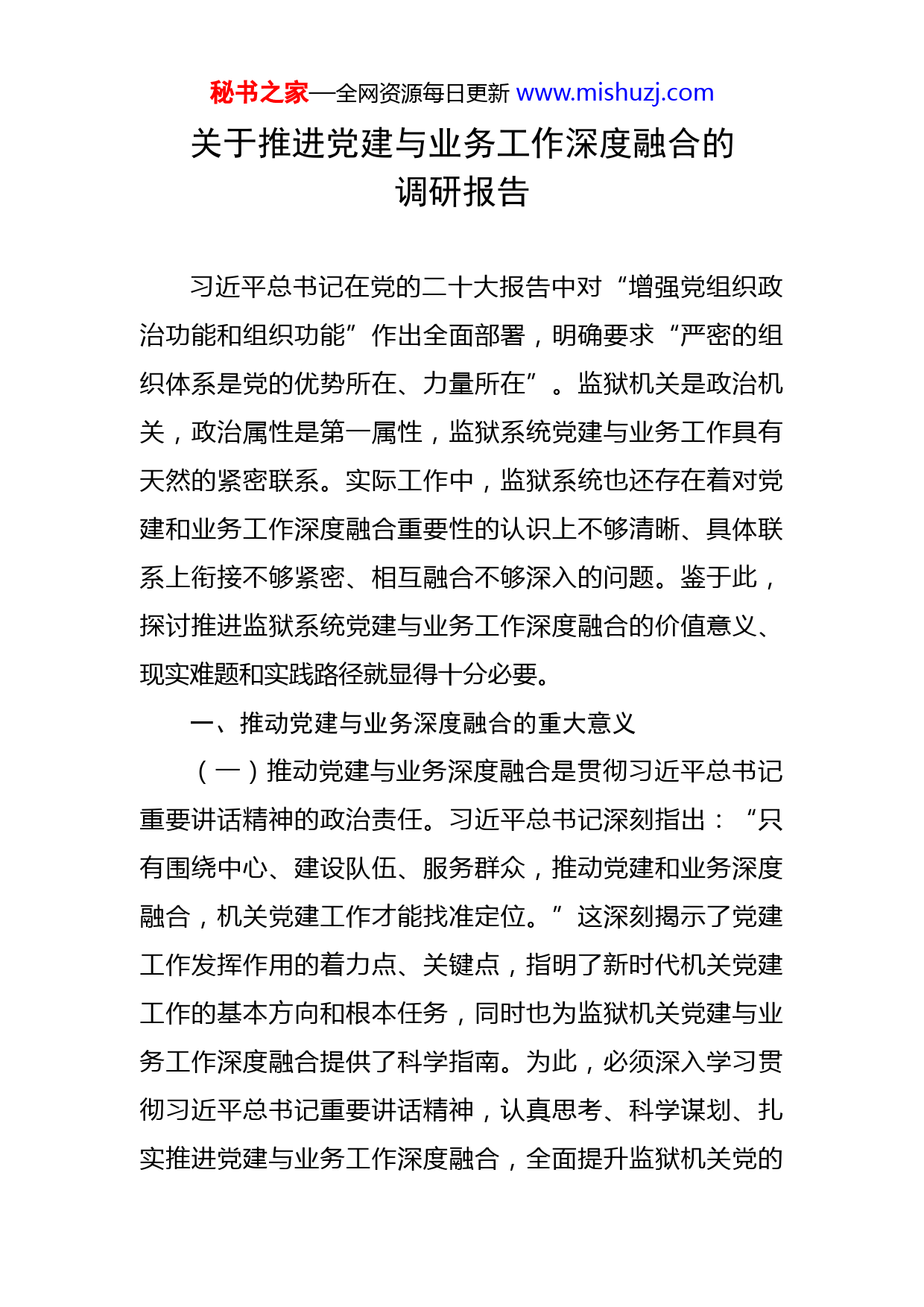 秘书之家—全网资源每日更新www.mishuzj.com关于推进党建与业务工作深度融合的调研报告习近平总书记在党的二十大报告中对“增强党组织政治功能和组织功能”作出全面部署,明确要求“严密的组织体系是党的优势所在、力量所在”。监狱机关是政治机关,政治属性是第一属性,监狱系统党建与业务工作具有天然的紧密联系。实际工作中,监狱系统也还存在着对党建和业务工作深度融合重要性的认识上不够清晰、具体联系上衔接不够紧密、相互融合不够深入的问题。鉴于此,探讨推进监狱系统党建与业务工作深度融合的价值意义、现实难题和实践路径就显得十分必要。一、推动党建与业务深度融合的重大意义(一)推动党建与业务深度融合是贯彻习近平总书记重要讲话精神的政治责任。习近平总书记深刻指出:“只有围绕中心、建设队伍、服务群众,推动党建和业务深度融合,机关党建工作才能找准定位。”这深刻揭示了党建工作发挥作用的着力点、关键点,指明了新时代机关党建工作的基本方向和根本任务,同时也为监狱机关党建与业务工作深度融合提供了科学指南。为此,必须深入学习贯彻习近平总书记重要讲话精神,认真思考、科学谋划、扎实推进党建与业务工作深度融合,全面提升监狱机关党的秘书之家—全网资源每日更新www.mishuzj.com建设工作质量。(二)推动党建与业务深度融合是建设党和人民放心的过硬队伍的迫切要求。监狱工作是政治性很强的业务工作,也是业务性很强的政治工作,必须坚决落实党的绝对领导,把党的建设贯穿队伍建设始终。推进党建与业务工作深度融合,突出政治统领、强化党建引领,着力建设“四化”“五硬”的过硬民警队伍,确保监狱人民警察队伍始终听党话、跟党走,确保“刀把子”牢牢掌握在党和人民手中。(三)推动党建与业务深度融合是围绕中心服务大局、推进监狱治理体系和治理能力现代化的现实需要。提升监狱治理现代化必须依靠提高党的领导现代化和党的建设科学化水平来实现。加强和改进党的领导、建强战斗堡垒是实现社会治理现代化的重要前提。因此必须扎实推进党建与业务工作深度融合,不断提升监狱治理现代化水平,为创造更加安全稳定的政治社会环境作出新贡献。二、推动党建与业务深度融合存在的问题(一)融合的认识不到位。有的单位党组织负责人从思想上十分重视党建工作,但对新时代党的建设总要求还把握不准,在遇到多项任务叠加时,还存在“说起来重要,干起来次要,忙起来不要”的情况,党的建设受到影响。有的把党建工作简单混同于党务工作,认为党务工作秘书之家—全网资源每日更新www.mishuzj.com冲淡了中心工作,给基层添麻烦,影响了业务工作。有的认为维护安全稳定是硬指标,而党建工作是软任务,仍然存在“重业务、轻党建”的习惯性思维。有的谋划业务工作不善借党建之力,不知如何发挥党组织的政治功能和组织功能去推动高质量发展,在业务工作面临难题和困境时,不注重从党建维度理思路、找方法,导致党建把方向、谋大局的功能不能全方位激发,难以形成党建与业务深度融合的大联动发展格局。(二)融合的思路不清晰。少数党组织在抓工作时有急功近利的思想,缺乏求真务实的作风,一味就“完成要求任务”抓而抓,与业务工作相脱节、相割裂甚至相排斥。有的党员在遇到问题和困难时,党组织没有及时提供关心帮助,思想政治工作没有跟上,甚至针对少数党员干部理想信念动摇、组织纪律淡漠等现象,存在引导不准、教育不力、监督不够的问题,不能真正发挥党组织抓班子、带队伍、促发展的功能作用。(三)融合的力量不够强。党务干部队伍建设与新形势下党建目标要求还有不少距离。一方面,专职党务干部还没有完全做到“应配尽配”,很多单位党务干部往往身兼多职,不能全身心投入到党建工作中去。另一方面,专兼职党务干部能力素质也不能适应党建与业务融合工作,部分党务工作者对中心工作把握不准,对业务工作了解有秘书之家—全网资源每日更新www.mishuzj.com限,并且人员流动性大,“传帮带”不到位,很大程度上影响了党建工作的质量和效果。部分党务干部对党建新情况新问题新要求研究不够,找不到有机融合的切人点和突破口,造成党建工作“自说自话”“自成一家”。三、推动党建与业务深度融合的意见建议(一)突出政治导向,树牢融合思维。一要提高政治站位。破解党建与业务融合不到位的问题,最根本的是从思想上正本清源,消除“不需抓”的认识误区,形成“必须抓”的政治自觉,树牢“主动抓”的融合意识。实现从“两张皮”向“一体化”,从“围绕式”向“融入式”转变,从物理互动变为化学融合,才能构建多方参与、优势互补、资源整合、力量融合的工作体系,不断提升监狱机关党建工作科学化水平。二要强化政治引领。按照“政治统领、党建引领,司法工作讲政治、业务工作重党建”的要求,在具体处理业务工作中,既要注重运用法治思维、法治方式,又要有政治思维、政治智慧,在执法管理、教育改造实践中最大限度实现政治效果、社会效果、法律效果的有机统一。坚持政治建警,把学习贯彻习近平新时代中国特色社会主义思想作为党员干部教育培训的首课、主课、必修课。贯彻落实意识形态工作责任制,强化党性观念和宗旨意识,教