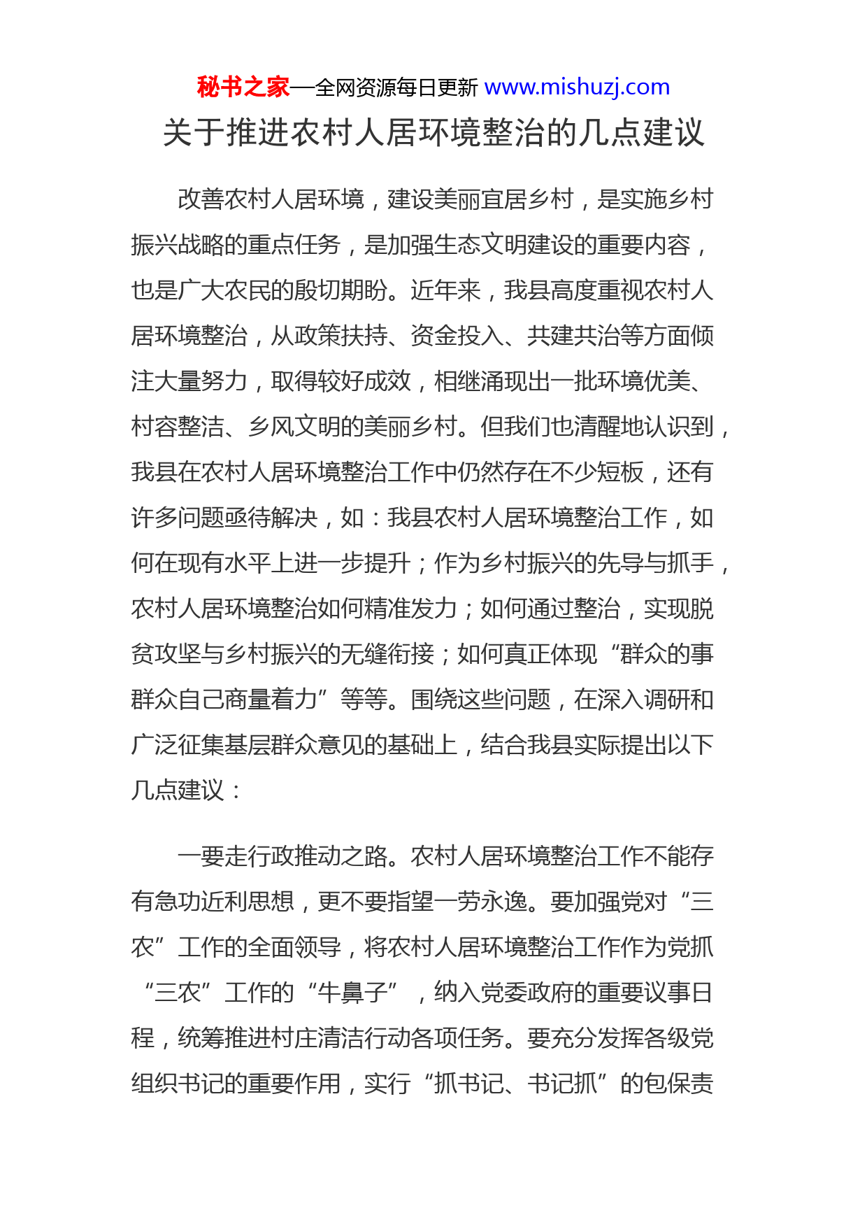 秘书之家—全网资源每日更新www.mishuzj.com关于推进农村人居环境整治的几点建议改善农村人居环境,建设美丽宜居乡村,是实施乡村振兴战略的重点任务,是加强生态文明建设的重要内容,也是广大农民的殷切期盼。近年来,我县高度重视农村人居环境整治,从政策扶持、资金投入、共建共治等方面倾注大量努力,取得较好成效,相继涌现出一批环境优美、村容整洁、乡风文明的美丽乡村。但我们也清醒地认识到,我县在农村人居环境整治工作中仍然存在不少短板,还有许多问题亟待解决,如:我县农村人居环境整治工作,如何在现有水平上进一步提升;作为乡村振兴的先导与抓手,农村人居环境整治如何精准发力;如何通过整治,实现脱贫攻坚与乡村振兴的无缝衔接;如何真正体现“群众的事群众自己商量着力”等等。围绕这些问题,在深入调研和广泛征集基层群众意见的基础上,结合我县实际提出以下几点建议:一要走行政推动之路。农村人居环境整治工作不能存有急功近利思想,更不要指望一劳永逸。要加强党对“三农”工作的全面领导,将农村人居环境整治工作作为党抓“三农”工作的“牛鼻子”,纳入党委政府的重要议事日程,统筹推进村庄清洁行动各项任务。要充分发挥各级党组织书记的重要作用,实行“抓书记、书记抓”的包保责秘书之家—全网资源每日更新www.mishuzj.com任制,将农村人居环境整治纳入各级党组织书记的述职考评。要按照中央、省、市农村人居环境整治三年行动总体部署,分清轻重缓急,突出工作重点,结合本地实际,合理确定分年度整治目标。要遵循“先易后难、先点后面、示范先行、分步推进”的原则,集中力量、攻坚克难,重点解决当前农村人居环境最为突出、最为迫切的问题,推出一批可复制、可参考、可借鉴的重点村和示范村民组(屋场)。二要走群众自治之路。农村人居环境整治工作,一定要坚持相信群众、依靠群众、发动群众。离开人民群众的农村人居环境整治工作,不仅难以得到拥护与支持,而且还容易成为农村矛盾纠纷的导火索。要改变扶贫夜校、乡村大讲堂的召开形式,各级党组织书记和各帮扶单位负责人,要下沉到村民组或者屋场召开群众会,使群众会能真正的开到农户家中去、群众心里去。相关部门要把“群众会村民组全覆盖”纳入对乡镇党委、村级党总支考核,使之成为农村人居环境整治的重要抓手,成为乡村有效治理的重要途径。要充分发挥村民组长、理事会和村民自治组织作用,推进农村人居环境整治工作向组、户延伸,建立“县、乡(镇)、村、组、户”五级责任网,进一步完善农村人居环境整治工作责任体系。根据我县行政村较大的秘书之家—全网资源每日更新www.mishuzj.com实际,进一步细化责任单位,以村民组或者屋场为基本单元,方案制订到组(屋)、群众动员到组(屋)、人员包保到组(屋)、整治措施到组(屋)、验收考评到组(屋)、追责问责到组(屋)。三要走分类施策之路。当前我县农村人居环境整治,最为紧迫、最难解决的是农村污水处理、农村垃圾处理和农村厕所革命。结合农村实际情况,综合考虑建设、运营、管护成本,建议在镇区周边将农村污水纳入污水处理厂进行处理;在其他农村人口集聚区,分片建设污水处理设备,集中纳管处理;在农村人口居住分散区,采取单户建设或多户联建模式,对农村生活污水进行收集处理。要进一步完善垃圾转运处理配套设施建设,坚守生态红线,合理选择垃圾临时堆放点,确保垃圾临时堆放点远离居民集聚区和生态保护区;明确垃圾堆放点建设规范,并加强监督指导,避免出现二次污染。要大力推进农村厕所革命,摸清近年来我县农村厕所改造过程中存在的问题,能整改利用的坚决整改到位,不能整改的也要采取其他办法,确保老百姓有卫生厕所使用;要摸清全县农村农户自建卫生厕所情况,鼓励和引导农户自建标准化的卫生厕所。四要走统筹结合之路。推进农村人居环境整治,首先要集中力量,处理好人居环境整治工作历史欠账问题,尤秘书之家—全网资源每日更新www.mishuzj.com其是要着力解决农村乱堆乱放、乱搭乱建、垃圾围村、小微水体及村庄“脏乱差”等方面问题。要充分发挥人居环境整治工作领导小组的统筹作用,将人居环境整治工作与相关涉农工作的开展相结合,不定期召开专题议事协调会,梳理人居环境整治工作任务,分析可以统筹结合的涉农项目,列出工作任务和项目清单。要加强部门之间的沟通协作,整合农村危旧房屋清零、农村厕所革命、农村黑臭水体治理、沟塘河湖清淤等各类项目资金,集中力量办大事,避免“撒胡椒面”。要积极谋划水利兴修工作,将河道清淤与农村环境整治结合起来,发动群众筹资筹劳参与水利兴修。对有文化体育、交通公路、土地复垦、河塘清淤等等项目实施的屋场,必须要明确其人居环境整治的目标任务;对群众自发开展集资兴建祖堂、祠堂、广场的屋场,村级党组织要主动介入,引导其开展人居环境整治工作。五要走齐抓共管之路。俗话说“三分建、七分管”,农村人居环境整治工作,必须凝聚全社会的力量齐抓共管。要采取“一套班子管到底、一根管子通到底、一把扫帚扫到底”的模式,实行城乡环境整治一体化管理,让专业的人做专业的事。要充分发挥党员作用,鼓励党员带头开展房前屋后卫生清理,带头参与空心房的拆除,带