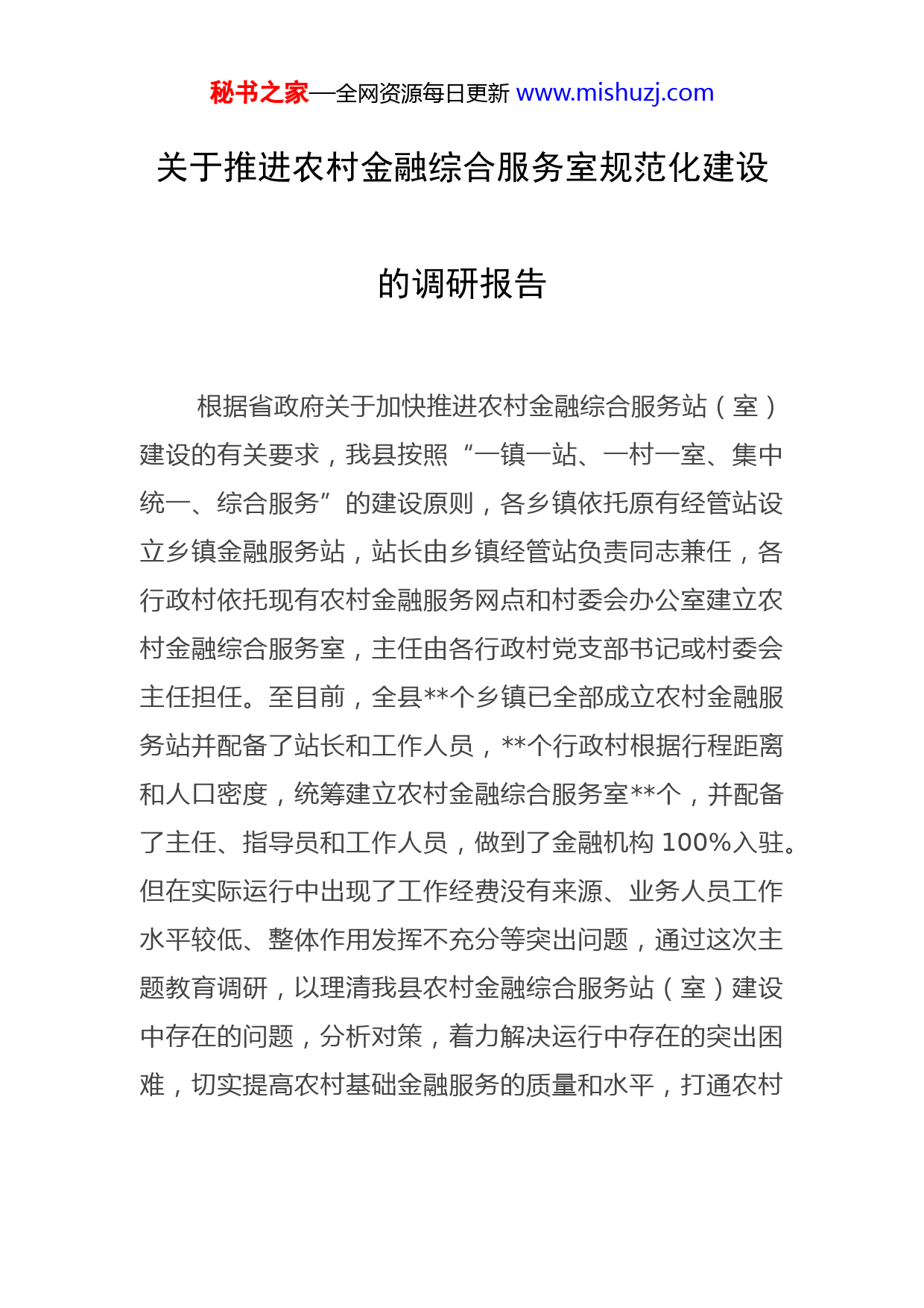 秘书之家—全网资源每日更新www.mishuzj.com关于推进农村金融综合服务室规范化建设的调研报告根据省政府关于加快推进农村金融综合服务站(室)建设的有关要求,我县按照“一镇一站、一村一室、集中统一、综合服务”的建设原则,各乡镇依托原有经管站设立乡镇金融服务站,站长由乡镇经管站负责同志兼任,各行政村依托现有农村金融服务网点和村委会办公室建立农村金融综合服务室,主任由各行政村党支部书记或村委会主任担任。至目前,全县个乡镇已全部成立农村金融服务站并配备了站长和工作人员,个行政村根据行程距离和人口密度,统筹建立农村金融综合服务室个,并配备了主任、指导员和工作人员,做到了金融机构100%入驻。但在实际运行中出现了工作经费没有来源、业务人员工作水平较低、整体作用发挥不充分等突出问题,通过这次主题教育调研,以理清我县农村金融综合服务站(室)建设中存在的问题,分析对策,着力解决运行中存在的突出困难,切实提高农村基础金融服务的质量和水平,打通农村秘书之家—全网资源每日更新www.mishuzj.com金融服务“最后一公里”,激活农村经济,助推产业发展帮助群众致富。一、我县农金室基本情况我县农村金融综合服务站(室)建设启动近一年来,主要开展的业务有农户金融业务咨询与服务、金融知识宣传与普及、协助部分银行办理贷款前审核与到期利息本金催收、协助部分保险公司办理投保业务与理赔服务等工作基本实现了有牌子、有场所、有人员、有设备、有制度、有培训、有考核的“七个有”建设要求,特别是对推动涉农政策性保险扩面、增品、提标,做到应保尽保,降低农户生产经营风险,完善农业保险制度等方面有一定的促进作用。但从运行看,也还存在一些困难和问题:一是办公场所建设不规范。我县许多行政村村级办公场所本来就十分紧张,而农金室大多设置在村委会办公室在村党支部书记或村委会主任办公室挂牌,与村委会其他业务合署办理,金融业务流程和部分规章制度无法上墙公示。同时,多类多家商业银行、保险机构一并入驻,造成同业竞争关系不易协调。二是工作人员业务不熟悉。农金室工作人员均由村干部兼任,大多年龄大、知识结构单一,具备的金融知识欠缺,业务不熟悉,对农村金融政策、金融常识大多停留在秘书之家—全网资源每日更新www.mishuzj.com一知半解,不能很好的开展农村金融服务,宣传普及金融知识,不利于专业性较强的农村金融业务推广。三是运行经费保障不到位。农金室建设运行中,没有公用经费预算作保障,电脑、打印机、验钞机、POS机等一些必要的办公设施设备购置没有经费来源,农金室日常业务开展十分不便。另外,聘用爱“三农”、懂金融的工作人员劳动报酬没有保障,农金室工作人员只能由村干部兼职。四是业务代办积极性不强。农金室各项业务交由身兼数职的村干部代办,一方面,村干部本来承担的工作任务就重、内容繁杂,很难腾出精力开展金融服务。另一方面大多村干部认为金融服务属银行、保险公司的日常业务工作,这些企业都有自己的职工,公司已为其支付了劳动报酬,金融服务工作与村委会无关,无偿代理业务还有责任风险。二、农金室运行情况分析针对此次农村金融综合服务室建设运行情况调研,我们据实分析了我县农金站(室)建设运行中存在的不足与问题,主要有以下几个方面的原因:一是金融服务功能不足。目前,我县农村金融服务体系由农商银行、农业银行、邮储银行这三家银行构成“三秘书之家—全网资源每日更新www.mishuzj.com驾马车”的基本框架,但三家银行近年来在服务“三农”过程中收益率较低,使得金融投资多向城市集中,而在农村网点推出的金融信贷产品相对较少,且只是开展存、贷汇等传统商业银行业务,贷款的期限、利率、额度等不能满足现代农业发展对资金的需求。二是金融机构缺乏动力。相对于城市金融而言,农村金融服务客观上存在着投入高、成本高、风险高、收益低的“三高一低”问题。农村金融基础设施建设投入和管理运营成本相对较高,且在农村开展金融贷款等业务,面临的自然风险、市场风险和道德风险都比较高,而农村金融业务的总体回报率比较低,以追求利益最大化为目标的商业银行、金融机构显然缺乏投资动力,不愿参与到农村金融服务当中。三是民间借贷日益活跃。近年来,农村中非正规性金融服务表现的非常活跃,民间和地下借贷规模不断扩大。民间借贷交易手续便捷且需要的抵押担保少,甚至无抵押无担保,刺激了农民群众选择非正规金融服务。这些金融服务虽然或多或少起到了优化资源配置、便利交易、补充农村正规金融服务的作用,但风险大、甚至脱离监管,一定程度上削弱了宏观调控的效果,扰乱了农村金融秩序。三、农金室规范化建设重点秘书之家—全网资源每日更新www.mishuzj.com针对农金室建设运行中存在的不足和困难,制定解决问题的具体措施,充分发扬敢于担当的勇气和责任,以解决农金室建设突出问题,推进规范运行为导向,真抓实干抓落实。具体抓好以下几个方面的工作:一要建立工作协调机制。农村金融综合服务室建设是一项系统性惠民工程,涉及面广,政策性强,需要调动多部门积极性协同作战,才能确保各项惠农金融政策落实到位。县金融、财政、农业农村和金融企业、保