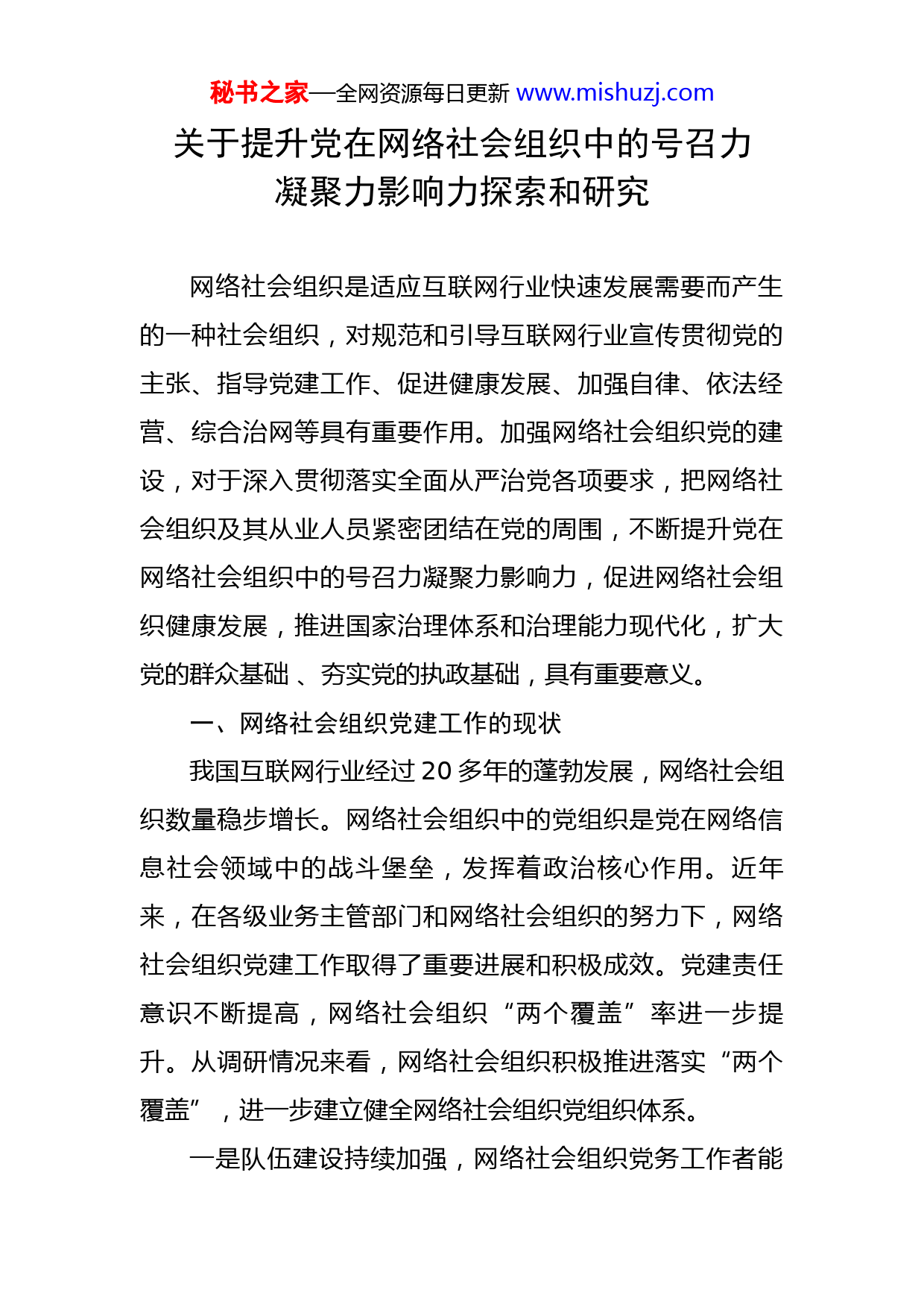 秘书之家—全网资源每日更新www.mishuzj.com关于提升党在网络社会组织中的号召力凝聚力影响力探索和研究网络社会组织是适应互联网行业快速发展需要而产生的一种社会组织,对规范和引导互联网行业宣传贯彻党的主张、指导党建工作、促进健康发展、加强自律、依法经营、综合治网等具有重要作用。加强网络社会组织党的建设,对于深入贯彻落实全面从严治党各项要求,把网络社会组织及其从业人员紧密团结在党的周围,不断提升党在网络社会组织中的号召力凝聚力影响力,促进网络社会组织健康发展,推进国家治理体系和治理能力现代化,扩大党的群众基础、夯实党的执政基础,具有重要意义。一、网络社会组织党建工作的现状我国互联网行业经过20多年的蓬勃发展,网络社会组织数量稳步增长。网络社会组织中的党组织是党在网络信息社会领域中的战斗堡垒,发挥着政治核心作用。近年来,在各级业务主管部门和网络社会组织的努力下,网络社会组织党建工作取得了重要进展和积极成效。党建责任意识不断提高,网络社会组织“两个覆盖”率进一步提升。从调研情况来看,网络社会组织积极推进落实“两个覆盖”,进一步建立健全网络社会组织党组织体系。一是队伍建设持续加强,网络社会组织党务工作者能秘书之家—全网资源每日更新www.mishuzj.com力水平进一步提升。网络社会组织党务工作者队伍相对年轻、富有活力。从党务工作者队伍来源看,主要有两个渠道:一方面是“外引”,通过党务骨干专场招聘、网络招聘等形式,多渠道多形式充实党务工作者队伍。另一方面是“内培”,根据队伍建设需要,有计划、分层次、分类别地对党务骨干进行培训,补齐队伍党务不精、能力不强的短板。从年龄结构上来看,目前网络社会组织党组织负责人大多在45至55岁之间,具有比较丰富的党建工作经验和较强的业务工作能力,在单位也比较有权威性;其他人员多为“80后”,占80%以上从学历结构上看,党务工作者具有本科以上学历的占85%以上。网络社会组织注重把优秀年轻骨干培养发展成党员,着力集聚入党积极分子。注重抓点带面,巩固网络社会组织党建工作的良好发展态势。网络社会组织联合会党委坚持以政治建设为统领,紧密联系网络社会组织业务多样、形态多元的实际情况,探索形成了领学、联学、互学经验做法,推动涉及13个领域的会员单位深入开展党建工作,体现出实事求是、大胆探索、以点带面、点面结合、稳步推进、纵深发展的特点,为推进网络社会组织党建工作作出有益探索,被机关工委列为党建工作典型案例。网络社会组织通过联合开展党建活动,加强不同单位间党建与业务的沟通和交流,这些创新探索推动网络社会组织党建工作呈现良好发秘书之家—全网资源每日更新www.mishuzj.com展态势。坚持党建引领,推进网络社会组织党的建设和业务工作融合发展。网络社会组织党组织坚持党建引领,积极探索党的建设和业务工作融合发展的途径和方式,发挥网络社会组织的桥梁纽带作用,统筹协调社会各方资源,强化行业自律和规范,凝聚网络社会组织力量,在抗击疫情、助力脱贫攻坚等方面取得重要实践成果。调研显示,网络文化协会党支部“建强堡垒把方向、创新培训促发展”,互联网行业联合党委创建“双线并进、重点发力”党建新模式,互联网发展联合会联合党委实施“六大工程”、打造“红色引擎”,信息协会党支部打造“1+1+N”群组党建、共绘“e网同心圆”等经验做法,体现了各县市区探索网络社会组织党建工作与业务工作融合发展、共同提升的时代性和创新性。注重服务大局,彰显网络社会组织党组织的组织力和号召力。网络社会组织党组织注重发挥政治引领作用,坚持以服务党和国家事业发展全局为出发点和落脚点,强化责任意识,坚决贯彻落实党中央决策部署。新冠肺炎疫情发生以来,全力做好疫情防控信息传播和舆论引导。网络社会组织联合会发布倡议书,号召各会员单位及广大网络社会组织、互联网企业把思想和行动统一到党中央决策部署上来,为坚决遏制疫情扩散、夺取防控斗争胜利贡献力量。网络社会组织联合会及时协调指导各网络社会组织以多种形式积极履行秘书之家—全网资源每日更新www.mishuzj.com社会责任,为打赢疫情防控阻击战贡献力量,以实际行动彰显网络社会组织的责任担当和大爱精神。二、网络社会组织党建工作存在的问题和短板网络社会组织党建工作目前存在的问题,主要表现在一些党组织未能充分发挥政治引领功能、党的组织体系还不够健全、党建工作质量有待提高、党建工作缺乏力量保障等方面。党组织的政治引领功能有待进一步发挥。党的十九大明确提出党的基层组织要突出政治功能,党章和《关于加强社会组织党的建设工作的意见(试行)》都强调了社会组织党组织的政治功能。然而,有些网络社会组织党组织在实际工作中只重视服务功能,而对党的政治功能履行得少了,跟在群众后面搞服务,时间久了就成了群众的尾巴,弱化了党组织的政影响力。调研中发现,有的网络社会组织党组织对自身定位和职责认识不够,对党建工作重视不够;有的网络社会组织存在党建与业务“两张皮”现象;有的网络社会组织党组织过度干预业务工作,忽略了把党的领导与网络社会组织依法自治相统一的原则。网络社