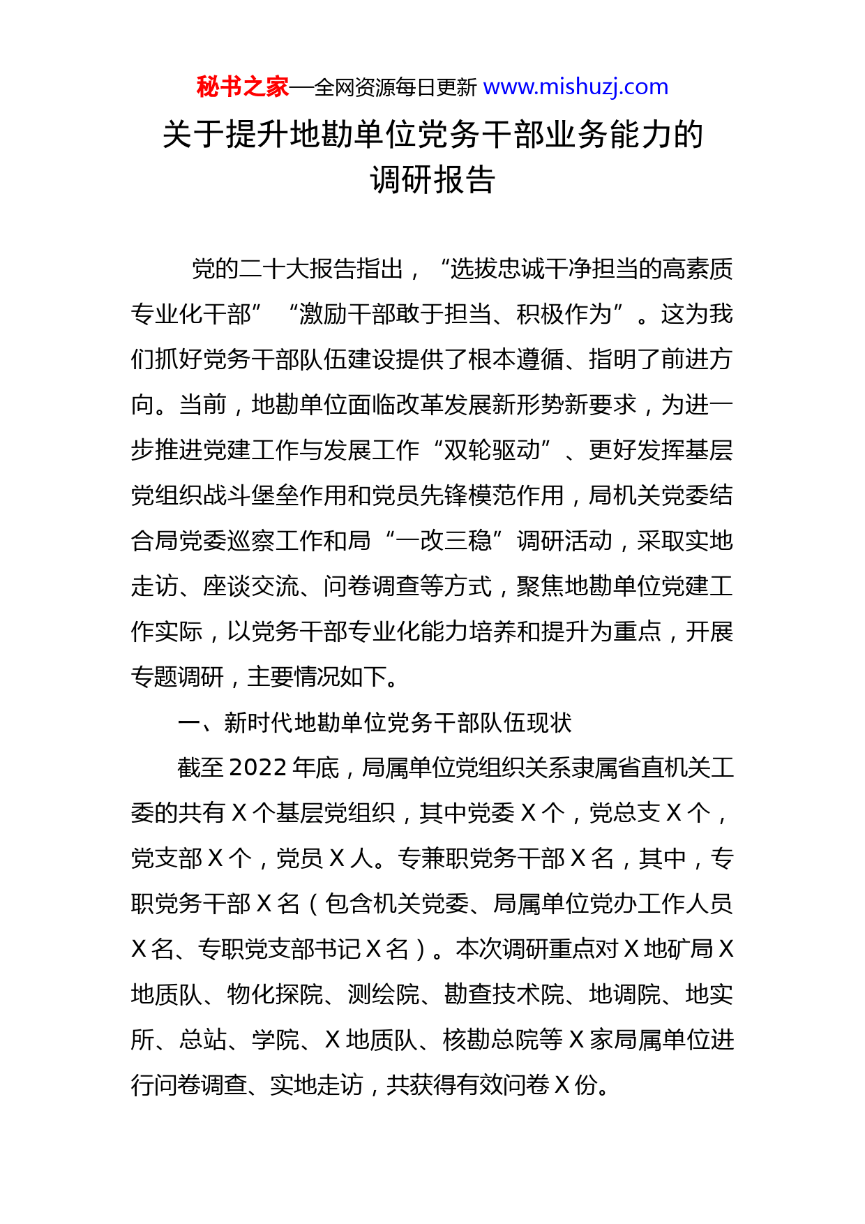 秘书之家—全网资源每日更新www.mishuzj.com关于提升地勘单位党务干部业务能力的调研报告党的二十大报告指出,“选拔忠诚干净担当的高素质专业化干部”“激励干部敢于担当、积极作为”。这为我们抓好党务干部队伍建设提供了根本遵循、指明了前进方向。当前,地勘单位面临改革发展新形势新要求,为进一步推进党建工作与发展工作“双轮驱动”、更好发挥基层党组织战斗堡垒作用和党员先锋模范作用,局机关党委结合局党委巡察工作和局“一改三稳”调研活动,采取实地走访、座谈交流、问卷调查等方式,聚焦地勘单位党建工作实际,以党务干部专业化能力培养和提升为重点,开展专题调研,主要情况如下。一、新时代地勘单位党务干部队伍现状截至2022年底,局属单位党组织关系隶属省直机关工委的共有X个基层党组织,其中党委X个,党总支X个,党支部X个,党员X人。专兼职党务干部X名,其中,专职党务干部X名(包含机关党委、局属单位党办工作人员X名、专职党支部书记X名)。本次调研重点对X地矿局X地质队、物化探院、测绘院、勘查技术院、地调院、地实所、总站、学院、X地质队、核勘总院等X家局属单位进行问卷调查、实地走访,共获得有效问卷X份。秘书之家—全网资源每日更新www.mishuzj.com调研发现地勘单位专职党务干部较少,大部分单位党务干部为兼职。调查对象中,有X%认为本单位基层党组织是围绕单位中心任务开展工作的,X%认为所在单位基层党务干部队伍配备较强,党务干部队伍比较稳定。近年来,局属单位积极开展“基层党组织标准化规范化建设”“党支部提升行动”“模范机关”建设、“双争一创”行动、党建和业务“双优”党支部建设等活动,建立健全基层党支部工作联系点制度,以提升党务干部能力为重点,加强经常性教育培训,有效激发了党务干部“想干事、能干事、干成事”的内生动力。二、地勘单位党务干部专业化能力提升面临的问题(一)重视程度有待进一步加强。X地矿局党委高度重视党建工作,局党委书记始终把贯彻落实全面从严治党作为“第一职责”,把抓好基层党建作为“第一责任”。然而,局属单位特别是二级实体单位,个别基层党组织主要负责人重视程度不够到位,只是对党务干部建设“面上”比较重视,并没有对如何提升党务干部专业化能力提出有针对性、可操作性的举措。多数党务干部是兼职,特别是基层党支部书记没有专门职数,待遇无法解决,于是,他们在争先创优中常有等待或观望情绪,缺乏解决问题的主动性。(二)规范管理还需进一步优化。我局地勘单位多在秘书之家—全网资源每日更新www.mishuzj.com野外一线实施项目,项目施工特殊性使党务工作出现了两大难题:一是项目点多面广线长,党务干部集中管理难。根据局经济发展处2022年统计数据,局属地勘单位项目遍布全国各地,有的远至新疆克拉玛依乌尔禾区。项目工地现场大多远离所在单位,甚至远离项目部(组)驻地,直线距离平均在百公里以上,工作和生活条件都比较艰苦。二是项目地域流动性大,党务干部时间和精力受限。项目工期基本是2-6个月,多数项目在1年内即可完工,个别的则需要3-5年,甚至更长时间。项目均在动态建设中,临时组合多、转场频率高、分散流动性大,有时需要多个点同时展开。基层党务干部有时分布在各个项目部(组),项目施工多是两班倒,工作时长大多在10小时以上。这些特点使党务干部缺乏固定时间,不能及时更新自身思想认识和专业能力,有时无法积极参与基层党组织集中学习。因此,在日常管理中,党务干部容易产生以传统眼光看待事物,用已有经验“套用”现有党建工作实际的情况。(三)工作方法还需进一步改进。相较党务工作而言,地勘单位专业技术工作是存在定量的指标体系,指标是有形的,结果是看得见、摸得着的,容易务实。然而,党务工作想要务实,存在以下挑战:工作方法创新不到位。当前,“互联网+”在经济社会发展中的地位越来越重秘书之家—全网资源每日更新www.mishuzj.com要。但地勘单位部分党务干部特别是经常性开展野外一线工作的兼职党务干部,不会使用新媒体等在线平台开展工作;有的因长期身处山野,无法通过网络把分散在一线的党员集中起来开展学习,工作方式比较单一,分析、解决问题的能力存在短板。再如,有的党务干部自己把自己忙得团团转,到头来还得不到别人的理解。这些现象一定程度上说明,我们没能把党务工作做实,还不够“接地气”,在和单位实际业务工作衔接上存在“隔靴捎痒”的现象。究其根源,还是工作方法出了问题,党务工作抓得还不够“实”。(四)攻坚精神还需进一步提升。新时代机关党建的核心任务是“围绕中心、建设队伍、服务群众”。从各个地勘单位的角度来说,就是为本单位的改革发展提供政治、组织和人才保障。但在实际工作中会遇到一些困难,主要表现有:一是少数党务干部缺乏“学”的毅力、“钻”的劲头,党性意识和业务能力不够强。二是个别党务干部围绕中心干事创业激情有所消退。比如,有的对地勘行业的前景忧虑、对所在单位面临改革的情绪消极,患得患失,畏首畏尾;有的对党员情绪波动和心态变化疏导不够及时,致使党员放松了自我要求,在民主评议中等次也不高,陷入“恶性循环”。三、地勘单位提升党务干部专业化能力的对策和建议秘书之家—