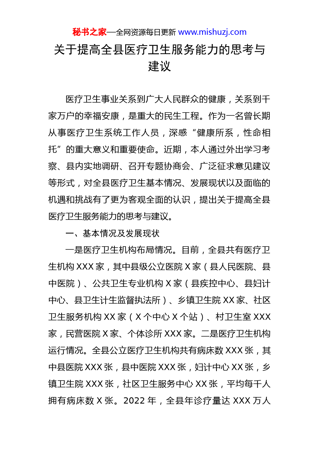 秘书之家—全网资源每日更新www.mishuzj.com关于提高全县医疗卫生服务能力的思考与建议医疗卫生事业关系到广大人民群众的健康,关系到千家万户的幸福安康,是重大的民生工程。作为一名曾长期从事医疗卫生系统工作人员,深感“健康所系,性命相托”的重大意义和重要使命。近期,本人通过外出学习考察、县内实地调研、召开专题协商会、广泛征求意见建议等形式,对全县医疗卫生基本情况、发展现状以及面临的机遇和挑战有了更为客观全面的认识,提出关于提高全县医疗卫生服务能力的思考与建议。一、基本情况及发展现状一是医疗卫生机构布局情况。目前,全县共有医疗卫生机构XXX家,其中县级公立医院X家(县人民医院、县中医院)、公共卫生专业机构X家(县疾控中心、县妇计中心、县卫生计生监督执法所)、乡镇卫生院XX家、社区卫生服务机构XX家(X个中心X个站)、村卫生室XXX家,民营医院X家、个体诊所XXX家。二是医疗卫生机构运行情况。全县公立医疗卫生机构共有病床数XXX张,其中县医院XXX张,县中医院XXX张,妇计中心XX张,乡镇卫生院XXX张,社区卫生服务中心XX张,平均每千人拥有病床数X张。2022年,全县年诊疗量达XXX万人秘书之家—全网资源每日更新www.mishuzj.com次,年住院X万人次,医疗总收入X亿元。三是医疗卫生队伍建设情况。全县医疗卫生单位共有卫生专业技术人员XXXX人,平均每千人拥有卫生专业技术人员X人,核定医疗卫生单位事业编制XXX名,正式在岗XXX人,临聘人员XXX人,大学及以上学历XXX人、占XX%,副高级以上职称占XX%,平均年龄XX岁;村医XXX人,其中55岁以上占XX%,中专及以下学历XX人、占XX%。2022年培训进修XX人、占正式在岗人员的XX%;近5年共招录医疗卫生人才XX人,其中民生项目考录XX人、人才引进XX人,辞职离职XX人。四是医共体建设进展情况。按照上级部门关于深化医改的部署安排,制定印发了《XX县紧密型县域医疗卫生共同体及慢性病医防融合新模式建设试点工作实施方案》,成立了县域医共体管理委员会,组建以县人民医院为牵头医院的医共体联盟医院,选配联盟医院领导班子,健全医共体联盟医院章程(草案)、医疗质量管理等相关工作制度,县域医共体建设各项工作有序推进。二、全县医疗卫生事业发展面临的机遇与挑战随着中央和省市县一系列政策的陆续出台,全县的卫生健康事业也面临着难得的机遇:从推进健康中国建设的决策部署来看,中央把健康中国建设上升为国家战略,并出台《“健康中国2030”规划纲要》,省XX市上也印发秘书之家—全网资源每日更新www.mishuzj.com了《“健康XX2030”规划纲要》《“健康XX2030”规划纲要》,这些政策势必为发展卫生与健康事业释放重大政策红利,势必激发多样化、差异化的健康服务需求。从卫生与健康事业的发展趋势来看,随着经济社会发展水平的不断提高,人们更加重视生命质量和健康安全,不但期盼能看得上病、看得好病,更期盼能不得病、少得病,看病更舒心、服务更体贴,这些都为卫生与健康事业发展开拓了新的空间。同时,我们也清醒地认识到深化医改已进入“深水区”和攻坚期,全县医疗卫生服务水平与人民群众对健康的需求还存在一定差距,面临着诸多挑战,主要表现在:县域内医疗机构功能定位不明确,特色专科不突出,存在医疗资源的重复建设、局部性浪费和互相竞争病员现象;实施基本药物制度后,基层医务人员思想认识上存在误区,影响了工作积极性;全县医疗卫生队伍整体素质不高、学历低,人才结构不合理,乡镇卫生院和社区卫生服务中心临床医务人员少、临聘人员多,人员稳定性差,难以长期培养使用;高职称、高学历的人才引进难度大,且流失严重,专业人才紧缺问题得不到解决;全县村医老龄化现象比较突出、且学历低,也面临着“后继无人”的问题;县域医共体内部资源均衡配置和共享优化的体制机制不够健全、相关部门协同联动推进工作合力不够等。秘书之家—全网资源每日更新www.mishuzj.com三、提高全县医疗卫生服务能力的几点建议(一)统一思想提高认识,不断优化医疗卫生发展环境。一是健全体制机制。县卫健局、各医疗卫生机构要加强组织领导,明确职责分工,各司其职,相互配合,全力推动各项工作任务落实。二是注重规划引领。科学编制卫生事业发展规划,明确发展战略、功能定位和发展目标,在确保基本医疗服务的前提下,发展优质医疗资源,努力实现特色突出、优势互补、错位发展。三是营造浓厚氛围。广泛宣传政策,树立正确的用药就医观念,营造良好的社会环境和舆论氛围。(二)创新人才引进机制,不断加强医疗队伍建设。一是灵活性引进。重点落实“三个一批”:对急需紧缺学科人才,只要专业对口,不限学历层次,积极招录一批;对重点院校医学专业高层次人才,制定出台人才引进优惠政策,通过政策激励吸引一批;对高精尖领军型人才,借力国家和省市对口帮扶政策,强化与上级医疗机构多方位的紧密合作,努力争取签约一批,切实缓解医疗技术人才严重不足问题。二是针对性培养。创新组织岗位提升、交流学习、学术研究等培训活动,在全面提升医疗卫生队伍整体能力的基础上,有针对性地委托培养一批学科带头人、骨干医师、青年创新型卫生技术人才。三是规范化管理。全面推行科学化、精细化、专业化管理,不断增强医秘书之家—全网资源每日更新www.mishuzj.
