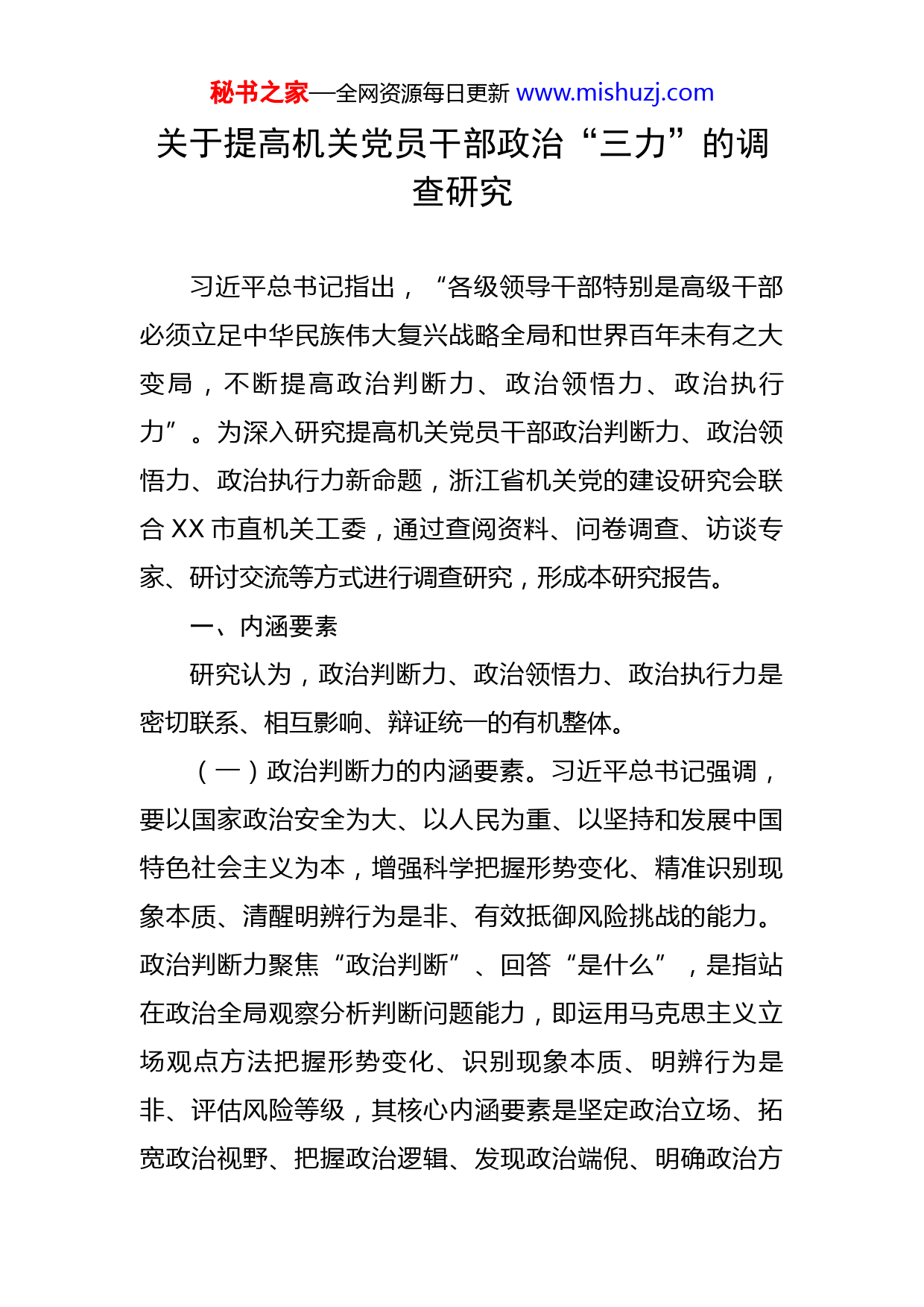 秘书之家—全网资源每日更新www.mishuzj.com关于提高机关党员干部政治“三力”的调查研究习近平总书记指出,“各级领导干部特别是高级干部必须立足中华民族伟大复兴战略全局和世界百年未有之大变局,不断提高政治判断力、政治领悟力、政治执行力”。为深入研究提高机关党员干部政治判断力、政治领悟力、政治执行力新命题,浙江省机关党的建设研究会联合XX市直机关工委,通过查阅资料、问卷调查、访谈专家、研讨交流等方式进行调查研究,形成本研究报告。一、内涵要素研究认为,政治判断力、政治领悟力、政治执行力是密切联系、相互影响、辩证统一的有机整体。(一)政治判断力的内涵要素。习近平总书记强调,要以国家政治安全为大、以人民为重、以坚持和发展中国特色社会主义为本,增强科学把握形势变化、精准识别现象本质、清醒明辨行为是非、有效抵御风险挑战的能力。政治判断力聚焦“政治判断”、回答“是什么”,是指站在政治全局观察分析判断问题能力,即运用马克思主义立场观点方法把握形势变化、识别现象本质、明辨行为是非、评估风险等级,其核心内涵要素是坚定政治立场、拓宽政治视野、把握政治逻辑、发现政治端倪、明确政治方秘书之家—全网资源每日更新www.mishuzj.com向。(二)政治领悟力的内涵要素。习近平总书记指出,领导干部特别是高级领导干部担的是政治责任,必须对党中央精神深入学习、融会贯通,坚持用党中央精神分析形势、推动工作,始终同党中央保持高度一致。政治领悟力聚焦“政治领悟”、回答“为什么”,是指运用政治眼光分析、领会和把握中央精神能力,即对“国之大者”能了然于胸,明确自身职责定位,自觉与党中央保持高度一致,其核心内涵要素是对中央精神深学细研、领会把握、融会贯通、分析运用、指导工作。(三)政治执行力的内涵要素。习近平总书记要求,领导干部特别是高级干部要经常同党中央精神对表对标,切实做到党中央提倡的坚决响应、党中央决定的坚决执行、党中央禁止的坚决不做,坚决维护党中央权威和集中统一领导,做到不掉队、不走偏,不折不扣抓好党中央精神贯彻落实。政治执行力聚焦“政治执行”、回答“怎么做”,是指自觉同党的基本理论、基本路线、基本方略对表对标,抓好党的大政方针、重大决策部署落地生根、开花结果的能力,其核心内涵要素是做到“两个维护”、坚决令行禁止、坚持底线思维、秉持问题导向、强化责任意识。二、主要特点秘书之家—全网资源每日更新www.mishuzj.com研究认为,机关的特殊性决定了机关党建政治判断力、政治领悟力、政治执行力除前述共性内涵要素外,还有以下鲜明的特点。(一)高度的政治性。党政机关没有脱离政治的业务,也没有脱离业务的政治。党政机关是贯彻落实党中央和同级党委政府决策部署、推进现代化建设的“参谋部”“指挥部”,虽职责分工不同,但都是政治机关,政治性是根本属性,政治意识是首位意识。机关人员一言一行、一举一动都有政治、都要讲政治,只有不断提高政治判断力、政治领悟力、政治执行力,才能真正在政治上实起来、硬起来、强起来,才能更好担负党和人民赋予的神圣使命,也才能永葆政治本色。(二)丰富的实践性。讲政治是具体的,提高政治判断力、政治领悟力、政治执行力不是一句“空洞口号”,也不是一个“虚化概念”,而是具有鲜明的实践性,最终都要体现在坚决贯彻党中央决策部署和党的路线方针政策的实际行动上,体现在履职尽责、做好本职工作的实效上,体现在机关党员、干部的日常言行上。一个党组织和党员干部如果只把提高政治判断力、政治领悟力、政治执行力贴在墙上、停留在嘴上、不落在行动上,这本身就是不讲政治、不守政治规矩、政治判断力政治领悟力政治执行力不高的表现。秘书之家—全网资源每日更新www.mishuzj.com(三)全面的统领性。党的十八大以来,党的政治建设取得重大历史性成就。但从查处的一些问题分析,有的机关党组织和党员干部还存在忽视政治、淡化政治、不讲政治,在党不言党、在党不为党、在党不护党的现象。提高政治判断力、政治领悟力、政治执行力是党的政治建设各项要求的最高度概括、最集中展现、最重要内核,发挥着提纲挈领的统领作用。不难想象,如果各级机关党员干部政治判断力、政治领悟力、政治执行力高,机关党员干部不讲政治、不守政治规矩的现象将不复存在,就能科学应对“四大考验”、有效防范“四种危险”。三、问题原因研究认为,提高机关党员干部政治判断力、政治领悟力、政治执行力存在的问题及原因主要有以下方面。(一)加强政治理论学习有“温差”。有的党组织在政治理论学习的部署安排、检查落实、考核评估上缺乏系统谋划、整体安排,专用教材、课程开发较薄弱;在学习形式、手段和方法上存在老套单一问题。有的机关党员干部在政治理论学习方面没有“把自己摆进去”,主动性不强、参与度不高、系统性不够。调查发现,“温差”表现排在第一位的是时紧时松,排在第二位的是脱离实际、各取所需、知行脱节,排在第三位的是不够主动、被动应付,排在第四位的是浅尝辄止、不求甚解。据统计,存在秘书之家—全网资源每日更新www.mishuzj.com“温差”的原因,认为是组织学习形式单一