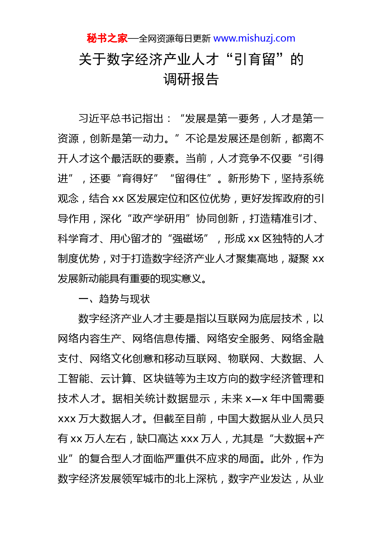 秘书之家—全网资源每日更新www.mishuzj.com关于数字经济产业人才“引育留”的调研报告习近平总书记指出:“发展是第一要务,人才是第一资源,创新是第一动力。”不论是发展还是创新,都离不开人才这个最活跃的要素。当前,人才竞争不仅要“引得进”,还要“育得好”“留得住”。新形势下,坚持系统观念,结合xx区发展定位和区位优势,更好发挥政府的引导作用,深化“政产学研用”协同创新,打造精准引才、科学育才、用心留才的“强磁场”,形成xx区独特的人才制度优势,对于打造数字经济产业人才聚集高地,凝聚xx发展新动能具有重要的现实意义。一、趋势与现状数字经济产业人才主要是指以互联网为底层技术,以网络内容生产、网络信息传播、网络安全服务、网络金融支付、网络文化创意和移动互联网、物联网、大数据、人工智能、云计算、区块链等为主攻方向的数字经济管理和技术人才。据相关统计数据显示,未来x—x年中国需要xxx万大数据人才。但截至目前,中国大数据从业人员只有xx万人左右,缺口高达xxx万人,尤其是“大数据+产业”的复合型人才面临严重供不应求的局面。此外,作为数字经济发展领军城市的北上深杭,数字产业发达,从业秘书之家—全网资源每日更新www.mishuzj.com人员薪资待遇高,已经形成了区域人才聚集效应和虹吸效应。相比之下,与xx近邻的xx,面临着难以吸引人才、聚集人才和留住人才的困境。20xx年xx月xx日,在xx市人才办统筹指导下,xx市电子信息与大数据人才创新创业联盟(以下简称“联盟”)落户xx区,成为唯一在中心城区落户的市级产业人才创新联盟。联盟由xx区、xx大学、xx财经大学、xx师范大学、xx市大学软件学院以及xxx计算有限公司、xx有限公司等xxx余家京津冀及沪深等多省市领军企业、院校共同发起成立。联盟旨在整合高校、企业等各类要素资源,形成大数据人才培养、技术研发、成果转化、推广应用的全链条产业生态,为xx市数字经济产业发展提供动力。截至xx年x月,新八大里数字经济产业聚集区已入驻企业xxx家,在xx区注册企业xxx家,其中规上企业xx家,涵盖电商、金融、技术、健康等多个板块;实现营业收入xx.x亿元,税收达xxxx万元,产业影响不断扩大,初步建成xx市数字经济发展特色示范区。二、做法与经验1.主要做法。一是完善工作机制。建立联盟成员单位周例会、月推进会、重点工作定期报送等工作机制,联盟每月至少开展x次人才论坛、x次企业对接交流活动,定期开展人才、技术、研发等需求征集对接活动。做实秘书处工秘书之家—全网资源每日更新www.mishuzj.com作机制,在数字经济产业创新中心(xx大厦)派驻x名工作人员,专门从事项目对接、人才引进、政策落实等为企业提供“点对点”“上门式”服务。二是强化政策支撑。xx区研究制定了关于进一步加快集聚高端人才行动计划方案和《xx区引进培育电子信息与大数据人才实施办法》。建立完善重点项目人才引进目录,有针对性地引进区域发展急需的大数据顶尖人才、领军人才、企业经营管理人才、优秀青年从业人才等,做到精准引智、分类施策、科学管理。三是丰富联盟生态。一方面着力引入高校及相关产业企业,扩大联盟现有成员数量;另一方面着力推进联盟向科技创新平台、金融机构等领域拓展,为产业的持续稳定发展提供全方位、多层次的服务支撑。联盟成立后,又有x所高校及职业学院、x个校友会、x个市级科创中心、x家银行、xx余家企业单位相继加入,现已聚集了西安交通大学等x所高校、xxx余家领军企业、x位院士特聘专家。四是促进融合发展。联盟成立以来,先后组织开展大数据产业峰会、校企对接会、银企对接会、联盟企业项目推介会等xx余场活动。加强区校合作,撮合高校和联盟企业“张揭榜”x个,帮助企业解决发展难题。争取到xxeBay全国跨境电商创新创业大赛(华北赛区)落户xx区举办,xx个省市、xx所院校、xxxx支团队、超过xxxx秘书之家—全网资源每日更新www.mishuzj.com名学生报名参赛,集聚吸引从事跨境电商的高端人才来津。依托第五届世界智能大会,在xx平行论坛、十大产业人才创新创业联盟新闻发布会上,发布重磅技术成果———“海河智链”,先后与航天软件评测xx中心等xx家企业代表签约,目前项目均已落地,投资总额超x亿元,预计年产值xx亿元,带动就业近千人,进一步提升了联盟的影响力和知名度。2.主要经验。一是党建聚才。xx区在大力支持和推进大数据发展的同时,引导企业加强党建引领,突出党建“红色引擎”作用,强化高素质人才政治归属感和身份认同感。比如,xx落户xx市xx区网信大厦后,及时成立了党支部;xx(xx)医疗科技有限公司在线下养老服务中,注重党员亮身份、亮承诺;xx津贸通xx贸易集团在招聘时,强调党员优先;众娱传媒(xx)文化股份有限公司运用大数据手段提升党建科学化水平,着力打造“智慧党建”。二是产业引才。聚焦互联网企业关注的诸多问题,制定了《关于支持新八大里数字经济产业聚集区建设的若干措施》,调整相关财税支持政策,以xx大厦、xx大厦、xx产业园等楼宇为载体,加快推进新八大里商务商业区数字经济产业聚集发展,对大数据企业产生了一定的虹吸效应,大数据人才也随之而来。秘书之家—全网资源每日更新www.mishuzj.com三是环境留才。xx区针对大数据人才特点,围绕xx大厦、xx大厦、xx自创区