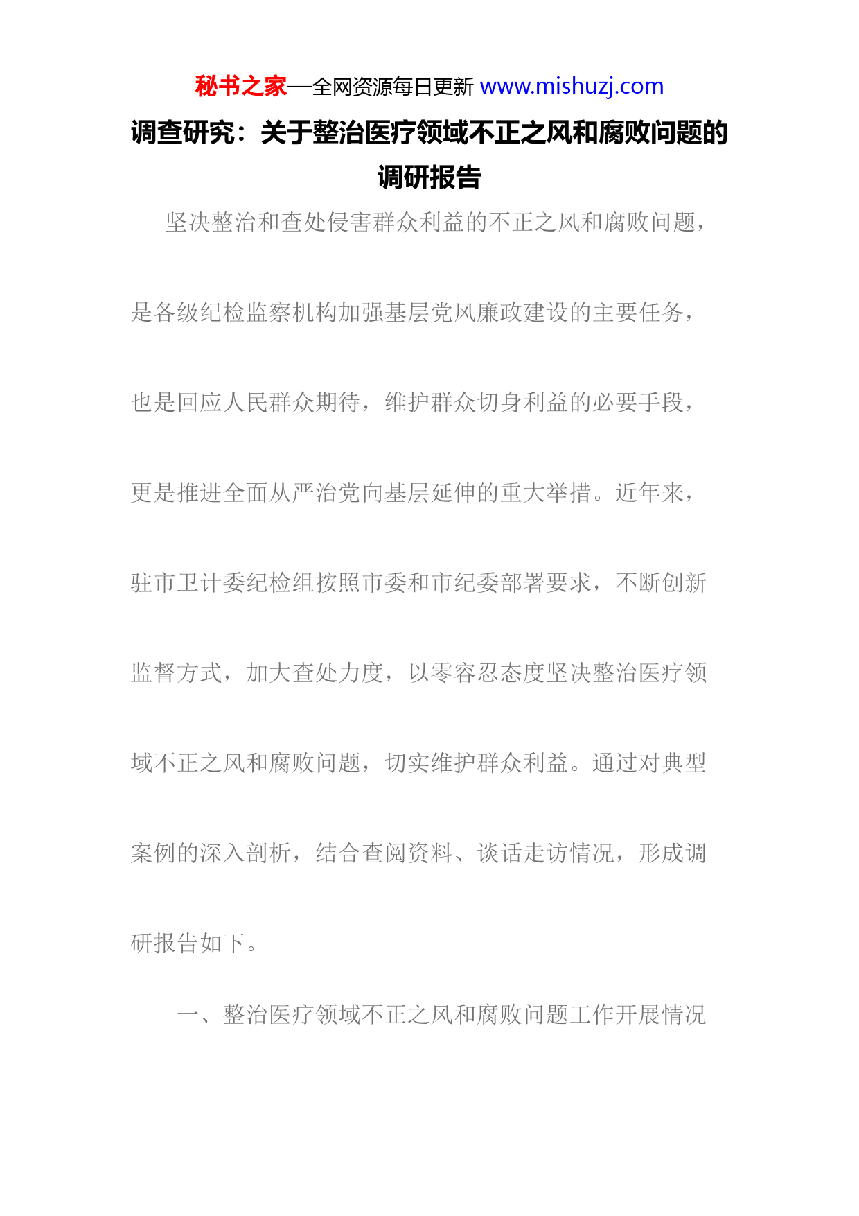 秘书之家—全网资源每日更新www.mishuzj.com调查研究:关于整治医疗领域不正之风和腐败问题的调研报告坚决整治和查处侵害群众利益的不正之风和腐败问题,是各级纪检监察机构加强基层党风廉政建设的主要任务,也是回应人民群众期待,维护群众切身利益的必要手段,更是推进全面从严治党向基层延伸的重大举措。近年来,驻市卫计委纪检组按照市委和市纪委部署要求,不断创新监督方式,加大查处力度,以零容忍态度坚决整治医疗领域不正之风和腐败问题,切实维护群众利益。通过对典型案例的深入剖析,结合查阅资料、谈话走访情况,形成调研报告如下。一、整治医疗领域不正之风和腐败问题工作开展情况秘书之家—全网资源每日更新www.mishuzj.com20XX年4月驻市卫计委纪检组组建成立后,在市纪委的坚强领导下,紧紧围绕市纪委关于派驻机构25项职责,及时向市纪委二室、四室、案管室、信访室、党风政风室等请示报告工作,认真履行工作职责。纪检组现有工作人员5人(其中纪检组长、副巡视员、副组长、副处级调研员、主任科员各1人)。负责监督市卫计委和市红十字会两家单位,两家单位共有处级以上干部233人(其中局级干部10人,处级干部223人);监察对象4093人。派驻以来,纪检组共收到纪内问题线索181件(不含重复件),立案查处侵害群众利益的不正之风和腐败问题18件,给予党纪政务处分18人,清退违规资金504万余元。秘书之家—全网资源每日更新www.mishuzj.com二、医疗领域不正之风和腐败问题的主要表现形式(一)药品回扣问题依然存在从1998年开始,“医药代表”这一新的概念首次进入中国医药行业,因为相关的法制不健全,相当一部分“代表”采用不正当的手段竞争,逐步成了医疗卫生行业商业贿赂的主力军。各类药商把目光盯在医疗单位的主管领导、药剂科采购人员和有处方权的医生身上,他们通过邀请主管领导、采购人员和医务人员参加各类带有旅游娱乐形式的学术会议、馈赠礼品、红包,甚至直接按开药情况给付回扣的方式进行促销,让医生多开药。2017年,“药品零加成”政策全面实施,但医药利益链并未完全切开。一方秘书之家—全网资源每日更新www.mishuzj.com面,药品零加成给公立医院带来的亏损,政策扶持和医疗服务价格调整对医院收入带来的损失弥补不足的情况下,医院可能会让患者多住院或者多提供服务增加患者的就医支出,这又会造成“以检补医”或过度医疗的问题。甚至还出现医院二次议价回扣转移模式。另一方面,药品最终的使用仍然是由有处方权的医生决定的,为了提高药品的销量,药商甚至会加大刺激医生用药的力度。医生开药的积极性不减的话,药品的用量也就没有理由减少。如:2018年5月媒体报道的,作为山东省首批取消药品加成试点的新泰市人民医院,为了保留差价和增加医院收入,竟采取“特殊手段”收受国内某大型医药公司给予秘书之家—全网资源每日更新www.mishuzj.com的回扣款共49182188元。经法院判决,新泰市人民医院被认定为“单位受贿”,医院时任党委书记、院长陈某某因犯单位受贿罪以及受贿罪,执行有期徒刑共六年,并处罚金人民币40万元。我市某医院一线医生实名举报该院副院长、科主任收受药品回扣问题,纪检组在深入医疗单位督查中发现的医院临时采购药品不严格按程序执行,批次过多,药事委员会形同虚设、长期不开会等问题,都暴露出药品采购、使用领域腐败风险依然存在。(二)医疗器械、耗材、试剂采购使用领域违规违纪隐患和风险较大秘书之家—全网资源每日更新www.mishuzj.com虽然药品回扣问题依然存在,但随着医改的持续深化,药品供应保障制度逐步建立健全,药品购销和使用秩序日趋规范,利用药品谋利的操作空间在不断压缩,一些不法药品生产、流通、销售企业就将手伸向设备和医用耗材市场,商业贿赂嫌疑、使用与个人收入挂钩、医用耗材与设备捆绑销售等问题时有出现。有的供应商假借设备捐赠、借用、租赁、置换、升级等形式捆绑销售耗材(试剂),规避公开招标,长期占领医疗市场。还有一些大型医疗器械公司依托市场垄断地位,设备维保费用居高不下。如:我市某医院麻醉科主任吴某某在麻醉科镇痛泵及麻醉穿刺秘书之家—全网资源每日更新www.mishuzj.com包使用中,未按工作程序书面申请,耗材未按规定送达设备科验收登记而直接送入麻醉科。(三)招标代理机构选取工作易发生廉洁风险目前,市卫计委直属各单位的医药器械耗材和基建工程类招标都采取部门集中采购、分散采购和自行采购等方式。每年各单位采取单位内部议标的形式,选择在陕西省财政厅备案的社会代理机构中建立招标代理机构库,每次招标采购时从社会代理机构库中抽取一家负责招标工作。通过调研我们发现,当前市卫计委直属单位在招标代理机构选取工作中还存在着公开程度不够、选入招标代理机构库的招标代理机构过少、在招标过程中没有招标代理机构秘书之家—全网资源每日更新www.mishuzj.com参与,监督不够等问题。如:多数单位选入招标代理机构库的招标代理机构过少。只有1家直属单位选取了7家,其他直属单位均为6家以下,最少的直属单位才2家。选取招标代理机构过程也不够公开透明。多数单位在选取招标代理机构时采用由各单位内部人员抽签抓阄决定,未邀请招标代理机构人员参与和上级监督部门现场监