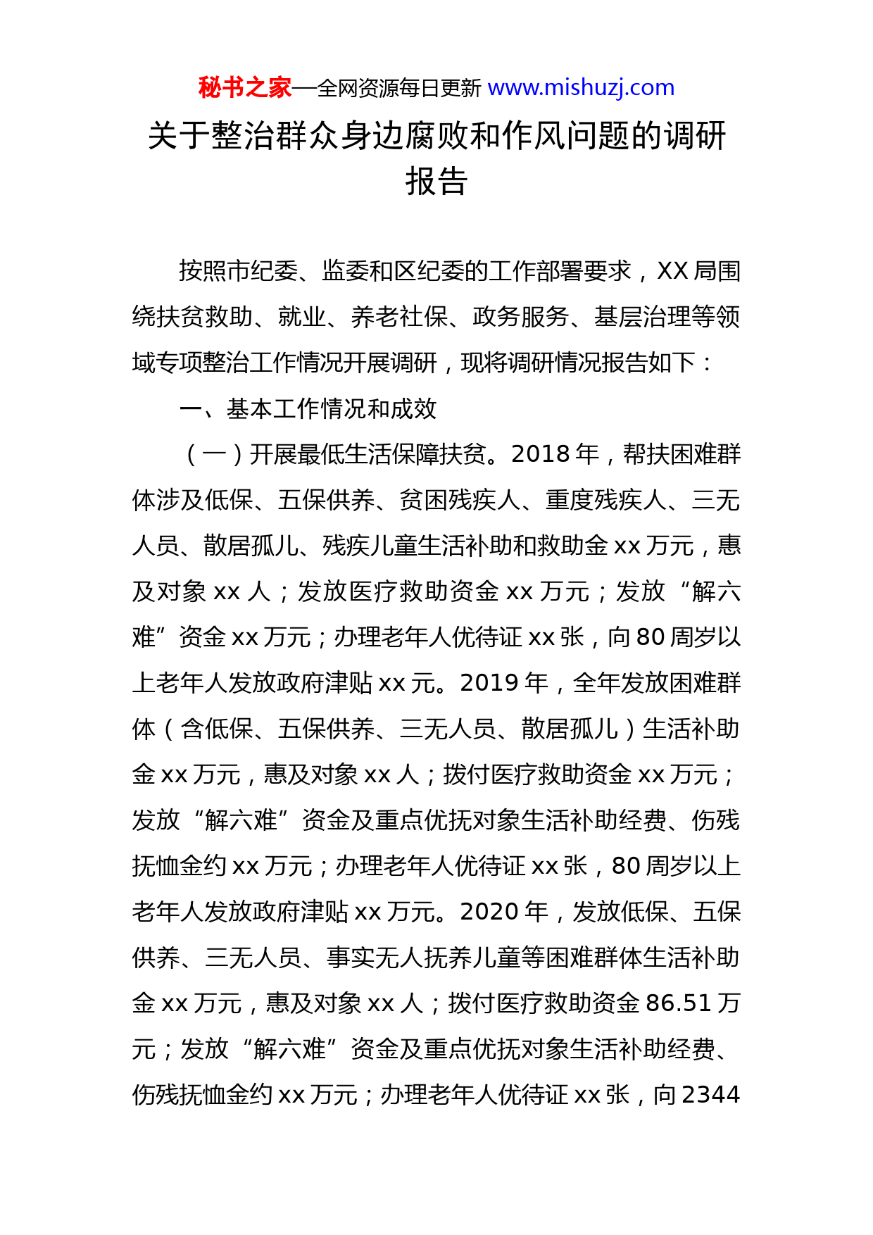 秘书之家—全网资源每日更新www.mishuzj.com关于整治群众身边腐败和作风问题的调研报告按照市纪委、监委和区纪委的工作部署要求,XX局围绕扶贫救助、就业、养老社保、政务服务、基层治理等领域专项整治工作情况开展调研,现将调研情况报告如下:一、基本工作情况和成效(一)开展最低生活保障扶贫。2018年,帮扶困难群体涉及低保、五保供养、贫困残疾人、重度残疾人、三无人员、散居孤儿、残疾儿童生活补助和救助金xx万元,惠及对象xx人;发放医疗救助资金xx万元;发放“解六难”资金xx万元;办理老年人优待证xx张,向80周岁以上老年人发放政府津贴xx元。2019年,全年发放困难群体(含低保、五保供养、三无人员、散居孤儿)生活补助金xx万元,惠及对象xx人;拨付医疗救助资金xx万元;发放“解六难”资金及重点优抚对象生活补助经费、伤残抚恤金约xx万元;办理老年人优待证xx张,80周岁以上老年人发放政府津贴xx万元。2020年,发放低保、五保供养、三无人员、事实无人抚养儿童等困难群体生活补助金xx万元,惠及对象xx人;拨付医疗救助资金86.51万元;发放“解六难”资金及重点优抚对象生活补助经费、伤残抚恤金约xx万元;办理老年人优待证xx张,向2344秘书之家—全网资源每日更新www.mishuzj.com名80周岁以上老年人发放政府津贴共xx万元。2021年,发放低保、五保供养、三无人员、事实无人抚养儿童等困难群体生活补助金xx万元,惠及对象xx人次;发放“解六难”资金及重点优抚对象生活补助经费、伤残抚恤金约xx万元;办理老年人优待证xx张,向xx名80周岁以上老年人发放政府津贴共xx万元。(二)开展社保扶贫。2018年,完成城乡居民基本养老保险缴费任务xx人,基本医疗保险覆盖率达xx%。办理失业稳岗补贴企业xx家,涉及人数约xx万人,补贴金额约xx万元。推动社保扶贫,截止x月底,为区内贫困人员代缴基本医疗保险xx人、基本养老保险xx人。2019年,完成城乡居民养老和医疗保险任务xx人。发放失业稳岗补贴约xx万元,惠及xx万人。全区xx名困难群众享受到城乡居民养老保险待遇。2020年,完成城乡居民养老和医疗保险任务xx人。为xx人发放失业补助金,发放任务数xx人,完成率xx%,发放金额xx万元。对领取失业保险金和失业补助金人员发放的价格临时补贴合计xx元。2021年,完成城乡居民养老保险任务xx人,医疗保险任务xx人。医疗救助xx人次,救助金额xx万元;异地就医联网结算xx人次,救助金额xx万元。(三)开展就业扶贫。2018年,全年城镇新增就业人数xx人,城镇失业人员实现再就业xx人,就业困难人员秘书之家—全网资源每日更新www.mishuzj.com实现就业xx人;接收并安置了4名省“三支一扶”高校毕业生。发放就业创业、技能晋升培训补贴xx万元,惠及人数xx人次;2019年,城镇新增就业xx人,失业人员实现再就业xx人,就业困难人员实现就业xx人;创业人数xx人,创业带动就业xx人,转移农村劳动力xx人。共计发放就业创业培训补贴xx万元,惠及xx人次。2020年,城镇新增就业xx人,失业人员实现再就业xx人,就业困难人员实现就业xx人。外省贫困劳动力返岗就业人数xx人,受理吸纳建档立卡贫困劳动力就业补贴xx人,补贴金额共计xx万元。落实政策扶持就业,发放各类就业创业补贴约xx万元;发放各类培训补贴xx万元,惠及xx万人。2021年,城镇新增就业xx人,失业人员实现再就业xx人,就业困难人员实现就业xx人。落实政策扶持就业,发放各类就业创业补贴xx万元惠及xx人,发放创业担保贷款xx万元。(四)开展慈善救助。2018年,开展专项救助行动,向xx名特殊困难务工人员发放救助金xx万元;开展扶贫济困日活动共募集善款约xx万元。2019年,开展专项救助行动,向xx名特殊困难务工人员发放救助金xx万元;开展扶贫济困日活动共募集善款约xx万元;2020年,开展专项救助行动,向xx名特殊困难务工人员发放救助金xx万元;开展扶贫济困日活动共募集善款约xx万元,积秘书之家—全网资源每日更新www.mishuzj.com极参与我区新型冠状病毒感染的肺炎疫情防控,共筹集款物xx万元,拨付款物合计xx万元。2021年,实施困境家庭居家改造项目,已完成共计xx户的困境家庭的项目改造,共投入资金xx万元,共救助城乡困难居民、异地务工人员及其残疾子女xx人,拨付救助金xx万元。二、整治领域突出问题(一)整治就业领域突出问题。(1)针对就业创业培训资金方面。2018-2020年,发放了xx人次xx万元……(2)针对公益性岗位补助资金方面。2018-2020年,发放了xx人次xx万元……(二)整治养老社保领域突出问题。(1)针对社保业务问题专项治理方面。xx年xx月,成立“xxxx社会保险基金管理问题专项整治领导小组”,制订《xxxx社保险基金管理风险排查工作实施方案》,严格按照计划完成自查。(2)针对困难群众精准救助方面。xx年xx月,对全区在保困难家庭开展入户核查工作,对符合特困条件的低保单人户及时纳入特困,并对在保的相对贫困户进行入户核查,及时发现困难群众的所处困境并立行整改。同时,切实做好底线民生的兜底保障工作,严格按规定用途使用资金,使困难群众能及时得到救助,截至xx月,低保对象秘书之家—全网资源每日更新www.mishuzj.com共有xx人,累计发放低保保障金xx人次,合计金额为xx万元。(三)整治政务服务领域突出问题。(1)针对行政审批方面。xx年,我局进驻行政服务中心政务服务事项业务xx项,代收代办事项xx项,极大方便了办事群众和企业。(2)针对行政执法方面