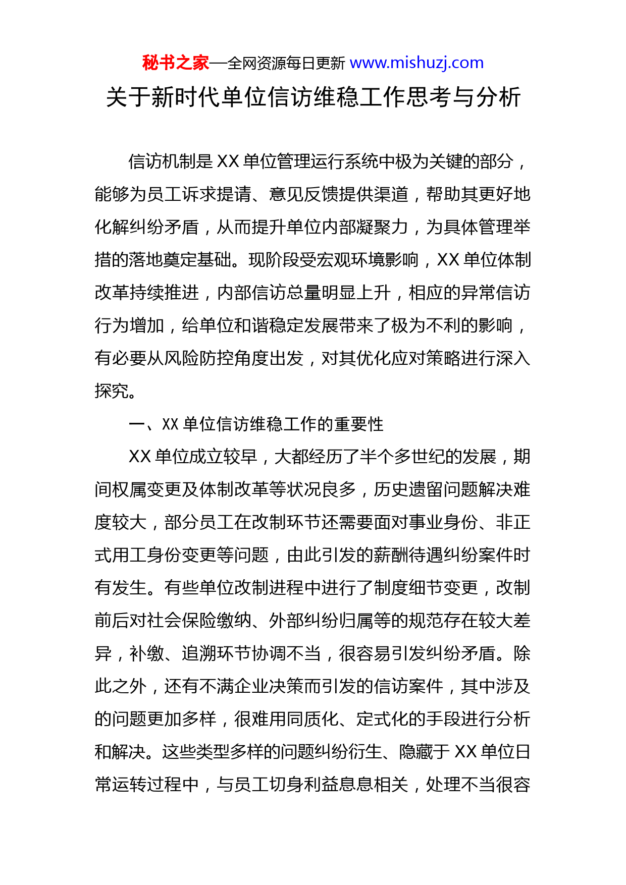 秘书之家—全网资源每日更新www.mishuzj.com关于新时代单位信访维稳工作思考与分析信访机制是XX单位管理运行系统中极为关键的部分,能够为员工诉求提请、意见反馈提供渠道,帮助其更好地化解纠纷矛盾,从而提升单位内部凝聚力,为具体管理举措的落地奠定基础。现阶段受宏观环境影响,XX单位体制改革持续推进,内部信访总量明显上升,相应的异常信访行为增加,给单位和谐稳定发展带来了极为不利的影响,有必要从风险防控角度出发,对其优化应对策略进行深入探究。一、XX单位信访维稳工作的重要性XX单位成立较早,大都经历了半个多世纪的发展,期间权属变更及体制改革等状况良多,历史遗留问题解决难度较大,部分员工在改制环节还需要面对事业身份、非正式用工身份变更等问题,由此引发的薪酬待遇纠纷案件时有发生。有些单位改制进程中进行了制度细节变更,改制前后对社会保险缴纳、外部纠纷归属等的规范存在较大差异,补缴、追溯环节协调不当,很容易引发纠纷矛盾。除此之外,还有不满企业决策而引发的信访案件,其中涉及的问题更加多样,很难用同质化、定式化的手段进行分析和解决。这些类型多样的问题纠纷衍生、隐藏于XX单位日常运转过程中,与员工切身利益息息相关,处理不当很容秘书之家—全网资源每日更新www.mishuzj.com易损伤内部凝聚力,导致管理服务效能下降。信访工作为公民提供了开放的沟通渠道,员工可以借助信访机制较为直接、快速地反映相关问题,从而彰显党联系群众、团结群众的基本思想,提升党组织的亲和力,节省领导基层走访、调查所需耗费的人力物力资源,也能够较好地践行XX单位“以人为本”的重要理念,帮助单位准确、及时获悉各岗位人员工作情况,为反贪腐、正新风提供依据,保障单位和谐、稳定发展。二、新时代XX单位信访工作的难点分析(一)信访总量有所上升,群访占据较大比重。在市场经济繁荣、产业结构变更的新常态背景下,我国XX单位经营运转环境愈发复杂,各种生产要素及利益分配机制有所改动,薪酬体系、社会保障等细节有待完善,带来的不稳定因素明显增多。同时,技术革命进程的深化也使得媒体环境发生较大改观,以网络门户、短视频平台为代表的新媒体与电视广播等传统媒体充分交融,信息传播流通速度明显加快,网络环境中各种思想形态更是鱼龙混杂,对职工理念产生了一定影响,部分落后、腐朽思想更是乘虚而入,冲击瓦解着正确的价值观念。诸多历史积累因素、变革因素以及突发性因素缠绕、发酵,使得矛盾纠纷出现频率明显上涨,员工利益诉求也显著增多,房屋租售、薪资矛盾等层出不穷,信访总量激增,基层接待联络压力倍秘书之家—全网资源每日更新www.mishuzj.com增。由于XX单位队伍庞大,职工联系较为密切,因此群访还成为信访环节的主要形式,部分职工抱有“法不责众”的心态,依托群访围堵、滞留、喊口号,给单位带来了诸多不利影响。(二)内部信访维稳意识不强且处理能力不足。信访具有较为明显的政治属性,能够为XX单位思政建设提供助力,帮助化解党组、群众之间的误会分歧,这就需要联络人员积极倾听群众心声,积极保障群众利益,并勇于接受群众监督,从而达到拉近党群距离、共建和谐氛围的基本目标。但从当前状况来看,很多XX单位的基层联络、接待人员并未树立起牢固、坚定的服务意识,对信访工作的认知存在一定误区,甚至将“维稳、降压”看作信访目标,接访环节抱有敷衍了事的心态,制约了信访机制运转效能的提升。同时,部分信访工作者还存在处理能力不足的问题,面对具体的劳务、薪酬纠纷时,欠缺敏感性与果断性,被动等待、被动接收的情况较为常见,不能积极发挥自身优势深入基层、连接一线,影响了信访案件解决效率。(三)行为激烈的异常信访及突发事件时有发生。XX单位内部信访机制的提供是为了强化联系、调和矛盾,其本身运行架构具有规范化、流程化特征,信访人员需要按照要求提供证据材料,并等待有关部门核实审查,继而得秘书之家—全网资源每日更新www.mishuzj.com出裁判处理结果。但从实践情况来看,部分群众及员工存在较强的不信任感,认为基层单位不具备反馈处理能力,对基层给出的解决方案,也存在诸多疑虑和不认可之处,上访环节更倾向于跨级、跨部反馈,越过基层单位直接寻求“上级领导”帮助,既定的信访流程被扰乱,相应的核实、查证工作推进难度较大。同时,部分群众存在“不闹不给”的错误思想,信访时拒绝倾听基层单位建议,而是企图用群体闹访、重复、多头上访等方式解决问题,动辄聚集、哄闹,影响XX单位正常办公秩序,甚至趁党代会等重要活动契机,带头聚众闹访施压,损伤了信访机制的权威性和秩序性。三、新时代XX单位信访维稳思路及策略阐述(一)迎合时代发展趋势,推出新型信访渠道。稳定、完善的制度体系是XX单位信访工作开展的基础保障,以其为依托可以有效规范信访接待、联络行为,减少态度敷衍、官僚主义等错误行径,实践环节务必要树立联动和创新意识,迎合时代发展趋势,健全内部信访体系和渠道。首先要积极推行领导包案制度,XX单位部分信访案件中,牵涉的因素较为复杂、多样,而基层单位能够调动的资源又相对有限,查证、核实及协调难度较大,很难保证案件处理效率,此时可以引入领导接访、轮流换班的机制体