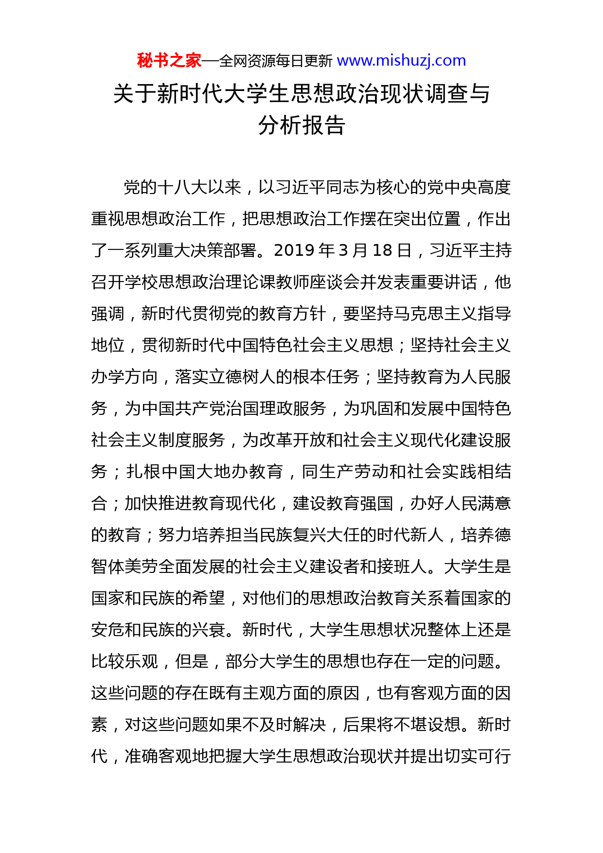 秘书之家—全网资源每日更新www.mishuzj.com关于新时代大学生思想政治现状调查与分析报告党的十八大以来,以习近平同志为核心的党中央高度重视思想政治工作,把思想政治工作摆在突出位置,作出了一系列重大决策部署。2019年3月18日,习近平主持召开学校思想政治理论课教师座谈会并发表重要讲话,他强调,新时代贯彻党的教育方针,要坚持马克思主义指导地位,贯彻新时代中国特色社会主义思想;坚持社会主义办学方向,落实立德树人的根本任务;坚持教育为人民服务,为中国共产党治国理政服务,为巩固和发展中国特色社会主义制度服务,为改革开放和社会主义现代化建设服务;扎根中国大地办教育,同生产劳动和社会实践相结合;加快推进教育现代化,建设教育强国,办好人民满意的教育;努力培养担当民族复兴大任的时代新人,培养德智体美劳全面发展的社会主义建设者和接班人。大学生是国家和民族的希望,对他们的思想政治教育关系着国家的安危和民族的兴衰。新时代,大学生思想状况整体上还是比较乐观,但是,部分大学生的思想也存在一定的问题。这些问题的存在既有主观方面的原因,也有客观方面的因素,对这些问题如果不及时解决,后果将不堪设想。新时代,准确客观地把握大学生思想政治现状并提出切实可行秘书之家—全网资源每日更新www.mishuzj.com的对策,有着重要的理论意义和现实意义。一、调查概况为了更好地了解新时代大学生思想政治方面的现状,我们对高校大学生开展了思想政治状况滚动调查。本次调查通过问卷星APP发放问卷,调查采取问卷调查与座谈、访谈相结合的方式,共发放调查问卷1500份,回收有效问卷1450份,有效回收率为96.7%。本次调查对象为高校学生(其中部分为研究生),涉及到的专业有思政、医学、英语、体育、中文、管理、法学等。另外,组织了百余名学生进行了座谈。本次调研围绕“大学生思想政治状况”这一主题,在查阅大量文献后,设计了相关调查问卷。在调研阶段,首先通过问卷星APP的快捷方式,以全国高校学生为调查对象发放电子问卷,收集第一手资料。其次,将收回的样本筛选后进行详细分析。最后,对分析得到的结果进行归纳汇总,从中找出存在的现实问题,并对问题进行深刻剖析,探讨解决问题的有效建议和对策。二、调查结果统计与分析通过对调查结果进行分析看出,新时代大学生思想状况既表现出了积极健康向上的一面,又表现了消极落后的一面。(一)大学生思想政治状况积极方面通过问卷调查发现,大学生思想政治状况积极的方面秘书之家—全网资源每日更新www.mishuzj.com主要可以归纳为以下几点。1.关心时事政治,政治立场坚定、政治态度鲜明通过调查显示,大部分学生表示对时事政治普遍关注,并且政治立场坚定、政治态度鲜明,对以习近平同志为核心的新一届中央领导集体充满希望,拥护中国共产党的领导和社会主义制度,对新时代中国特色社会主义道路满怀信心,并坚信中华民族伟大复兴的中国梦一定能实现。这表明新时代大部分学生在政治上、思想上积极向上,他们能够成为担当民族复兴大任的时代新人,能够成为新时代中国特色社会主义建设者和接班人。(1)政治态度鲜明,对中国特色社会主义道路充满信心。大部分学生具有鲜明的政治立场,在大是大非问题上保持清醒的认识,拥护中国共产党的领导和社会主义制度,对中国特色社会主义道路、理论体系和制度充满自信。在“对以习近平同志为核心的新一届中央领导集体自开始工作以来,给你留下的深刻印象”这一调查问卷中,90%的学生认同“亲民”“坚定”“务实”“清醒”和“自信”;在调查问卷所列的“必须坚持马克思主义在我国意识形态领域的指导地位”“中国共产党是中国特色社会主义事业的领导核心”“党的一系列方针政策是我们取得成功的可靠保证”“社会主义核心价值观是兴国之魂,决定着中国特色社会主义发展方向”等几个重大政治秘书之家—全网资源每日更新www.mishuzj.com观点上,学生赞同的平均占比为90.6%,而且表示“非常赞同”的平均占比为63.2%。(2)对国家的发展前景充满信心,坚定民族复兴的中国梦一定能实现。学生虽然认为“就业难,无业、失业人口多”(46.2%)、“腐败问题”(38.6%)、“区域发展不平衡,个人收入差距扩大”(50.2%)等依然是新时代影响我国社会稳定的主要因素,但相信在新一届中央领导集体的领导下,这些问题会陆续得到解决,人民的生活水平和生活质量会不断提高,相信人民对美好生活的向往会逐步实现,因而对国家的发展前景充满信心,也坚信民族复兴的中国梦一定能实现。在座谈中,学生们也纷纷表示,相信在党的坚强领导下,中国特色社会主义建设事业不断推进,社会主义现代化强国的目标也一定能实现,中华民族在国际上的影响力会不断增强,国际地位不断提高。这表明学生们对中国特色社会主义道路发展前景充满信心。2.政治思想整体上健康向上,认同社会主义核心价值观大部分学生政治思想现状整体健康向上,认同社会主义核心价值观,充分认识自身的社会责任和历史使命,积极投身社会实践。(1)世界观、人生观和价值观健康正确,思想积极向上。在“人民,只有人民才是历史的真正创造者”“每个秘书之家—全网资源每日更新www.mishuzj.com人的幸福要通过自己的奋斗才能获得”“国家的繁荣、