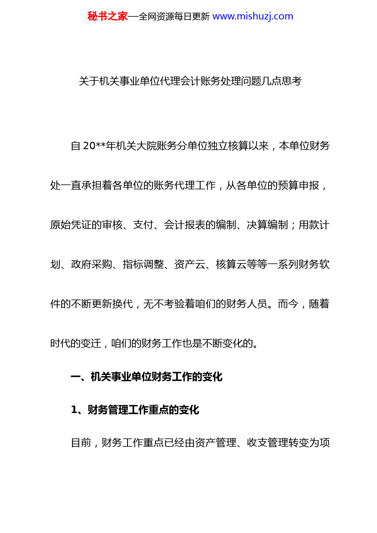 秘书之家—全网资源每日更新www.mishuzj.com关于机关事业单位代理会计账务处理问题几点思考自20年机关大院账务分单位独立核算以来,本单位财务处一直承担着各单位的账务代理工作,从各单位的预算申报,原始凭证的审核、支付、会计报表的编制、决算编制;用款计划、政府采购、指标调整、资产云、核算云等等一系列财务软件的不断更新换代,无不考验着咱们的财务人员。而今,随着时代的变迁,咱们的财务工作也是不断变化的。一、机关事业单位财务工作的变化1、财务管理工作重点的变化目前,财务工作重点已经由资产管理、收支管理转变为项秘书之家—全网资源每日更新www.mishuzj.com目资金管理、预算管理。财务工作由核算会计转变为管理会计。这一转变提高了对财务人员的要求,不仅要求财务人员掌握基本的工作技能,还要求掌握基本的管理知识。财务人员要参与到单位的管理中,为单位决策提供参考。2、财务工作目标的变化财务工作由重视管理监督转变为重视服务,服务与监督并重,以服务过程中加强监督,达到在做好服务的同时做好监督工作的目标。二、代理记账机关事业单位财务管理工作存在问题代理记账作为机关后勤服务之一,虽然有利于规范会计行为,降低政府成本,但也存在着相应的问题。秘书之家—全网资源每日更新www.mishuzj.com1、财务制度不健全不完善主要表现在:不遵循管理规范,凭证、支付标准不合规,审批程序不严密;财务核算不符合制度要求;会计业务处理不及时,单位规章制度条款笼统,缺乏针对性。2、财务、报账业务人员素质由于代理记账单位不设出纳、会计岗位,这就要求报账人员不仅要有一定的沟通、协调能力,还要具有一定的财务知识和相应的财务管理能力,而现有单位由于人才的缺乏或岗位配备人员不齐,报账人员均为编外人员,流动性大,且一人多岗,账务知识相对缺乏,财务管理水平相对不高;代理记账的出纳、秘书之家—全网资源每日更新www.mishuzj.com会计,一人代理多家单位,也不能更好的全身心地投入到服务单位的财务管理工作中,这就加大了财务管理的难度,也容易造成财务损失。3、财务业务的滞后脱节现象代理记账机关事业单位财务工作只做到了收款付款及做账不了解单位目前的工作重点,不了解主要事务的规划、实行、结果。对单位经济业务“只知其表,不知其里”,对业务发生的合理性难以作出判断,白条、不合规定票据虽然被拒之账外,但单位利用虚开发票掩盖不合规支出仍难以判别其真实性,导致财务工作的管理和服务没有起到有效的作用。秘书之家—全网资源每日更新www.mishuzj.com4、不重视内部财务控制管理机关事业单位的领导以及财务工作人员很大程度的决定了财务管理控制发挥的作用。有些单位在实际工作中,领导把财务管理当成后勤保障工作,忽视了其重要性,财务管理不能充分发挥效果,导致内部财务控制失去作用。三、代理记账机关事务单位财务管理存在问题对策1、加强机关事业单位财务基础管理机关事业单位一把手是第一责任人,财务分管领导负责财务开支审批等工作,财务部门统一管理机关事业单位财务、各级管理人员要严格按照《会计法》要求,按法规工作,履行管理职责。财务部门要严格遵循财务规章制度,做好会计核算、秘书之家—全网资源每日更新www.mishuzj.com银行账户管理等工作。巩固财务基础,达成财款、账实、账证、账账、账表相符,为财务管理提供真实准确的凭据。2、提高财务人员素质,提升管理水平提高素质的关键在于学习,管理人员的素质是重点,要加强对管理人员素质的培养,做有针对性的培训,促进管理人员素质的提高;财务人员也要不断学习,提高业务素质,工作能力,政策水平,还要注重职业道德修养,增强法律意识,严格按照规章制度、法律法规执行工作。3、加强沟通,统筹财务工作,避免脱节滞后现象建议财务部门定期举行例会,各部门,各负责人通报工作情况,让各岗位财务人员要了解目前工作进程,资金情况,现秘书之家—全网资源每日更新www.mishuzj.com阶段工作重点。只有充分的交流探讨,才能及时的发现问题,认识不足,总结经验。4、注重内部控制,完善内控管理,加强民主管理代理记账机关事业单位更要完善内控审计制度,确保财务会计资料的真实性。要尊重干部的知情权、参与权、监督权,让广大干部职工参与财务管理,鼓励广大干部职工的参与,发挥广大干部职工的作用,这也是提高财务管理的方法之一;总之,社会经济在不断发展中,机关事业单位财务工作也在不断地变化,机关事业单位财务管理也要不断地总结分析,发现问题,分析问题,解决问题,适应变化与发展。各机关事秘书之家—全网资源每日更新www.mishuzj.com业单位要根据自身工作实际情况,不断完善财务管理体系,建立起一套切实可行的机关事业单位财务管理机制。