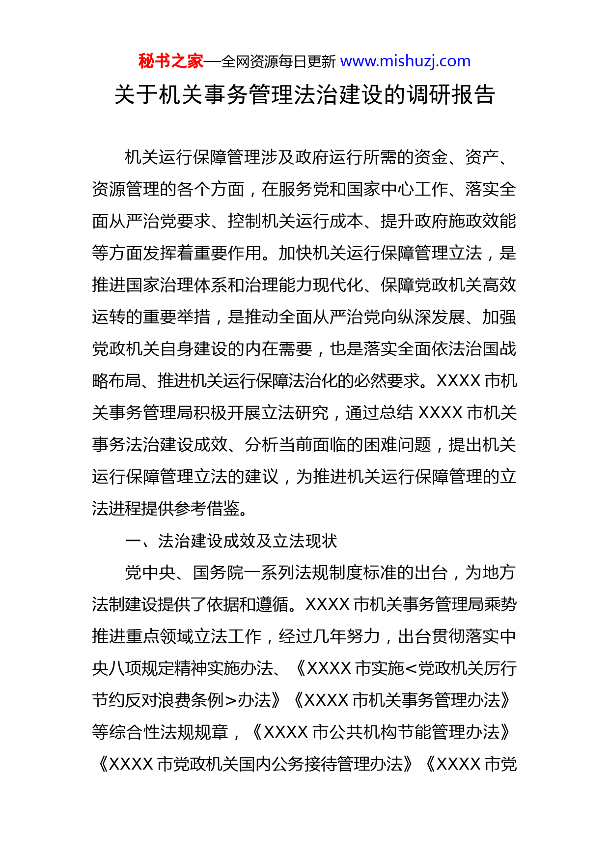 秘书之家—全网资源每日更新www.mishuzj.com关于机关事务管理法治建设的调研报告机关运行保障管理涉及政府运行所需的资金、资产、资源管理的各个方面,在服务党和国家中心工作、落实全面从严治党要求、控制机关运行成本、提升政府施政效能等方面发挥着重要作用。加快机关运行保障管理立法,是推进国家治理体系和治理能力现代化、保障党政机关高效运转的重要举措,是推动全面从严治党向纵深发展、加强党政机关自身建设的内在需要,也是落实全面依法治国战略布局、推进机关运行保障法治化的必然要求。XXXX市机关事务管理局积极开展立法研究,通过总结XXXX市机关事务法治建设成效、分析当前面临的困难问题,提出机关运行保障管理立法的建议,为推进机关运行保障管理的立法进程提供参考借鉴。一、法治建设成效及立法现状党中央、国务院一系列法规制度标准的出台,为地方法制建设提供了依据和遵循。XXXX市机关事务管理局乘势推进重点领域立法工作,经过几年努力,出台贯彻落实中央八项规定精神实施办法、《XXXX市实施<党政机关厉行节约反对浪费条例>办法》《XXXX市机关事务管理办法》等综合性法规规章,《XXXX市公共机构节能管理办法》《XXXX市党政机关国内公务接待管理办法》《XXXX市党秘书之家—全网资源每日更新www.mishuzj.com政机关办公用房管理办法》《XXXX市党政机关公务用车管理办法》等重点业务领域法规规章,机关事务立法已基本涵盖了各领域,“四梁八柱”式的制度体系基本形成,为推进依法管理保障服务提供了制度支撑。顺势而为,机构职能法定化显著增强。紧紧抓住机关运行保障法规制度逐步完善健全这一有利时机,依法规范职能机构。在职能配置上,《公共机构节能条例》施行后,管理局依法落实推进、指导、协调、监督全XX市公共机构节能工作的职责。以《机关事务管理条例》为遵循和依据,明确“指导全XX市机关事务工作”的职能,确立了机关事务部门上下指导关系。《党政机关厉行节约反对浪费条例》和《党政机关国内公务接待管理规定》依法落实了全XX市党政机关国内公务接待主管部门的职责。《党政机关办公用房管理办法》和《党政机关公务用车管理办法》强化了办公用房、机关用地、公务用车管理等职责,拓展了指导全XX市办公用房管理的职能。结合管理局承担的一系列清理整顿和改革任务,又增加了负责全XX市机关后勤体制改革、周转房管理、驻XX市会城市办事机构管理等职责。在机构设置上,继续作为XX市政府正处级直属机构,增设“建设工程管理处”,加挂“服务保障处”牌子,机关内设科室达到12个,单独派驻了驻局纪检监察组。新组建XX市直机关后勤保障中心,调整优化XX市直秘书之家—全网资源每日更新www.mishuzj.com机关国有资产数据应用中心和XX市直机关职工住房中心。在人员编制上,局机关行政编制大幅增加,从原来的XX名增加到XX名,增加比例达到XX%。目前XX市XX个县(市、区)全部设置了机关事务管理部门,其中X县机关事务管理部门转为行政机构,县(市、区)机关事务管理职能和机构建设得到加强。借势而进,集中统一管理扎实推进。持之以恒推进以资产管理为基础的集中统一管理,取得显著成效。办公用房方面,在资产调拨、税款减免、城市建设配套费免除等政策上实现历史性突破,破解统一权属登记难题;完成XX市级机构改革XX家部门单位和所属XXX家事业单位近XXX万平方米办公用房调整;审核办理房产维修改造项目XXX余个XX万平方米,节约财政资金X亿元;完成房产处置事项XXX件,盘活了国有资产。公务用车管理方面,实行“分级管理、上下贯通”XX市县乡3级联动管理体制,按照编制、标准、配备、经费、使用、处置全流程管理要求,重点做好保留车辆统一监管工作,以及加油、维修、保险“三定点”和社会化车辆租赁管理工作,将全XX市X万余辆公车全部纳入平台统一管理,XX市直公车使用率提升XX%。在行政资产管理方面,落实XX市委、XX市政府XX市级行政事业性国有资产管理改革要求,会同XX市财政处对XX市直行政事业资产进行清查核实,并提出资秘书之家—全网资源每日更新www.mishuzj.com产分类处理意见,为盘活存量资产奠定坚实基础。在干部住房管理方面,XX市厅级领导干部住房实现增量统一调配,XX市处级周转住房全部由管理局统一组织装修、统一配备家具家电。聚势而强,着力开拓进取推动工作创新。在标准化建设方面,协调XX市市场监管局,2021年,被国管局确定为“机关事务标准化综合性试点单位”和“标准化信息化‘两化融合’专项试点单位。以这两项国家试点为契机,建体系、抓编制、重实施、强基础,注重加强全XX市系统联动,统筹推进XX市级试点,对XX家试点单位、XX个试点项目开展验收工作,打造了一批可复制可推广的示范点。截至目前,累计制定发布XX项XX市级地方标准、X项工程技术标准、XX项市级地方标准,出台标准类规范性文件XX项,制发局内部标准XX余项,实现了对各项业务领域的全覆盖。在信息化建设方面,投入XXXX多万元,高效推进涵盖主干业务、智能服务、智能办公、大数据应用“四大板块”和“统一门户”的XXXX市智慧机关事务平台。管理局坚持一流的建设目标,面向全国遴选各业务领域最先进的系统软件,科学制定主干业务系统集成和统一门户架构方案。目前,已初步实现办公