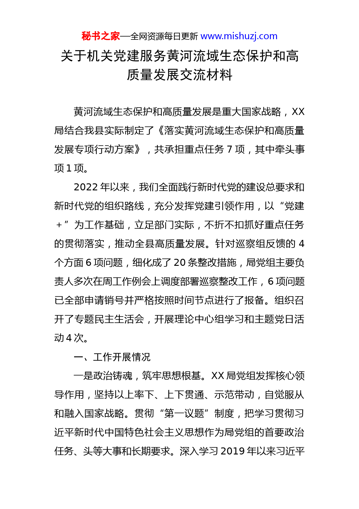 秘书之家—全网资源每日更新www.mishuzj.com关于机关党建服务黄河流域生态保护和高质量发展交流材料黄河流域生态保护和高质量发展是重大国家战略,XX局结合我县实际制定了《落实黄河流域生态保护和高质量发展专项行动方案》,共承担重点任务7项,其中牵头事项1项。2022年以来,我们全面践行新时代党的建设总要求和新时代党的组织路线,充分发挥党建引领作用,以“党建+”为工作基础,立足部门实际,不折不扣抓好重点任务的贯彻落实,推动全县高质量发展。针对巡察组反馈的4个方面6项问题,细化成了20条整改措施,局党组主要负责人多次在周工作例会上调度部署巡察整改工作,6项问题已全部申请销号并严格按照时间节点进行了报备。组织召开了专题民主生活会,开展理论中心组学习和主题党日活动4次。一、工作开展情况一是政治铸魂,筑牢思想根基。XX局党组发挥核心领导作用,坚持以上率下、上下贯通、示范带动,自觉服从和融入国家战略。贯彻“第一议题”制度,把学习贯彻习近平新时代中国特色社会主义思想作为局党组的首要政治任务、头等大事和长期要求。深入学习2019年以来习近平秘书之家—全网资源每日更新www.mishuzj.com总书记关于黄河流域生态保护和高质量发展的系列重要论述,制定局《行动方案》,细化工作任务,确保做到组织体系步调一致、协同配合、高质高效。成立局推进黄河流域生态保护和高质量发展工作领导小组,由局主要负责同志任组长,班子成员任副组长,有关科室负责同志为成员,具体负责黄河流域生态保护和高质量发展工作的组织领导、统筹协调和推动落实,形成“执行有力、上下联动、合力推进”的工作格局。二是党建赋能,共创先锋阵地。以“党建+”为基础,在强化党建引领上下功夫,强力推进党建同业务深度融合。充分发挥“党建+”引领作用,做好做强“XXXX”党建品牌。探索“党建+业务”做法,成立六个指导小组,党建+产业提升,培育核心产业链条,壮大产业集群规模;党建+企业培育,强力助企攀登进阶,大力培育优质企业,狠抓企业升规纳统;党建+技术创新,强化技改投资,培育提升研发机构,强化新产品研发推广,积极推动创新成果转化,加大企业家培训力度;党建+数字赋能,提升数字产业规模,筑牢产业数字化基础,加快推进智能制造;党建+安全绿色发展,实施绿色制造提升行动,持续强化能耗管控,深入开展化工行业安全生产转型升级专项行动,提升安全本质水平;党建+为企服务,优化提升工作作风,强化惠企政策落实。积极推进党建赋秘书之家—全网资源每日更新www.mishuzj.com能,延伸党建触角,筑牢党建阵地,助推黄河流域生态保护和高质量发展。三是服务为本,助推企业发展。坚持企业为本、企业家至上的服务理念,依托“党建+”工作模式,充分发挥党员先锋模范作用,扛牢为企业服务的重要责任,更加科学地指导行业发展。腾出更多时间和精力,亮明党员身份,深入企业一线,采取定向联系、专项服务等方式,帮助企业纾困发展。以提升干部执行力为切入点,强化使命担当,引领党员干部在黄河流域生态保护和高质量发展上攻坚突破,推动各项工作走在前、干在先、落在实,切实取得成效。二、存在问题一是党建工作创新能力不足。党建创新工作与中心工作融合还不够,还未能有效的运用创新的思路开展工作,尤其是以党建引领黄河流域生态保护和高质量发展方面,思维方式不够适应,能力素质受到挑战。面对黄河流域生态保护和高质量发展问题,习惯于到现成的条条框框中找规定,到过去的工作方法中求答案,去特定的事件中查原因,缺乏创新思维、辩证思维和前瞻思维,科学判断形势、把握工作规律的能力不强。二是党建与业务工作深度融合不够。认为黄河流域生态保护和高质量发展是相关业务科室的工作,没有将党建秘书之家—全网资源每日更新www.mishuzj.com工作与黄河流域生态保护和高质量发展战略深度融合,引导有关科室将更多资源配置到黄河流域绿色发展的重点领域和薄弱环节作用小。三是党员干部队伍单薄。党员人数少,具体业务多,很多工作出现人员交叉情况,导致部分党员干部很难把握住党建工作的重点,更难将党建与业务融合起来推进。有的党员干部工作模式单一,没有在推进业务工作中将党建工作贯穿其中,促进党建与黄河流域生态保护和高质量发展缺少方式方法。三、下步工作措施一是解放思想,深化“党建+”工作模式。抓实“党建+”与当前重点工作、业务工作相互融合共同推进新方法,把创新作为工作的灵魂,在实际工作中边实践、边探索、边总结,不断改进工作方法,通过学习提高综合素质和能力,不断增强党建工作与黄河流域生态保护和高质量发展等工作的责任感和使命感,切实担负起工作职责,为创新党建工作打好坚实的基础。二是统等兼顾,确保党建与业务深度融合。把握好党建与业务工作的结合点和着力点,严格履行好“一岗双责”,在思想上真正认识到党建工作在保证和促进业务工作方面的重要性,把党建工作与业务工作密结合起来,统等兼顾,一同部署,一同落实,以党建创新工作推动黄河秘书之家—全网资源每日更新www.mishuzj.com流域生态保护和高质量发展,以黄河流域生态保护和高质量发展的成果检验党建创新工作的效果。三是协同推进,在队伍建设上下功夫。要增强党建队伍实力,让业务