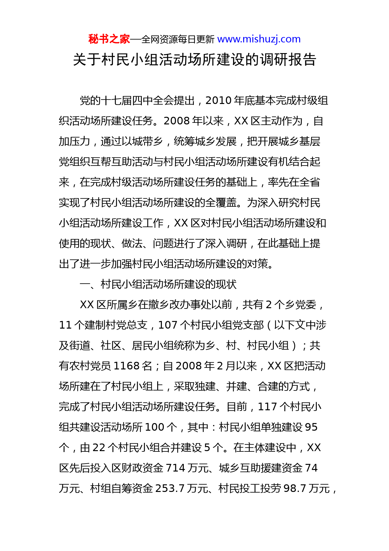 秘书之家—全网资源每日更新www.mishuzj.com关于村民小组活动场所建设的调研报告党的十七届四中全会提出,2010年底基本完成村级组织活动场所建设任务。2008年以来,XX区主动作为,自加压力,通过以城带乡,统筹城乡发展,把开展城乡基层党组织互帮互助活动与村民小组活动场所建设有机结合起来,在完成村级活动场所建设任务的基础上,率先在全省实现了村民小组活动场所建设的全覆盖。为深入研究村民小组活动场所建设工作,XX区对村民小组活动场所建设和使用的现状、做法、问题进行了深入调研,在此基础上提出了进一步加强村民小组活动场所建设的对策。一、村民小组活动场所建设的现状XX区所属乡在撤乡改办事处以前,共有2个乡党委,11个建制村党总支,107个村民小组党支部(以下文中涉及街道、社区、居民小组统称为乡、村、村民小组);共有农村党员1168名;自2008年2月以来,XX区把活动场所建在了村民小组上,采取独建、并建、合建的方式,完成了村民小组活动场所建设任务。目前,117个村民小组共建设活动场所100个,其中:村民小组单独建设95个,由22个村民小组合并建设5个。在主体建设中,XX区先后投入区财政资金714万元、城乡互助援建资金74万元、村组自筹资金253.7万元、村民投工投劳98.7万元,秘书之家—全网资源每日更新www.mishuzj.com共计1140.4万元用于活动场所建设。2009年3月,活动场所全面投入使用后,共投入97万元用于基础设施的配套建设;在作用发挥上,精心设计“七中心两站两家两窗口一室”的综合功能,有效保证了活动场所作用的有效发挥。二、村民小组活动场所建设的做法(一)主动作为,围绕工作目标,重“建”打造满意工程加强村级活动场所建设是贯彻落实党的十七大精神和十七届三中全会精神的重要措施。XX区通过创新思路,加强质量监管,公开建设程序,督促工程进度,开展城乡互助,真正把村民小组活动场所建设成了精品工程和群众满意工程。1.用试点积累经验,村民小组活动场所建设起点高。为了使村民小组活动场所建设成为农村基层党建工作主阵地,XX区坚持试点先行,高起点、高标准规划建设。建设初期,根据各村班子状况、行政村大小,分别选定部分村民小组作为村民小组活动场所建设的试点,在充分听取干部和党员群众意见的基础上,结合新农村建设整体规划,制定了试点建设工作方案,在建设资金的筹措、项目建设实施过程中,把好每个环节,不断总结工作经验,使试点建设顺利完成,为全面开展村民小组活动场所建设工作积累了经验。2.用监管确保质量,村民小组活动场所建设质量高。为把活秘书之家—全网资源每日更新www.mishuzj.com动场所建设成为“优质工程”、“群众满意工程”,XX区加大质量监管力度,形成立体化监管网络。一是每个村民小组活动场所都落实了一名乡党委或政府的领导干部定点负责,一名村干部现场值班,负责监管工程建设质量,督促施工队伍按要求建好活动场所;二是专门确定了11名建设质量监督员,对全区的活动场所建设实行包片负责;三是区村民小组活动场所建设工作领导小组组织督查组不定时地对各建设现场点,通过书面督查、电话问询、实地查看等灵活多样的方式进行抽查,发现质量问题,责令立即整改。同时,将建设程序全透明。XX区在村民小组活动场所建设中,将项目选址、比选、室内配置全部向党员群众公开,接受群众监督。按照活动场所方便群众、方便管理、节约成本的原则,广泛听取党员群众意见,确定建设地点。在建设过程中,组织农村老党员、老村干部对在建工程进行跟班监督,对项目规划、设计、实施、监管、验收等各个环节进行严格把关,确保工程质量。3.用目标倒逼进度,村民小组活动场所建设标准高。为确保村民小组活动场所建设任务如期完成,XX区强化督促,用目标倒逼工程进度,加快了工程建设步伐。XX区在试点村民小组活动场所建设的基础上,按照“新建一批、改造扩建或转化利用一批”的“三个批次”思路,对全区未达标村民小组活动场所建设项目提出了“规定时间、规定地域、秘书之家—全网资源每日更新www.mishuzj.com规定面积”的建设要求,为把村民小组活动场所建设成为质量一流的标志性建筑夯实了基础。在工程的监督上,在村民小组活动场所建设期间实行工程进度“周报”制,各乡党委每周向区委组织部集中如实报送一次工程进度;乡党委、政府班子成员每周至少抽出两天时间到每个村民小组活动场所实地查看,及时掌握建设动态,帮助解决建设过程中出现的各种困难和问题;区委组织部每半月通报一次建设工程进度、每月组织乡和相关职能部门召开一次建设协调会,催促乡村加快建设工程进程。为实现了村民小组活动场所建设全覆盖夯实了基础。(二)积极作为,围绕城乡统筹,重“联”推动互动共融XX区按照“建、管、用”并重的工作思路,围绕“六联六共六建”,努力使村民小组活动场所成为整合城乡资源,统筹城乡发展的平台,实现了各类基层党组织党建工作地有效对接和良性互动,构建城乡统筹的基层党建新格局。1.着力于难题攻坚,构建整体联动的城乡党组织设置体系。要全面实现村民小组活动建设全覆盖的目标,资金保障就成了一道难关,为深入推进村民小组活动场所建设活动,XX区着力于破解资金来源的难题,采取区补贴、乡补助、村自筹、社会援的办法,通过