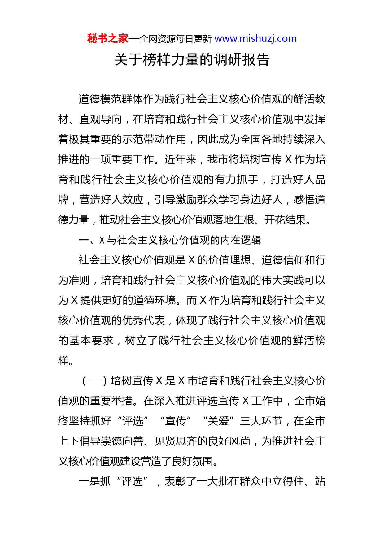 秘书之家—全网资源每日更新www.mishuzj.com关于榜样力量的调研报告道德模范群体作为践行社会主义核心价值观的鲜活教材、直观导向,在培育和践行社会主义核心价值观中发挥着极其重要的示范带动作用,因此成为全国各地持续深入推进的一项重要工作。近年来,我市将培树宣传X作为培育和践行社会主义核心价值观的有力抓手,打造好人品牌,营造好人效应,引导激励群众学习身边好人,感悟道德力量,推动社会主义核心价值观落地生根、开花结果。一、X与社会主义核心价值观的内在逻辑社会主义核心价值观是X的价值理想、道德信仰和行为准则,培育和践行社会主义核心价值观的伟大实践可以为X提供更好的道德环境。而X作为培育和践行社会主义核心价值观的优秀代表,体现了践行社会主义核心价值观的基本要求,树立了践行社会主义核心价值观的鲜活榜样。(一)培树宣传X是X市培育和践行社会主义核心价值观的重要举措。在深入推进评选宣传X工作中,全市始终坚持抓好“评选”“宣传”“关爱”三大环节,在全市上下倡导崇德向善、见贤思齐的良好风尚,为推进社会主义核心价值观建设营造了良好氛围。一是抓“评选”,表彰了一大批在群众中立得住、站秘书之家—全网资源每日更新www.mishuzj.com得稳、叫得响、传得远的好人典型。坚持两年一届的评选制度,贯彻群众选、选群众的评选原则,先后举办了六届X评选,命名表彰了X名来自基层、来自群众的好人群体,为全市人民树立起了一批又一批的道德榜样,建立起了人数众多、事迹突出的“X好人储备库”,在此基础上,先后推选出“全国道德模范”X、X夫妇,X等X位“全国道德模范提名奖”获得者、X位“中国好人”、X位省级道德典型。其中,“中国好人”上榜人数居全省第一。二是强“宣传”,积极营造规模大、覆盖广、影响深的宣传氛围。通过持续深入地媒体宣传、X事迹巡讲、文艺巡演、公益广告刊播等多种形式,让X的事迹精神进机关、进农村、进企业、进社区、进校园,将“好人现象”转化为“好人效应”,将典型的榜样力量转化为群众的生动实践。三是重“关爱”,积极倡导帮扶善待X的良好风尚。建立帮扶机制,制定帮扶办法,设立帮扶资金,解决X最迫切、最急需的生活困难。目前,共下拨X万元,先后帮扶了X位X。(二)X在社会主义核心价值观建设中的作用。X作为有形的正能量、鲜活的价值观,在我市社会主义核心价值观建设中发挥着重要作用。一是发挥导向作用。X评选设立有助人为乐、见义勇秘书之家—全网资源每日更新www.mishuzj.com为、诚实守信、爱岗敬业、孝老爱亲五个类型,这五个类型所蕴藏的价值内涵与社会主义核心价值观的基本要求相契合,为我们人生观、价值观的树立提供了导向,使得社会大众在日常生活中遇到相类似或相关的情况时能够作出正确的行为选择。二是发挥示范作用。X来自于群众,其鲜活的事例、质朴的言行、人格的力量引起群众共鸣,因为可亲可信可学,成为社会大众自觉学习模仿的标杆对象,进而成为日常习惯,真正达到社会主义核心价值观的“知行合一”。三是发挥激励作用。因为先进、高尚,X受到党和政府、社会各界的推崇和爱戴,从而激励着大众强烈地产生向学习、追赶、超越X的意识和行为,激励自己崇德向善,不断升华自身的道德境界。二、X在社会主义核心价值观建设中发挥作用的制约性因素分析X在推进我市社会主义核心价值观建设的过程中虽然发挥了重要作用,但仍然存在着作用发挥不到位、不充分等问题。(一)评选机制有待完善。从近年的评选来看,由于基层部门单位对推荐工作重视不够,致使推荐人选质量下降。一是群众参与性不高。虽然每届评选,都设有群众推荐形式,但实际通过群众推荐的人选很少,距离“群众秘书之家—全网资源每日更新www.mishuzj.com选、选群众”的评选氛围相差甚远。二是推荐的好人典型在数量质量上都有待提升。以第六届X评选为例。基层推荐人选的数量质量都不达要求。例如,“见义勇为好人”“诚实守信好人”类型,拟表彰X人,但推荐人数分别只有X人、X人。“敬业奉献好人”类型,虽然推荐人数达到X人,但大多集中在矿工、教师、医生、民警等领域行业,岗位失衡现象突出。三是评选推荐的渠道单一。X的评选推荐工作主要由市县级文明办和市直各工委承担,没有形成浓厚的道德模范推荐评选氛围,致使事迹感人的典型人物推荐不上来。(二)宣传效果需要提高。一是宣传方式缺乏多样性。媒体宣传活动主要通过电视、报刊等传统媒介进行宣传,而对微博、微信、微电影等新兴传播媒介利用较少。二是宣传载体不够丰富。社会宣传主要以道德讲堂、好人巡讲为主,受众群体的覆盖面不广,加之受“讲”的形式局限,对群众的现场感染力不够。三是宣传内容挖掘不深不透。对好人的宣传不到位,反映X精品力作欠缺,没有深入挖掘X精神内涵,在基层群众中的教育感召力都显不足。(三)帮扶激励机制不健全。一是救助措施单一。目前的帮扶工作主要由市文明委推进实施,以市委市政府的财政专项资金帮扶为主,一次性给予生活补助,在拓宽社秘书之家—全网资源每日更新www.mishuzj.com会帮扶渠道、调动群众关爱帮扶身边好人方面做得不够,还缺乏一些务实有效的举措,社会各界帮扶身边好人的风气不够浓厚。二是缺乏制度保障机