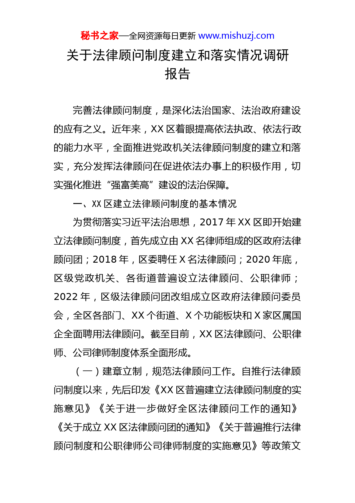 秘书之家—全网资源每日更新www.mishuzj.com关于法律顾问制度建立和落实情况调研报告完善法律顾问制度,是深化法治国家、法治政府建设的应有之义。近年来,XX区着眼提高依法执政、依法行政的能力水平,全面推进党政机关法律顾问制度的建立和落实,充分发挥法律顾问在促进依法办事上的积极作用,切实强化推进“强富美高”建设的法治保障。一、XX区建立法律顾问制度的基本情况为贯彻落实习近平法治思想,2017年XX区即开始建立法律顾问制度,首先成立由XX名律师组成的区政府法律顾问团;2018年,区委聘任X名法律顾问;2020年底,区级党政机关、各街道普遍设立法律顾问、公职律师;2022年,区级法律顾问团改组成立区政府法律顾问委员会,全区各部门、XX个街道、X个功能板块和X家区属国企全面聘用法律顾问。截至目前,XX区法律顾问、公职律师、公司律师制度体系全面形成。(一)建章立制,规范法律顾问工作。自推行法律顾问制度以来,先后印发《XX区普遍建立法律顾问制度的实施意见》《关于进一步做好全区法律顾问工作的通知》《关于成立XX区法律顾问团的通知》《关于普遍推行法律顾问制度和公职律师公司律师制度的实施意见》等政策文秘书之家—全网资源每日更新www.mishuzj.com件,明确此项工作的指导思想、基本原则、目标任务和责任落实,建立法律顾问选任、评价、奖惩、退出机制,为法律顾问工作的制度化、规范化奠定基础。(二)延伸发展,普及法律顾问制度。2017年XX区建立法律顾问制度时,就特别重视提升基层法治获得感,通过“民生工作站”,由区司法部门牵头,逐步为基层社区配备律师承担基层的法律服务和法律顾问工作。2022年,结合省司法厅《关于进一步规范村(社区)法律顾问工作的意见》精神,进一步规范提升社区法律顾问工作。截至目前全区XXX个社区均聘请了有丰富社区服务经验的法律顾问,实现了“一社区一顾问”的目标。(三)积极探索,放大法律顾问作用。在区委、区政府作出重大决策、出台重要文件、处理重大公共事务时,组织法律顾问进行风险评估,提出法律意见,找到相关疑难问题、执法困境的法律通道,为依法行政提供法律支撑。实行律师信访值班制度,在参与信访案件处理的过程中,既提出法律咨询意见,又开展法治宣传普及,帮助群众形成“解决问题靠法”的思维模式。确立由行政诉讼和矛盾调解经验丰富的律师组成服务征收律师库,创新法律顾问全面助推房屋征收工作,通过律师尽职调查、程序合法性审查、协议范本拟订、剩余户约谈、出具法律意见书等方式,从单纯的代理诉讼转变为专项法律服务,全面全秘书之家—全网资源每日更新www.mishuzj.com程介入,保障征收行为合法、征收程序依法推进。20222年,区政府聘请的法律顾问针对合同、规范性文件、日常决策、重大行政决策等进行合法性审查约XX余件,代理行政诉讼案件XX余件,就“街道吹哨、部门报道”、联合接待信访、项目推进等工作参会并提供法律意见约XXX余件,包括对执法案卷评查、规范性文件后评估、法治政府建设等在内的第三方评估事项共XX件;区级机关各部门聘请的法律顾问办理法律事务XXX余件,出具法律意见书XXX份,代理诉讼案件XXX件。同时,全区XXX个社区法律顾问服务接待咨询XXX余人次,微信、电话解答法律咨询XXXX人次,开展法律讲座XXX次,代写法律文书XX件。二、当前工作中存在的问题和短板XX区法律顾问制度建立较早,发挥作用也较为充分,但是对照深化法治建设的新要求和群众对于法治的新期待,依然存在亟待解决的问题和亟待补齐的短板,主要表现在以下三个方面。(一)“不敢用、不想用”的认识问题依然存在,“不会用、不善用”的能力短板还很突出。即便XX区法律顾问全覆盖的目标已经完成,但是少数单位对此项工作的实际意义和重要程度认识不够,具体事务中仍然习惯于按老规矩办事、按旧惯例行事,有时还有“家丑不可外扬”秘书之家—全网资源每日更新www.mishuzj.com的误区,害怕在法律顾问面前“揭短”,导致法律顾问实际作用的发挥难以深入、浮于表明。个别单位虽然聘请了法律顾问,但是存在被动应付的现象,使用过程中存在“两张皮”的问题,主要是法律顾问介入范畴有限,局限在行政复议、行政诉讼和涉法涉诉等传统法律服务方面,同时介入程度不深,对一些重大复杂事务的决策和处理后置化,没有实现全程法律护航,往往是“有问题才找顾问”。(二)遴选评价标准缺乏统一,顾问队伍不能满足需求,法律服务不够精准高效。XX区在制度上就法律顾问的选评等作了指导性规定,但实际操作中没有建立统一的遴选流程和评价指标体系,也没有统一的选聘、考评平台。各个部门在聘任法律顾问时,有的法律服务合同内容宽泛,与实际需要脱节;有的法律服务要求不够精准,没有完成发挥法律顾问的预期效果。特别是遴选环节,没有针对职能部门的工作性质和实际情况进行精准对接,有的法律顾问专业领域与受聘部门职能错配,难以发挥最大效果,比如XX区文旅局、XX区卫健委都反映所聘法律顾问存在对相关专业领域的法律法规不够熟悉、研究不够的问题。同时,街道综合执法改革以来,由于缺乏法律专业资质人员,部分街道法制审核工作只能交由街道司法所的非法律专业人员承担,存在潜在的行政执法风险,也未能充秘书之家—全网资源每日更新ww