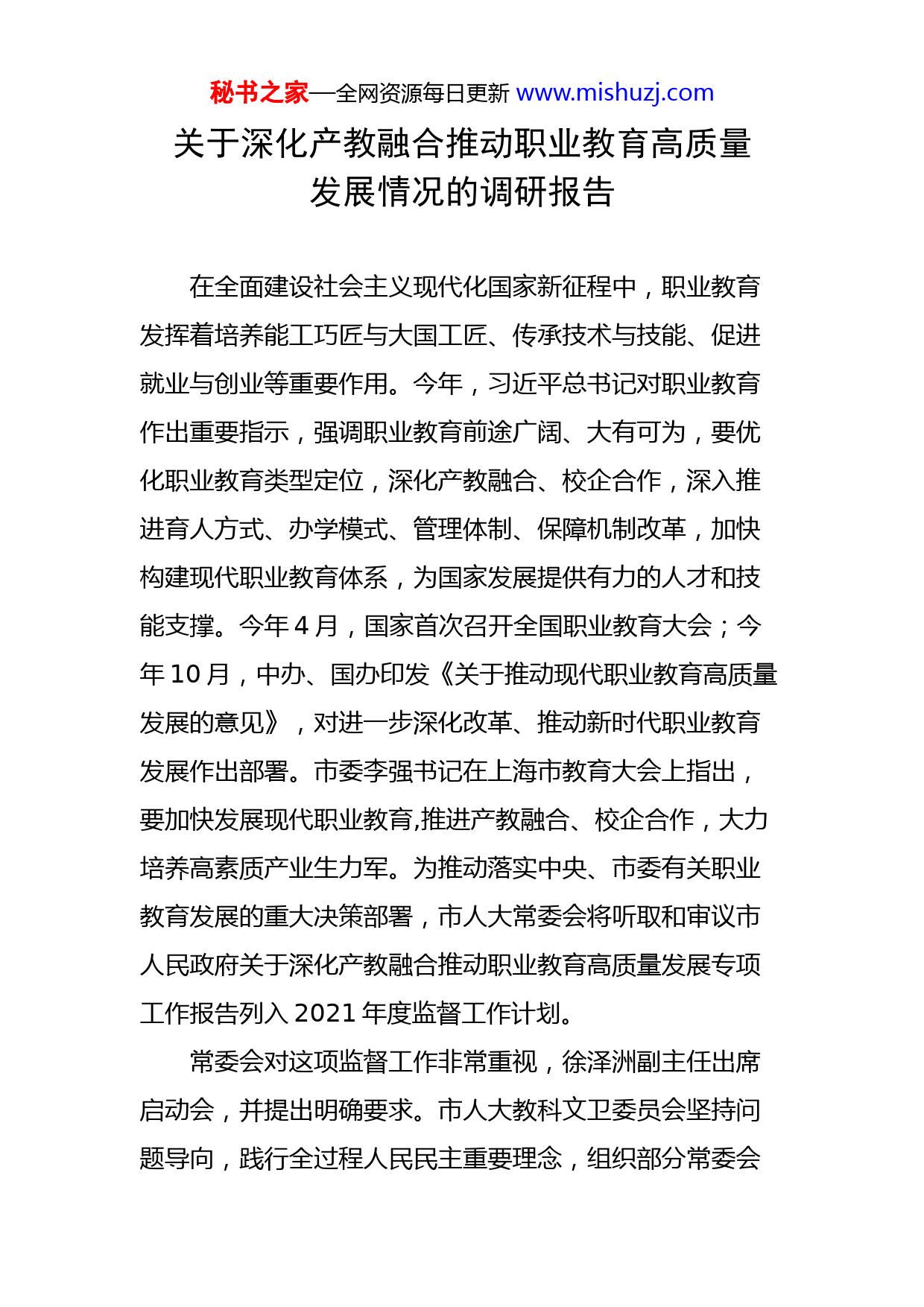 秘书之家—全网资源每日更新www.mishuzj.com关于深化产教融合推动职业教育高质量发展情况的调研报告在全面建设社会主义现代化国家新征程中,职业教育发挥着培养能工巧匠与大国工匠、传承技术与技能、促进就业与创业等重要作用。今年,习近平总书记对职业教育作出重要指示,强调职业教育前途广阔、大有可为,要优化职业教育类型定位,深化产教融合、校企合作,深入推进育人方式、办学模式、管理体制、保障机制改革,加快构建现代职业教育体系,为国家发展提供有力的人才和技能支撑。今年4月,国家首次召开全国职业教育大会;今年10月,中办、国办印发《关于推动现代职业教育高质量发展的意见》,对进一步深化改革、推动新时代职业教育发展作出部署。市委李强书记在上海市教育大会上指出,要加快发展现代职业教育,推进产教融合、校企合作,大力培养高素质产业生力军。为推动落实中央、市委有关职业教育发展的重大决策部署,市人大常委会将听取和审议市人民政府关于深化产教融合推动职业教育高质量发展专项工作报告列入2021年度监督工作计划。常委会对这项监督工作非常重视,徐泽洲副主任出席启动会,并提出明确要求。市人大教科文卫委员会坚持问题导向,践行全过程人民民主重要理念,组织部分常委会秘书之家—全网资源每日更新www.mishuzj.com组成人员和市人大代表开展专题调研,围绕影响产教深度融合的体制机制问题,从产、教两端入手,赴20多家企业和职业教育相关院校调研,广泛了解情况,深入分析问题,研究提出对策。一、基本情况市政府及相关部门全面落实国家相关法律法规和政策制度,结合本市实际,制定实施了多项具体政策,促进产教融合、校企合作,着力构建学历纵向贯通、产教横向融合的现代职业教育体系,总体达成《中国教育现代化2035》确定的教育事业发展和人力资源开发主要指标。(一)完善配套政策措施。为落实《国家职业教育改革实施方案》《国家产教融合建设试点实施方案》等重要文件,去年8月,市发展改革委、市教委等部门出台《上海市建设产教融合型城市试点方案》,明确产教融合型城市建设的总体要求和主要任务。今年4月,市发展改革委、市教委等部门陆续发布自贸区临港新片区国家产教融合试点核心区建设方案及28条支持措施,加快临港新片区高水平产业人才培养步伐。近期还将出台《上海市深化产教融合协同育人行动计划(2021—2025年)》,推进育人方式改革,培养更多高素质技术技能人才。(二)注重多部门共同保障。市发展改革委认定了116家产教融合型企业。市经济信息化委将产教融合列入秘书之家—全网资源每日更新www.mishuzj.com产业规划。市人力资源社会保障局改革职业院校教师薪酬机制,实施育训结合激励计划,对深入开展产教协同育人的教师实施优绩优酬并形成动态增长机制。市科委在优秀科技创新人才计划项目的申请条件中取消了学历限制。市财政局根据职业院校专业特点探索建立差异化拨款制度,逐步增加职业教育财政投入。(三)提升职业教育质量。一是提高专业设置与产业需求的契合度。推动职业院校专业设置由“学科导向”转变到“行业岗位需求导向”,近两年关闭180个不适应产业发展需求的专业点,引导职业院校新增了41个专业点,覆盖了集成电路、人工智能和生物医药等重点产业领域。二是推进不同层次职业教育纵向贯通。畅通从中职到专业学位研究生培养通道,打通了“中职—高职专科—应用型本科”纵向衔接通道,正在研制“应用型本科—专业学位研究生”贯通培养方案,进一步提升应用型人才培养层级。三是完善“双师型”教师培养机制。在全国率先开展职业院校新进教师规范化培训,实施新进教师持证上岗制度。加强“双师型”教师培养,中职和高职院校“双师型”教师占比分别达597%、6195%。(四)进一步强化产业导向。按照政府引导、企业为主、院校参与的原则,推行现代学徒制和企业新型学徒培养模式,开展六批“招工即招生、入企即入校、企校双师秘书之家—全网资源每日更新www.mishuzj.com联合培养”学徒制试点,将“培训1万名企业新型学徒”纳入市政府实事项目。在全国率先开展中职学历证书和职业资格证书“双证融通”改革试点,并逐步向高职专科、应用型本科延伸。把加大教育投入、强化人才协同培养等,作为遴选确定产教融合型企业的重要指标,引导企业参与职业教育。二、主要问题市政府及有关部门在推动职业教育发展方面做了大量工作,也取得了明显成效。但对照国家关于职业教育高质量发展的要求,对照上海产业结构转型升级的需要,产教融合的深度、校企合作的效果、职业教育的质量都还有继续提升的空间。(一)推进产教融合的管理体制和政策措施还有待完善。一是统筹协调机制有待健全。产教融合工作涉及发展改革、教育、国有资产监管、经济和信息化、财政、税务、人力资源社会保障等多个部门。虽然有关部门在产教融合型企业认定等具体工作中也加强了沟通协作,但统筹的层级不够高,对重点难点问题的协调力度还不够大。二是对产教融合型企业的激励政策力度还不够。目前,对产教融合试点企业支持力度最大的政策是举办教育投资额的30%抵免当年应缴教育费附加和地方教育附加。但这个政策的秘书之家—全网资源每日更