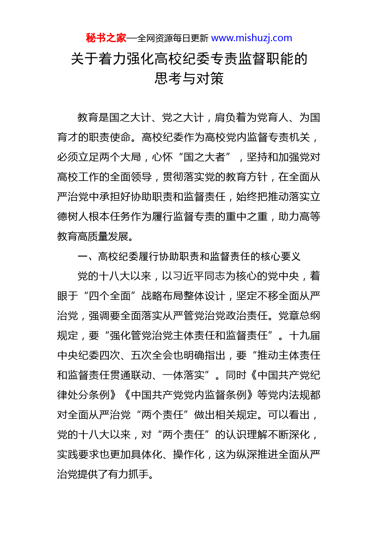 秘书之家—全网资源每日更新www.mishuzj.com关于着力强化高校纪委专责监督职能的思考与对策教育是国之大计、党之大计,肩负着为党育人、为国育才的职责使命。高校纪委作为高校党内监督专责机关,必须立足两个大局,心怀“国之大者”,坚持和加强党对高校工作的全面领导,贯彻落实党的教育方针,在全面从严治党中承担好协助职责和监督责任,始终把推动落实立德树人根本任务作为履行监督专责的重中之重,助力高等教育高质量发展。一、高校纪委履行协助职责和监督责任的核心要义党的十八大以来,以习近平同志为核心的党中央,着眼于“四个全面”战略布局整体设计,坚定不移全面从严治党,强调要全面落实从严管党治党政治责任。党章总纲规定,要“强化管党治党主体责任和监督责任”。十九届中央纪委四次、五次全会也明确指出,要“推动主体责任和监督责任贯通联动、一体落实”。同时《中国共产党纪律处分条例》《中国共产党党内监督条例》等党内法规都对全面从严治党“两个责任”做出相关规定。可以看出,党的十八大以来,对“两个责任”的认识理解不断深化,实践要求也更加具体化、操作化,这为纵深推进全面从严治党提供了有力抓手。秘书之家—全网资源每日更新www.mishuzj.com十九大党章和《中国共产党党内监督条例》中规定,党的各级纪律检查委员会是党内监督专责机关。新修订的《中国共产党普通高等学校基层组织工作条例》明确指出,高校纪委是高校党内监督专责机关,履行监督执纪问责职责。“监督、执纪、问责”,形成了从发现问题到执行纪律再到责任追究的链条。这要求包括高校纪委在内的各级纪律检查机关必须聚焦主责主业,持续深化“三转”,切实履行“专责”,既要积极协助党委深入推进全面从严治党,又要严格落实监督责任,督促推动管党治党责任落地见效。在履行协助职责方面,中共中央办公厅印发的《党委(党组)落实全面从严治党主体责任规定》明确了党的纪律检查机关在履行全面从严治党监督责任的同时,应当通过重大事项请示报告、提出意见建议、监督推动党委(党组)决策落实等方式,协助党委(党组)落实全面从严治党主体责任。十九届中央纪委四次全会工作报告提出,要强化纪委监督的协助引导推动功能,推动协助职责和监督责任贯通协同。因此面对新形势新任务新要求,高校纪委要准确把握职责定位,着力提升能力水平,主动谋划一体推动,积极为党委主体作用发挥提供有效载体,全力协助党委将全面从严治党推向深入。一是强化协助意识。深刻理解党委监督在党内监督中的首要地位,自觉接受同级党秘书之家—全网资源每日更新www.mishuzj.com委的领导,正确处理纪委专责监督和党委全面监督之间的关系,不能简单地把“协助”框定在正风肃纪上,还要准确把握“树木”和“森林”状况,研判系统内部政治生态,协助党委抓好管党治党责任落实。二是厘清协助内容。坚持党委负主体责任,确保纪委履责不缺位、不错位、不越位。通过专题工作汇报等方式,协助党委在决策层面把握“抓什么”,提出有针对性的意见建议;通过抓责任制落实等方式,协助党委在部署层面明确“抓住谁”,压实各级党组织主体责任;通过站位全局谋划推进思路等途径,协助党委在实施层面明确“怎么抓”,确保管党治党各项工作有检查、有落实。三是拓展协助路径。推动健全内部监督体系,促进各类监督贯通融合,构建完善沟通会商、信息共享、协同联动、整改问效等机制,实现各类监督主体在党委的统一领导下切实发挥作用,织密监督网络,形成监督合力。在落实监督责任方面,应清楚认识到,党委主体责任与纪委监督责任是管党治党责任的一体两面,是相互贯通、辩证统一的关系,既不能互相替代,更不能互相削弱。主体责任是“牛鼻子”,监督责任是保障,离开党委的坚强领导,纪委的监督保障作用自然难以发挥;而没有纪委的有效监督,主体责任这个“牛鼻子”也不易牵牢。因此在强化全面从严治党“两个责任”一体落实的实践要秘书之家—全网资源每日更新www.mishuzj.com求下,高校纪委要自觉将专责监督有机融入学校治理体系,充分发挥监督保障执行、促进完善发展作用。一是突出政治监督首责。新时代强化政治监督的根本任务就是“两个维护”,政治监督必须坚守政治属性,以做到“两个维护”为根本要求,紧盯决策落实、责任履行等方面,不断推进政治监督具体化、常态化。二是提升日常监督质效。立足“监督的再监督”,是纪委深化“三转”、聚焦主责主业、履行监督专责的具体要求和有效途径,这就要求高校纪委必须将日常监督工作的着力点放到对主责部门和责任人员履职情况的监督上来,紧扣重点部位权力运行和制度执行,强化靠前监督,加强预警提醒,督促增强制度意识、规范权力运行,抓好廉政风险防控。三是用好执纪问责利器。坚持“严”字当头,严格精准处置违纪问题,对不履行全面从严治党“两个责任”或履责不力的,严肃追责问责,倒逼责任落实,持续释放不担责就追责的强烈信号,督促推动学校各级党组织和党员干部切实做到知责担责尽责。二、高校纪委履行协助职责和监督责任面临的困境与挑战思想认识不够到位,协助职责还需进一步强化。一是从高校党委支持纪委履职角度看,有的高校党委对“两个责任