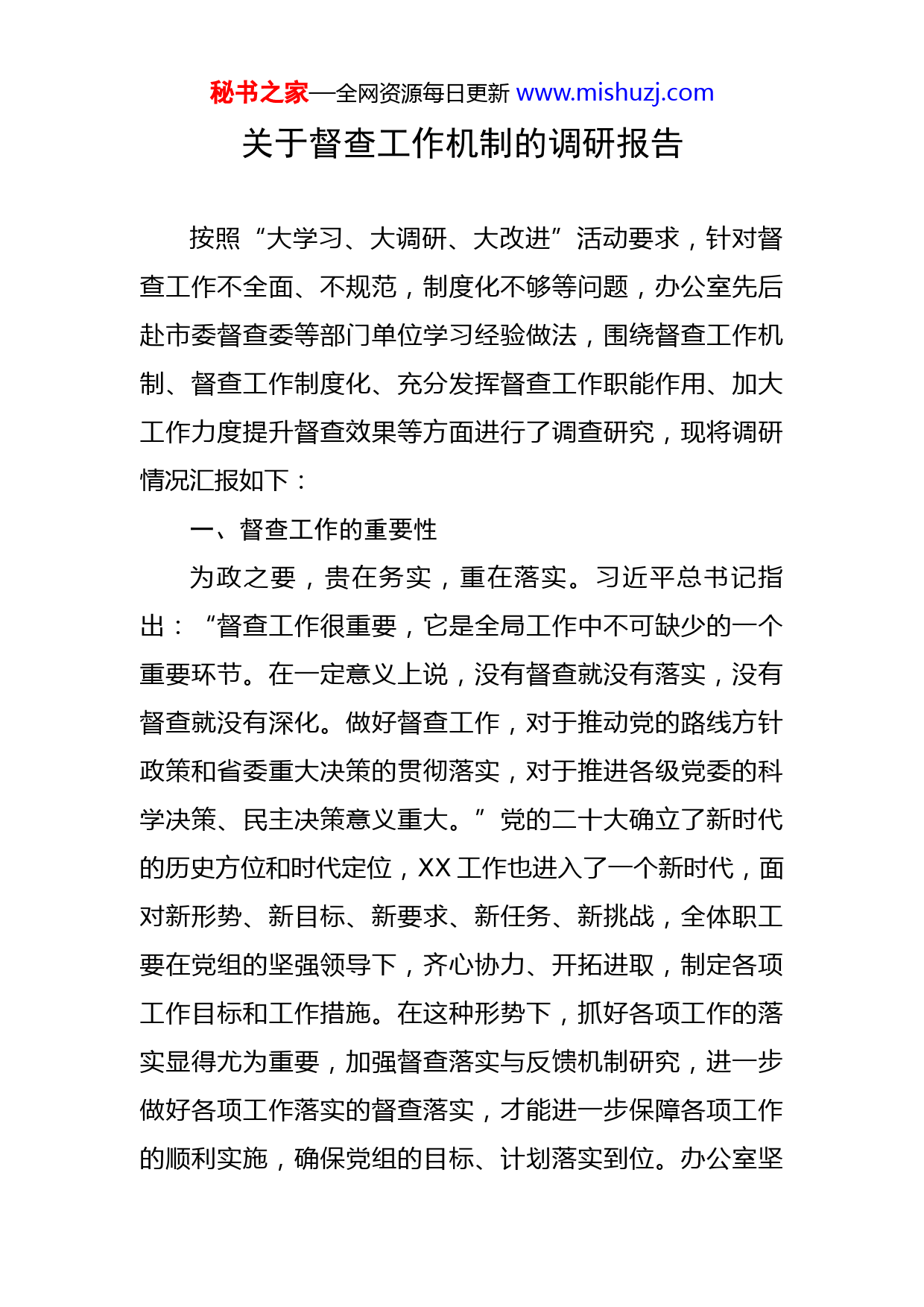 秘书之家—全网资源每日更新www.mishuzj.com关于督查工作机制的调研报告按照“大学习、大调研、大改进”活动要求,针对督查工作不全面、不规范,制度化不够等问题,办公室先后赴市委督查委等部门单位学习经验做法,围绕督查工作机制、督查工作制度化、充分发挥督查工作职能作用、加大工作力度提升督查效果等方面进行了调查研究,现将调研情况汇报如下:一、督查工作的重要性为政之要,贵在务实,重在落实。习近平总书记指出:“督查工作很重要,它是全局工作中不可缺少的一个重要环节。在一定意义上说,没有督查就没有落实,没有督查就没有深化。做好督查工作,对于推动党的路线方针政策和省委重大决策的贯彻落实,对于推进各级党委的科学决策、民主决策意义重大。”党的二十大确立了新时代的历史方位和时代定位,XX工作也进入了一个新时代,面对新形势、新目标、新要求、新任务、新挑战,全体职工要在党组的坚强领导下,齐心协力、开拓进取,制定各项工作目标和工作措施。在这种形势下,抓好各项工作的落实显得尤为重要,加强督查落实与反馈机制研究,进一步做好各项工作落实的督查落实,才能进一步保障各项工作的顺利实施,确保党组的目标、计划落实到位。办公室坚秘书之家—全网资源每日更新www.mishuzj.com决贯彻落实党组对于督查工作的要求,以“事事有回音、件件有落实”为目标,充分发挥督查工作职能作用,创新督查方法,细化督查措施,强化督查力度,提高督查实效,确保党组决策部署落到实处、收到实效,从而促进全单位各项工作目标按时优质完成。二、改进督查工作,发挥“三服务一作用”一是着眼全局,主动服务。把为党组领导提供全面、及时、详细的各项工作落实情况作为着力点和突破口,着眼党组中心工作,在做好日常督查的基础上,将督查工作融入到单位工作大局之中,进一步推动单位中心工作和全局工作的开展和落实。二是规范运行,靠前服务。进一步细化深化督查工作的要求、方法和程序,增强督查工作规范性、科学性,强化督查制度的规范运行。提前进入督查角色,及早发现工作落实过程中可能出现的困难和问题,并提出相应的对策建议。三是及时分析,跟踪服务。改进原来督办模式,进一步加大跟踪督查力度,将督查贯穿于落实的全过程,及时了解阶段性落实情况和落实过程中存在的问题困难,及时发现和研究深层次的问题,分析原因并及时上报,以便单位领导及时掌握工作进程,不断修正和完善决策,进一步推动工作更好开展和落实。秘书之家—全网资源每日更新www.mishuzj.com四是发挥督查情况反馈作用。强化督查结果利用,督办事项落实情况报党组领导签批后,及时把党组领导对于督办事项进展情况的指示精神和下步要求反馈相关科室,积极协助相关科室研究下步工作方案、制定有针对性的工作措施,确保按要求完成。三、工作具体措施一是加强理论学习,树立创新思维。始终把理论学习与提高个人综合素质放在首位,坚持学习习近平总书记对督查工作的重要讲话和重要观点,学习中央和省、市委关于督查工作的重要文件精神,学习党组领导对督查工作的重要指示精神,进一步解放思想、更新观念、开拓思路,积极探索新时代抓督查促落实的新思路、新措施、新办法,不断提高做好督查工作的能力,切实提高督查工作整体水平。二是规范批示件办理程序,建立健全督查工作制度。学习市委办、市府办领导批示件督办流程,结合我单位实际,进一步细化深化督查工作的要求、方法和程序,增强督查工作规范性、科学性,强化督查制度的规范运行。对党组领导批示件进行登记后,按党组领导批示意见和拟办意见迅速办理,对超出规定时限未办结的批示件及时进行催办,切实提高批示件办结率,确保事事有回音、件件有落实。在认真总结经验和借鉴其他单位好做法的基础上,秘书之家—全网资源每日更新www.mishuzj.com建立健全督查督办工作相关制度,研究制订《XX单位督查工作制度》,明确督查工作的内容、程序、方法和要求等。三是突出督查重点,强化督查内容。加强对市领导重要批示的督查事项、党组研究决定事项、主要领导批示、交办事项的督查,建立起有序高效的督查工作流程,规范督查行为。坚持主动对接,对督查工作出现的新情况及时请示沟通,把握原则,规范程序,进一步提高督查工作水平。在督查内容上,将主要领导签批件、党组决议事项、党组会领导会议、现场办公时的重要指示等事项纳入督查范围,并对落实情况坚持跟踪督查,直至落实到位。四是督查工作重心前移,做好督办情况汇总和反馈。将督查贯穿于督办事项落实的全过程,在督办事项交办时,即与承办科室沟通,明确上级有关要求、主要领导的批示精神、事项的办理时限等。在事项办理过程中,不定期进行督促,及时了解办理进度,是否存在困难,需要汇报的及时报主要领导,需要协调的积极协调有关科室,确保督办事项的按期完成。根据督查事项的范围,对超出规定时限未办结的批示件及时督促催办,定期对各督查事项的落实情况进行梳理汇总报党组领导审阅,让党组领导及时掌握各项工作进展情况,并及时将党组领导的指示要求反馈相关处室,进一步推动督办事项按时高效完成。每季秘书之家—全网资源每日更新www.mishuzj.com度初把上季度所有收到督办件落实