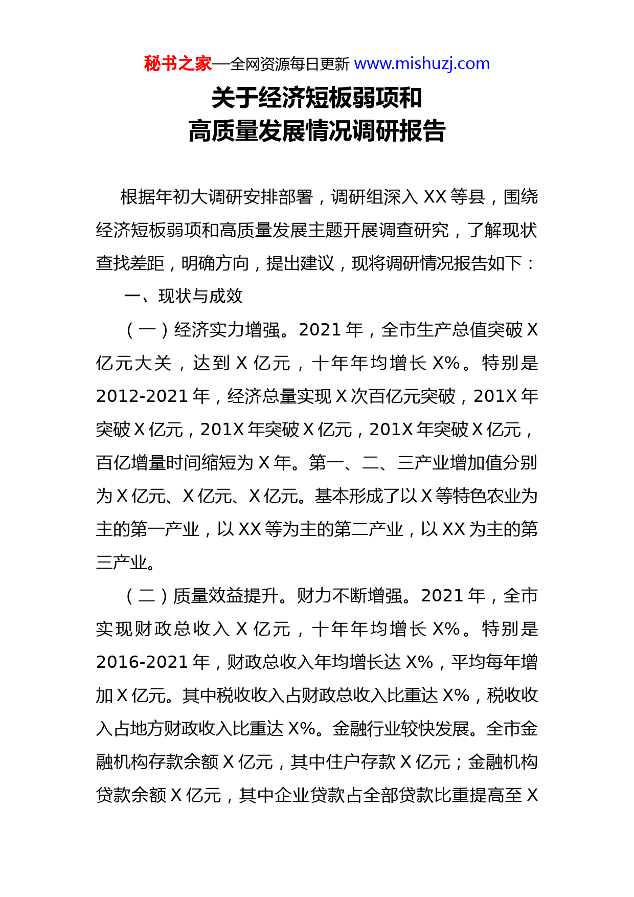 秘书之家—全网资源每日更新www.mishuzj.com关于经济短板弱项和高质量发展情况调研报告根据年初大调研安排部署,调研组深入XX等县,围绕经济短板弱项和高质量发展主题开展调查研究,了解现状查找差距,明确方向,提出建议,现将调研情况报告如下:一、现状与成效(一)经济实力增强。2021年,全市生产总值突破X亿元大关,达到X亿元,十年年均增长X%。特别是2012-2021年,经济总量实现X次百亿元突破,201X年突破X亿元,201X年突破X亿元,201X年突破X亿元,百亿增量时间缩短为X年。第一、二、三产业增加值分别为X亿元、X亿元、X亿元。基本形成了以X等特色农业为主的第一产业,以XX等为主的第二产业,以XX为主的第三产业。(二)质量效益提升。财力不断增强。2021年,全市实现财政总收入X亿元,十年年均增长X%。特别是2016-2021年,财政总收入年均增长达X%,平均每年增加X亿元。其中税收收入占财政总收入比重达X%,税收收入占地方财政收入比重达X%。金融行业较快发展。全市金融机构存款余额X亿元,其中住户存款X亿元;金融机构贷款余额X亿元,其中企业贷款占全部贷款比重提高至X秘书之家—全网资源每日更新www.mishuzj.com%,金融杠杆进一步化解,存贷比提高至X%。(三)结构不断优化。产业结构由以往的工业、农业主导向服务业主导转变。三次产业结构由2012年的XX﹕﹕X调整为目前的XXX﹕﹕。工业结构深入调整。特别是矿业占规模工业增加值的比重由原来的X%左右降至目前的X%左右,下降X个百分点;园区工业产值占全市工业总产值比重为X%;电子信息、新材料、新能源等新兴产业成为新的经济增长点。消费转型升级加快。吃穿等基本生活型消费向生活享受型消费转变,汽车类消费比2012年增长了X倍;农村消费占比由2012年X%提至X%。投资结构积极变化。由主要依靠国有投资、基础设施投资向依靠民间投资、产业投资、涉农投资等领域转变;2021年全市非国有投资、民间投资、涉农投资分别增长X%、X%和X倍;房地产业快速发展,20XX-20XX年全市累计完成房地产开发投资XX亿元,年均增长XX%;城镇化进程加快,房地产行业持续保持旺盛。旅游服务业加快发展。全市接待游客人数和旅游总收入由20XX年的XX万人、XX亿元增加到2021年的XX万人、XX亿元,分别增长XX倍和XX倍,成为全国旅游高速增长地区。2021年全市旅游及相关产业增加值达XX亿元,占GDP比重达XX%,居全省第X位。(四)城乡面貌大变。2021年全市固定资产投资X亿元,近X年来年均增长X%。城镇、交通、水利、电力、通秘书之家—全网资源每日更新www.mishuzj.com讯等建设成效明显,基础设施大为改善。全市城镇化率达X%,建成了具有民族特色、山区特征、时代特点的新型城镇体系,市府吉首和七个县城面貌变化明显。交通建设突飞猛进,实现了县县通高速、乡乡通水泥路、村村道路硬化能源建设不断加强,基本形成了以220千伏系统为骨干、110千伏系统覆盖全市的电网体系。信息网络建设日新月异,实现了4G信号全覆盖。(五)生态环境优良。大力实施退耕还林、石漠化综合治理等“绿色XX”工程,矿区复垦复绿,垃圾就地分类、资源化利用和处理,开展农村人居环境整治,美丽XX建设扎实推进,全市森林覆盖率达X%,居全国、全省前列。大气污染防治成效明显,二氧化氮、二氧化硫平均浓度逐年下降,空气质量平均优良天数比例达X%,保持全省前列。节能减排卓有成效。2021年全市规模工业综合能源消耗下降X%,其中六大高耗能行业综合能源消费量下降X%,每万元规模工业增加值能耗由201X年的X吨标准煤下降至2021年的X吨标准煤,下降XX%。(六)民生持续改善。牢记习近平总书记嘱托,大力推进精准扶贫精准脱贫,实施“十项工程”,脱贫攻坚成效显著。农村贫困人口由201X年的XX万人减少到2021年的XX万人,累计脱贫XX万人;贫困发生率由201X年的XX%下降到2021年的XX%,平均每年降低XX个百分秘书之家—全网资源每日更新www.mishuzj.com点;XX已进入减贫人口最多、农村面貌变化最大、群众增收最快的时期。同时,科教文卫等社会事业取得长足发展城乡居民收入较快增长。全市城镇居民人均可支配收入由201XX年的XX元增加到2021年的XX元,增长XX%;全市农村居民人均可支配收入由201X年的XX元增加到2021年的XX元,增长XX%。二、短板与弱项按照经济高质量发展要求,对照高质量发展考核指标,我市主要存在以下短板和弱项:(一)经济发展水平不高。2021年,全市人均GDP为XX元,仅为全省平均水平的XX%。全员劳动生产率为XX万元/人,仅为全省平均水平XX%。人均财政收入XX元,仅为全省平均水平的XX%。全社会R&D投入强度仅为XX%,比全省平均水平低XX个百分点。高新技术产业增加值占GDP比重仅为XX%,比全省平均水平低XX个百分点。制造业占GDP比重仅为XX%,比全省平均水平低XX个百分点。(二)实体经济实力不强。实体企业“散小弱”的特征仍比较明显,市场主体培育和发展不够。2021年,全市共有“四上企业”XX家,仅占全省的XX%;其中规模工业XX家,占仅占全省的XX%。企业规模普遍偏小,大中型工业企业仅占规模工业企业数的XX%,规模工业企业年平秘书之家—全网资源每日更新www.mishuzj.com均主营业务收入不到XX万元,仅为全省平均水平的三分之一。实体企业景气度普遍不高,活跃度不够,实力不够强部分企业运行较为困难,主导产业受政策、环保、市场等变化波动性较大,发展不稳定。(三)新旧动能转换不快。工业旧动能转
