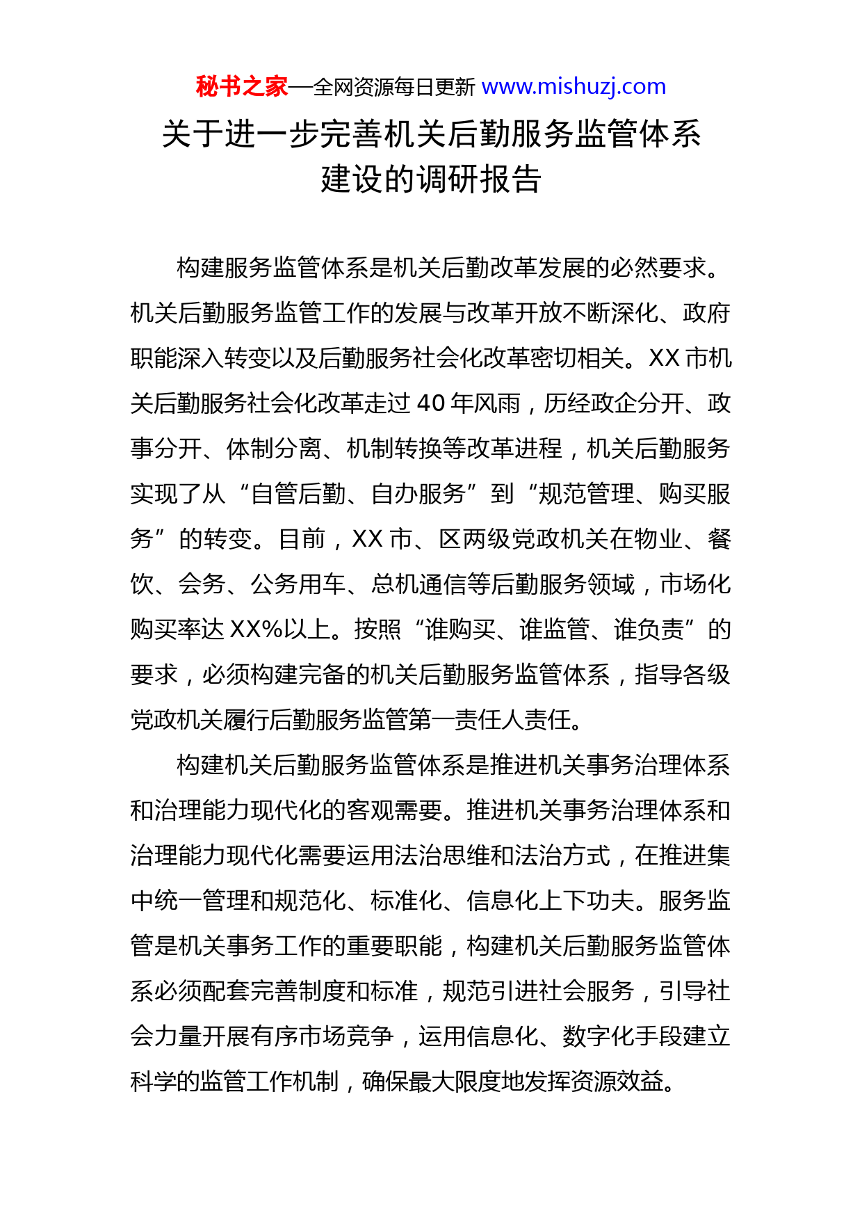 秘书之家—全网资源每日更新www.mishuzj.com关于进一步完善机关后勤服务监管体系建设的调研报告构建服务监管体系是机关后勤改革发展的必然要求。机关后勤服务监管工作的发展与改革开放不断深化、政府职能深入转变以及后勤服务社会化改革密切相关。XX市机关后勤服务社会化改革走过40年风雨,历经政企分开、政事分开、体制分离、机制转换等改革进程,机关后勤服务实现了从“自管后勤、自办服务”到“规范管理、购买服务”的转变。目前,XX市、区两级党政机关在物业、餐饮、会务、公务用车、总机通信等后勤服务领域,市场化购买率达XX%以上。按照“谁购买、谁监管、谁负责”的要求,必须构建完备的机关后勤服务监管体系,指导各级党政机关履行后勤服务监管第一责任人责任。构建机关后勤服务监管体系是推进机关事务治理体系和治理能力现代化的客观需要。推进机关事务治理体系和治理能力现代化需要运用法治思维和法治方式,在推进集中统一管理和规范化、标准化、信息化上下功夫。服务监管是机关事务工作的重要职能,构建机关后勤服务监管体系必须配套完善制度和标准,规范引进社会服务,引导社会力量开展有序市场竞争,运用信息化、数字化手段建立科学的监管工作机制,确保最大限度地发挥资源效益。秘书之家—全网资源每日更新www.mishuzj.com构建机关后勤服务监管体系是落实财政预算绩效管理的重要手段。机关后勤服务是政府购买服务的内容之一,2022年XX市财政局印发《XX市政府购买服务管理办法》,要求市、区各部门建立健全政府购买服务工作机制和管理制度,规范开展政府购买服务;要求购买主体加强政府购买服务项目预算绩效管理,按规定开展事前绩效评估,编报绩效目标,加强合同履约期间的绩效监控,定期对所购服务实施情况开展绩效评价。构建机关后勤服务监管体系,规范机关后勤服务购买行为,开展后勤服务项目审核,加强后勤服务合同履约监管,组织后勤服务质量考核评价,正是机关后勤服务落实财政预算绩效管理的重要手段。一、成效与经验XX市机关事务部门高度重视机关后勤服务监管工作,经过多年不懈努力和实践探索,初步形成了一套行之有效的工作思路和方法,奠定了XX机关后勤服务监管体系建设的基础,主要体现在4个方面。服务监管共识基本形成。2006年召开的第七次XX市区县机关事务管理局局长联席会议提出,推进机关后勤服务社会化改革、加强服务质量监管,必须站在实现政府管理职能转变的高度,增强对后勤服务监管重要性的认识,尤其要加快法治建设,抓紧制定科学的服务监管指标体秘书之家—全网资源每日更新www.mishuzj.com系,在建立机关后勤服务监管的法规制度、制定标准体系、完善操作办法上狠下功夫。自此,全市各级机关事务部门和广大机关事务工作者,迅速统一思想、形成共识,努力开创机关后勤服务监管工作新局面。逐步形成的工作思路和制度机制得到广泛认同,并上升为规范性文件条文,即在2017年3月施行的《XX市机关事务管理办法》中独立设置“服务管理”章节,明确服务监管工作相关要求。当前,全市各级机关事务部门和各社会服务机构均能各负其责,认真履行服务监管工作职责。服务监管职能不断清晰。职能清晰的特征一般以设立专门性机构为最终体现。2005年,XX市级机关事事务部门设立接待科(服务质量监管科),赋予服务监管工作职责;2009年,改为设立节能与服务监管科;2013年单列服务监管科(后勤改革指导科),专职履行机关后勤服务监管工作职责;各区相应成立专门部门或设置专门岗位,负责开展机关后勤服务监管工作。为机关提供后勤服务的各类机构不断增强质量监管意识,普遍设置服务监管、品质管控等专业部门,同步加强内部服务监管工作。服务监管职能在机关事务部门不同层级、多个领域逐步清晰、不断强化。服务监管制度和标准建设初显成效。经过多年探索实践,XX市机关后勤服务监管制度建设不断完善,制定出台秘书之家—全网资源每日更新www.mishuzj.com关于推进机关后勤服务社会化改革、服务质量管理和监督考核评价、合同备案管理等系列制度规范。近几年,按照国管局工作要求,大力推进后勤服务标准化建设,编制公布有关物业服务、餐饮服务、公务用车服务、会议服务、保洁服务、绿化服务、疫情防控以及机关物业费支出定额等系列标准,其中4项标准被列为XX市地方标准。机关后勤服务各承接主体均相应制定各项工作操作规范。较为完备的制度和标准,为深入开展机关后勤服务监管,提升机关后勤服务工作质量发挥了重要作用。服务监管工作体制机制逐步建立。XX市机关事务部门致力于建立科学的后勤服务监管工作体制机制,确保各项制度、标准和措施落实落地。在职责划分方面,明确市级机关事务部门负责监管市级机关后勤服务工作并指导区级有关工作;市级机关各部门负责对本部门后勤服务工作进行监管;机关后勤服务机构负责对承接的后勤服务工作进行日常监管,从而形成统分结合、三位一体、各负其责的监管体制。在监管方式上,采取制度标准输出、项目审核、合同备案、第三方测评等方式,实现对后勤服务项目实施情况的掌控。在集中办公点设立大楼管委会,联合开展服务监管,充分发挥机关事务管理先进创评和机关事务工作协会平台作用,组织