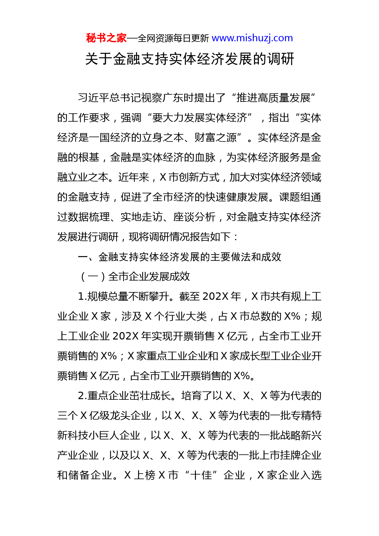 秘书之家—全网资源每日更新www.mishuzj.com关于金融支持实体经济发展的调研习近平总书记视察广东时提出了“推进高质量发展”的工作要求,强调“要大力发展实体经济”,指出“实体经济是一国经济的立身之本、财富之源”。实体经济是金融的根基,金融是实体经济的血脉,为实体经济服务是金融立业之本。近年来,X市创新方式,加大对实体经济领域的金融支持,促进了全市经济的快速健康发展。课题组通过数据梳理、实地走访、座谈分析,对金融支持实体经济发展进行调研,现将调研情况报告如下:一、金融支持实体经济发展的主要做法和成效(一)全市企业发展成效1.规模总量不断攀升。截至202X年,X市共有规上工业企业X家,涉及X个行业大类,占X市总数的X%;规上工业企业202X年实现开票销售X亿元,占全市工业开票销售的X%;X家重点工业企业和X家成长型工业企业开票销售X亿元,占全市工业开票销售的X%。2.重点企业茁壮成长。培育了以X、X、X等为代表的三个X亿级龙头企业,以X、X、X等为代表的一批专精特新科技小巨人企业,以X、X、X等为代表的一批战略新兴产业企业,以及以X、X、X等为代表的一批上市挂牌企业和储备企业。X上榜X市“十佳”企业,X家企业入选秘书之家—全网资源每日更新www.mishuzj.comX“百强”,在X市遥遥领先,为全市实体经济高质量发展做出卓越贡献。3.金融支持实体经济。202X年全市各项贷款余额同比增长X%,比X市平均增幅高X个百分点。其中,制造业贷款余额X亿元,同比增长X%,比X市平均增幅高X个百分点。(二)金融支持实体经济具体做法1.精准对接金融服务。为精准对接企业,我市开展了“X”专项行动,建立工作专班全面掌握企业实情,落实服务专员对接和驻厂员派驻的工作机制,确保企业享受“一对一”精准服务,建立“产融联络员+驻厂员+金融顾问模式”,及时将政策传达企业,将企业融资需求收集上来。在202X年疫情期间,相关银行机构赴X镇、X镇、X镇进行银企对接,召开金融政策礼包落实恳谈会,让金融服务面对面、点对点。2.创新金融支持手段。融资难融资贵一直以来成为困扰企业特别是中小微企业生存发展的痛点、难点问题。帮助全市中小微企业缓解资金难题,引导金融资源和企业需求有效对接,切实降低企业融资难度和资金成本,为实体经济高质量发展带来生机活力是重中之重。“中小微企业转贷资金”有效化解企业资金链断裂风险。为帮助企业降低融资成本,缓解资金运行压力,同时帮助银行化解企业还秘书之家—全网资源每日更新www.mishuzj.com贷风险,我市设立“中小微企业转贷资金池”,为企业提供低成本的转贷“过桥”服务,降低了我市中小微企业的融资成本,缓解资金运行压力,帮助银行化解企业还贷风险。202X年共为X家企业转贷X次,累计使用转贷资金X亿元。“X”开创融资担保新模式。政府性融资担保公司支持中小企业发展。首期出资X万参与X市信用担保基金,通过构建政府、银行以及担保、再担保四方联动的模式,帮助我市范围内的中小微企业解决融资难、融资繁、融资贵问题。“富民创业贷”推广工作成效显著。创业是富民之源,在“大众创业,万众创新”的浪潮中,城乡创业者创业激情逐年高涨,创业融资需求量也逐年增大,“富民创业贷”填补了金融普惠政策在创业就业方面的空白。人社、财政部门积极落实创业惠民政策,加大贷款贴息支持力度,引导金融机构“能贷尽贷、应贷快贷”,帮助创业人员解决资金周转问题。202X年发放个人创业担保贷款X万元,共计X人,发放小微企业贷款X万元,助推带动X人就业,有效激发创业者动力和激情,为创业领域带来蓬勃生机。3.推进企业挂牌上市。在加大银行业支持实体经济发展的同时,鼓励企业面向资本市场直接融资,加大企业上市奖励扶持力度。对于主营业务突出、核心竞争力强、发展前景好的规模企业,助力抢抓资本市场发展机遇,积极稳秘书之家—全网资源每日更新www.mishuzj.com妥、梯度有序推进上市。截止目前,全市已有X家主板上市企业,X家“新三板”挂牌企业,X家江苏股交中心挂牌企业。4.积极运作产业基金。通过设立基金形式投资企业,为具有发展潜力的企业提供资金支持,同时吸引更多先进技术、更多优质人才、更加丰富的业态。目前,我市基金管理总规模接近X亿元,先期投资已达X亿元,助力企业整合资源,优化产业结构,引导产业转型升级,做大做强,同时加快了政府职能转变,提高市场资源配置效率。二、当前金融支持实体经济发展存在的问题和短板(一)金融政策宣传力度还需进一步加强。课题组经过调查研究发现,我市高度重视扶持民营企业金融政策宣传,但疫情下中小企业“融资难”现象依然突出,中小企业由于信息不对称等问题,导致企业融资难、融资贵。(二)银行贷款支持空间还需进一步拓展。根据人行最新数据统计,我市制造业贷款余额较年初增加X亿元,同比少增X亿元,占X市新增贷款总量的X%,增量、占比为X市第X。我市贷款增量在X市排第一,但制造业贷款增量、占比为第X,制造业贷款增长放缓。商业银行传统的“重资产、重抵押”风控理念对于中小微企业来说融资门槛仍然较高,实际操作中更多还是“锦上添花”,而非“雪中送炭”。部分商业银行为企业转贷时,前期工作没秘书之家—全网资源每日更新www.mishuzj.com有到位,长时间占用政府转贷资金,在一定程度