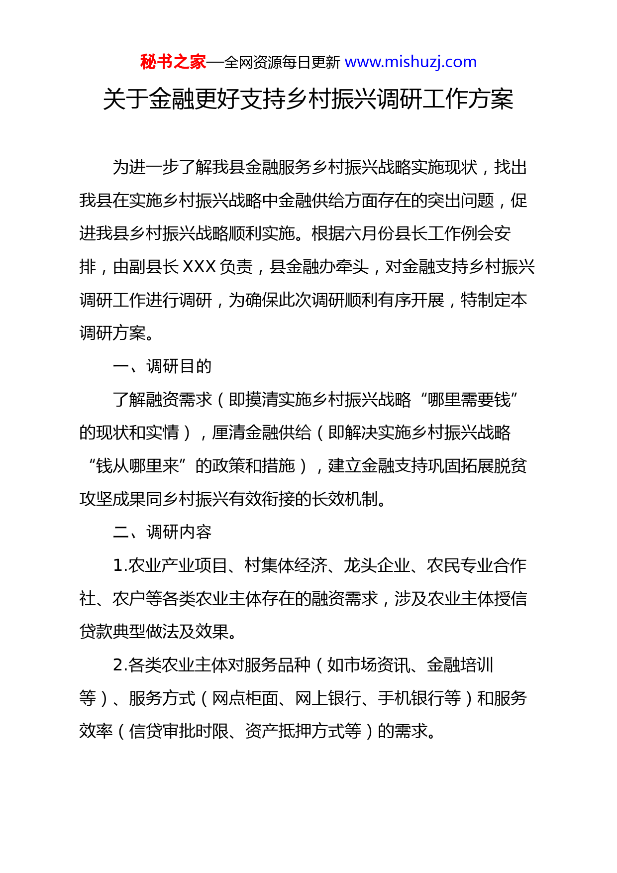 秘书之家—全网资源每日更新www.mishuzj.com关于金融更好支持乡村振兴调研工作方案为进一步了解我县金融服务乡村振兴战略实施现状,找出我县在实施乡村振兴战略中金融供给方面存在的突出问题,促进我县乡村振兴战略顺利实施。根据六月份县长工作例会安排,由副县长XXX负责,县金融办牵头,对金融支持乡村振兴调研工作进行调研,为确保此次调研顺利有序开展,特制定本调研方案。一、调研目的了解融资需求(即摸清实施乡村振兴战略“哪里需要钱”的现状和实情),厘清金融供给(即解决实施乡村振兴战略“钱从哪里来”的政策和措施),建立金融支持巩固拓展脱贫攻坚成果同乡村振兴有效衔接的长效机制。二、调研内容1.农业产业项目、村集体经济、龙头企业、农民专业合作社、农户等各类农业主体存在的融资需求,涉及农业主体授信贷款典型做法及效果。2.各类农业主体对服务品种(如市场资讯、金融培训等)、服务方式(网点柜面、网上银行、手机银行等)和服务效率(信贷审批时限、资产抵押方式等)的需求。秘书之家—全网资源每日更新www.mishuzj.com3.县级涉农领域金融扶持政策现状及建议、县级财政政策撬动金融经验及建议。4.各金融机构涉农领域金融产品现状及建议,农村信用体系建设现状及对策,了解银行机构对农业领域信贷投放存在的问题。5.实施金融服务乡村振兴战略的难点、痛点、堵点,以及创新方法、对策建议等。6.其他涉及金融支持乡村振兴的意见、建议。三、调研小组为确保调研活动顺利开展,特成立调研工作小组:组长:XXXxxx副组长:xxxxxxxxxxxx成员:xxxxxxxxxxxxxxxxxxxxxxxxxxxxxx联络员:xxxxxxxxxxxx秘书之家—全网资源每日更新www.mishuzj.com调研工作小组由县金融办牵头、xxx、县乡村振兴局配合,联络员负责协调对接和材料收集。四、调研方式调研采取听取汇报、实地考察、交流座谈、入户走访以及调查问卷等方式进行,形式灵活多样,调研工作小组根据每次调研活动需要,可以灵活调配组内参与人数和人员分工。五、调研安排(一)准备阶段(7月30日-8月15日):县金融办围绕调研目标,明确调研主题、对象、路线、方式,设计调查问卷等。出台调研方案,组织召开启动会议。(二)调研阶段(8月16日-9月30日):调研工作小组围绕调研内容展开调研,赴县外进行考察学习;组织召开银企对接会、专题座谈会(县金融办做好会务准备和安排)。(三)报告撰写(10月1日-10月15日):县金融办负责整理起草总报告初稿,报县政府办公室修改,提交最终调研报告。六、调研要求1.请调研组成员统筹安排好各自工作,积极参加调研活动。调研涉及单位结合各自工作实际,认真准备相关材料,并安排专人参与调研,大力支持调研工作。2.参加调研的人员要本着认真负责的态度,加强学习、主秘书之家—全网资源每日更新www.mishuzj.com动工作、讲究方法、深入思考,提建议、献良策,确保调研工作取得实效。县金融办要认真起草调研报告,报告5000字左右,要有内容、有分析、有观点、有意见,要对标先进,提出有针对性、指导性、操作性的政策建议和工作措施。3.县政府办公室要及时跟进了解调研工作进度、解决调研存在问题,督促指导调研工作。县金融办要每半月向县政府办公室书面汇报一次调研进度。4.调研人员要积极主动、克服困难,合理安排好本职工作,严守“八项规定”和实施细则精神,确保本次调研工作圆满成功。