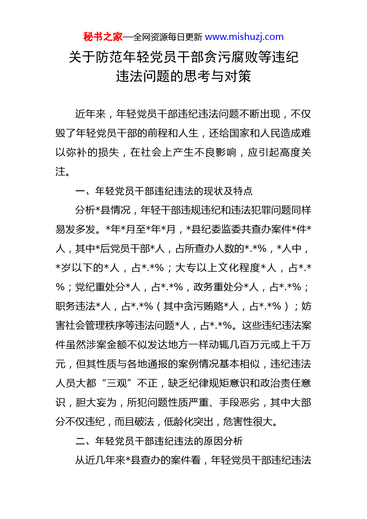 秘书之家—全网资源每日更新www.mishuzj.com关于防范年轻党员干部贪污腐败等违纪违法问题的思考与对策近年来,年轻党员干部违纪违法问题不断出现,不仅毁了年轻党员干部的前程和人生,还给国家和人民造成难以弥补的损失,在社会上产生不良影响,应引起高度关注。一、年轻党员干部违纪违法的现状及特点分析县情况,年轻干部违规违纪和违法犯罪问题同样易发多发。年月至年月,县纪委监委共查办案件件人,其中后党员干部人,占所查办人数的.%,人中,岁以下的人,占.%;大专以上文化程度人,占.%;党纪重处分人,占.%,政务重处分人,占.%;职务违法人,占.%(其中贪污贿赂人,占.%);妨害社会管理秩序等违法问题人,占.%。这些违纪违法案件虽然涉案金额不似发达地方一样动辄几百万元或上千万元,但其性质与各地通报的案例情况基本相似,违纪违法人员大都“三观”不正,缺乏纪律规矩意识和政治责任意识,胆大妄为,所犯问题性质严重、手段恶劣,其中大部分不仅违纪,而且破法,低龄化突出,危害性很大。二、年轻党员干部违纪违法的原因分析从近几年来县查办的案件看,年轻党员干部违纪违法秘书之家—全网资源每日更新www.mishuzj.com的原因是多方面的。一是年轻党员干部自我要求不严,纪律规矩和法律意识淡漠,违纪违法低龄化现象突出。由于涉世不深,缺乏社会阅历,加之纪律规矩淡薄、法律意识淡漠,一些年轻党员干部在是非、风浪面前禁不起考验,遇到别有用心之人,很容易成为“围猎”的对象和利用的工具。如县公安局交通警察大队某中队“”后辅警,受他人利诱,盗用中队正式民警数字证,登录交通违法处理系统帮助他人处理各类车辆非现场违章记录,短短一个多月的时间多次收取他人贿送的“好处费”共计万余元。二是目无纪法,见利忘义,把工作岗位当成为个人谋利的工具。个别年轻党员干部见利忘义、见钱眼开,通过非法手段谋取大额利益,违纪违法情节严重。如县公安局后辅警段某,利用自己在县公安检查站查缉的便利,多次为他人放行拉有走私物品的车辆,个月内多次收受他人贿送的财物共计人民币万余元,平均每月收取近元。三是缺乏社会责任感,权力集中或资金密集的岗位人员问题多发。有的年轻党员干部心思不在工作上,缺乏社会责任感、集体观念和纪法意识,而所在的岗位资源、资金富集,故只要违纪破法的口子一打开,便一发不可收拾,短时间内大量敛财聚财,最终走向犯罪的深渊。如县镇某村党支部党员,利用在某房地产开发有限公司财务秘书之家—全网资源每日更新www.mishuzj.com部工作的职务便利,通过虚开发票、收据等方式收取客户购房款万余元,并占为己有。最终被开除党籍,受到法律制裁。四是“三观”扭曲,思想道德严重滑坡。有的年轻党员干部整天沉迷于网络,在虚拟世界中天马行空,在真实世界里无所作为。有的人生观和价值观出了问题,贪图享乐,贪慕虚荣,玩物丧志。如县镇某村党总支党员、村民小组原组长,将万余元集体资金非法占为己有,将本小组部分地块的经营权违规转让给他人骗取转让金万余元,贪占、骗取的万余元资金全部被其用于赌博、偿还网络贷款和个人日常消费,最终被开除党籍,受到法律制裁。五是缺乏严格的教育和监管。由于用人单位缺乏严格的、有针对性的教育和监管,一些年轻干部入职后自我约束和自我管理不够,私欲膨胀,容易被不良嗜好和物质欲望冲昏头脑,甚至不惜以身试纪试法。如县纪委之前办理的一个案件中,一名刚参加工作不久的某基层单位财务人员许某,采取虚列补助名册、模仿领导签名等方式,在两年时间内套取资金万余元供个人日常消费,最终被开除党籍和公职,受到法律的制裁。六是辅助性岗位、公益性岗位人员问题易发值得警惕。这些人员大都“非专业出生”,素质参差不齐,有的秘书之家—全网资源每日更新www.mishuzj.com上岗之前未经过正规严格的培训,而用人单位对这些人员的管理相对滞后,提供的待遇也偏低,因此,面对监管漏洞和岗位权力的诱惑,这些人员极易发生违规违纪和违法犯罪问题。如县公安局辅助人员王某,利用财务人员的职务便利,将该为同事上缴保险的万余元费用占为己有,致使该参保的人员未按规定缴纳保险。三、防范年轻党员干部违纪违法问题的几点建议针对年轻党员干部违纪违法的特点及原因,建议从以下几方面抓好管理、做好防范。一是加强思想政治教育,增强社会责任意识。年轻党员干部文化水平和专业水平相对较高,但也存在较为明显的短板,即思想政治教育不到位,对国情、社情、民情缺乏深刻的认识和感受,宗旨意识和为民服务情怀相对淡漠,关键时刻难以掌控自己。为此,要采取多种方式加强对年轻党员干部的思想政治教育,引导年轻党员干部传承好党的优良传统和作风,不断提高政治领悟力、政治判断力、政治执行力,努力在服务群众、奉献社会中实现个人的人生价值。二是加强纪律规矩和法律法规教育培训,增强纪法意识。针对年轻党员干部工作时间不长、基层历练不够,正确的人生观、价值观尚未树牢,拒腐防变的能力较低,但却在重要岗位或者关键环节任职,极易出现问题的实际,秘书之家—全网资源每日更新www.mishuzj.com加强年轻党员干部的纪律规矩和法律法规教育培训,帮助他们树牢纪律规矩意识,知敬畏、存戒惧、明底线、守纪律,培养积