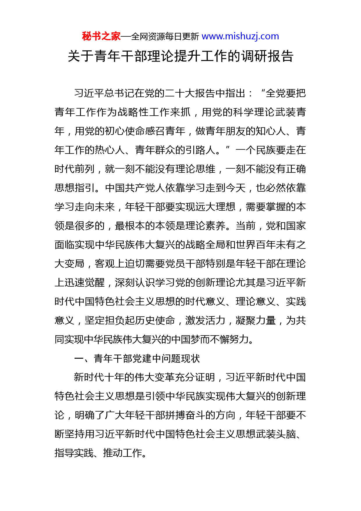 秘书之家—全网资源每日更新www.mishuzj.com关于青年干部理论提升工作的调研报告习近平总书记在党的二十大报告中指出:“全党要把青年工作作为战略性工作来抓,用党的科学理论武装青年,用党的初心使命感召青年,做青年朋友的知心人、青年工作的热心人、青年群众的引路人。”一个民族要走在时代前列,就一刻不能没有理论思维,一刻不能没有正确思想指引。中国共产党人依靠学习走到今天,也必然依靠学习走向未来,年轻干部要实现远大理想,需要掌握的本领是很多的,最根本的本领是理论素养。当前,党和国家面临实现中华民族伟大复兴的战略全局和世界百年未有之大变局,客观上迫切需要党员干部特别是年轻干部在理论上迅速觉醒,深刻认识学习党的创新理论尤其是习近平新时代中国特色社会主义思想的时代意义、理论意义、实践意义,坚定担负起历史使命,激发活力,凝聚力量,为共同实现中华民族伟大复兴的中国梦而不懈努力。一、青年干部党建中问题现状新时代十年的伟大变革充分证明,习近平新时代中国特色社会主义思想是引领中华民族实现伟大复兴的创新理论,明确了广大年轻干部拼搏奋斗的方向,年轻干部要不断坚持用习近平新时代中国特色社会主义思想武装头脑、指导实践、推动工作。秘书之家—全网资源每日更新www.mishuzj.com2019年7月,习近平总书记在中央和国家机关党的建设工作会议上强调:“中央和国家机关党员、干部要在学习理论上有更强自觉、在学懂弄通做实上有更高要求,不能随大流、一般化。”2020年1月,习近平总书记在“不忘初心、牢记使命”主题教育总结大会上指出:“不少年轻干部理论功底还不扎实、理想信念还不够坚定。要做到真学真懂真信真用,还需要下更大气力。”经过深入学习领会总书记关于理论学习的重要讲话,深入调研年轻干部理论学习现状,发现年轻干部群体在理论学习上还存在一些倾向性问题:一是对学习党的科学理论的重要性认识不足,片面认为理论学习是空的、虚的,对提升业务能力用处不大,只要把业务干好就行了,以至于对理论学习重视度不够高,把自学变不学。学习碎片化、随意化,感兴趣就学、不感兴趣就不学,理想信念的根基不牢。二是理论学习主动性不强。对于如何武装、武装哪方面不清楚、用到何处不明白,被动学的多,主动学的少,以业务工作忙为借口躲避学习,缺乏“挤”和“钻”的精神,缺乏危机感和紧迫感,学习起来也是三天打鱼、两天晒网。三是理论学习教育系统性不强,浅尝辄止、不求甚解,用“半瓶水”开展理论教育,学用脱节,看问题、作决策、推工作还是老观念、老套路、老办法,不能很好适应新时代新任务新要求。四是理论教育未能引起广大年轻干部群体共秘书之家—全网资源每日更新www.mishuzj.com鸣,缺乏感染力和吸引力,理论教育的针对性实效性有待增强。二、原因分析(一)科学理论是社会主义发展规律的体现,客观上较难把握,基础性、规划性的理论教育系统尚待完善理论学习要有“望尽天涯路”那样志存高远的追求,耐得住“昨夜西风凋碧树”的清冷和“独上高楼”的寂寞,静下心来通读苦读,才能“慕然回首”,在“灯火阑珊处”领悟真谛。于理论教育主体而言,需要从马克思主义哲学、政治经济学、科学社会主义等基础理论着手,引导年轻干部掌握社会主义发展的基本规律。于年轻干部等理论学习主体而言,通过理论学习把握社会主义发展客观规律的过程是日积月累的慢功夫,不能抱着读一遍就见效、学一次就成才的急躁心理、功利目的,要从增强理论自信着手,从领会习近平总书记对青年的寄语着手,深刻感受时代变化和党中央的殷切期盼,不断增强学习理论的兴趣,树牢终身学习理念,不断夯实理论功底。(二)科学理论是社会主义文化的重要载体,在全球多元文化背景下,年轻群体长期性、全面性的理论学习尚未形成共识在当今信息化时代,社会主义文化和全球多种文化相互渗透,80、90、00后年轻干部群体作为社会主义“接秘书之家—全网资源每日更新www.mishuzj.com班人”,价值观、人生观和世界观的形成不可避免的受国内外多元文化影响。部分年轻干部群体自由主义、个人主义思潮盛行,社会主义核心价值观不够牢固,关心个人利益的倾向增多,向往不切实际的自由,崇拜个人英雄主义,对参加各类理论学习缺乏兴趣、热情,积极性主动性不高。同时,部分宣传教育部门在意识形态领域斗争中,缺乏主战场的斗争意识,正确引导的力度不够,特别是爱国主义教育、形势政策教育、忠诚教育、社会主义核心价值观教育等未能结合实际有效开展,易受社会上、网络上的不良文化影响。(三)面对新形势、新情况、新问题,理论教育主体和理论学习客体尚未形成合力理论教育特别是理想信念培育工作是一项育警铸魂、固本培元的战略工程,青年工作也是一项战略性工作,需要上下共同发力、常抓不懈,需要对理论学习的重要性形成共识。部分单位的理论教育方式集中于文件传达、会议讨论、专家讲座等,不分教育对象的年龄、学历、经历等实际情况,教育“一刀切”,缺少层次、无重点,学习效果较差,理论教育脱离年轻干部队伍实际。一些单位聘请党校的专家、高校的教授讲授新理论、新思想,讲课专家并不十分了解年轻干部群体具体工作,不熟悉具体业务,讲课内容不能