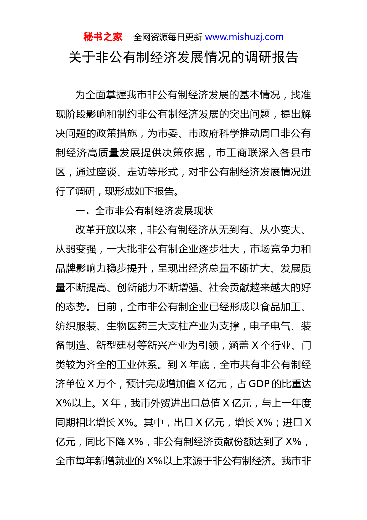 秘书之家—全网资源每日更新www.mishuzj.com关于非公有制经济发展情况的调研报告为全面掌握我市非公有制经济发展的基本情况,找准现阶段影响和制约非公有制经济发展的突出问题,提出解决问题的政策措施,为市委、市政府科学推动周口非公有制经济高质量发展提供决策依据,市工商联深入各县市区,通过座谈、走访等形式,对非公有制经济发展情况进行了调研,现形成如下报告。一、全市非公有制经济发展现状改革开放以来,非公有制经济从无到有、从小变大、从弱变强,一大批非公有制企业逐步壮大,市场竞争力和品牌影响力稳步提升,呈现出经济总量不断扩大、发展质量不断提高、创新能力不断增强、社会贡献越来越大的好的态势。目前,全市非公有制企业已经形成以食品加工、纺织服装、生物医药三大支柱产业为支撑,电子电气、装备制造、新型建材等新兴产业为引领,涵盖X个行业、门类较为齐全的工业体系。到X年底,全市共有非公有制经济单位X万个,预计完成增加值X亿元,占GDP的比重达X%以上。X年,我市外贸进出口总值X亿元,与上一年度同期相比增长X%。其中,出口X亿元,增长X%;进口X亿元,同比下降X%,非公有制经济贡献份额达到了X%,全市每年新增就业的X%以上来源于非公有制经济。我市非秘书之家—全网资源每日更新www.mishuzj.com公有制经济已经成为创造税收、促进经济发展、吸纳就业的重要力量,成为全市经济社会的重要组成部分。二、存在问题(一)整体水平不高。表现为非公有制经济总量偏少、产业结构不尽合理、发展质量不高、创新能力不强、管理水平不高、转型升级的主动性不高等方面。(二)发展瓶颈较多。表现为宏观经济形势复杂多变、融资困难、人才不足、生产要素保障不力、基础设施配套不完善、企业家整体素质有待提升等方面。(三)营商环境不优。存在社会氛围未完全形成、市场环境存在“两个不平等”、监管服务存在“一刀切”、政策落实没有延续性、政策扶持力度不够、“放管服”改革不到位、服务不到位、企业家精神弘扬不到位等问题。三、对策建议(一)全力培育壮大市场主体。一是实施重点行业、骨干企业培育行动。制定六大产业转型升级方案,推动优势行业转型升级、强核补链、培育品牌、提质增效;实施骨干企业倍增计划,遴选X家成长性好、创新能力强的骨干企业,支持骨干企业通过兼并、收购、联合等方式加快做大做强步伐;筛选认定一批“专精特新”中小企业,打造细分领域“隐形冠军”;建立股改上市重点非公有制企业库,大力支持非公有制企业上市。二是实施企业成长促进秘书之家—全网资源每日更新www.mishuzj.com行动。支持个体工商户新转为小微企业,重点在税费无负担过渡、权证无成本变更、转后跟踪服务等方面给予政策支持;支持小微企业新升为规模以上企业,对首次升级为规模以上企业的小微企业,由同级财政给予一次性奖励。三是实施企业引进行动。实施非公有制经济对外开放提升行动,提升各类开放载体平台功能,灵活运用集群招商、以商招商等方式,努力扩大非公有制经济投资,吸引更多的市场主体汇聚周口。四是实施非公有制企业公司制改制行动。以完善法人治理结构为重点,支持有条件的非公有制企业建立现代企业制度,推动企业管理创新和制度创新。(二)落实企业家素质提升工程。每年制定全市企业家素质提升和高管人才培训计划,按照“上下联动、分级组织、分层培训、分批实施”的原则,争取用X年时间对全市规模以上企业高管完成一轮系统培训。落实企业家培训专项培训经费,与高等院校、知名企业联合搭建培训平台,每年选送一批非公有制经济企业家进修培训,分期分批分行业组织中小企业高级管理人员开展短期培训;引导非公有制企业加强人才队伍建设,支持引进培养各类专业人才,鼓励大学生到非公有制企业就业创业。(三)推动企业转型升级发展。一是着力降低企业成本。降低企业税费负担,以宣传贯彻国务院“X+X+X”系列减秘书之家—全网资源每日更新www.mishuzj.com税政策为重点,抓好税收优惠政策落实。深化实施涉企收费清单制度,进一步清理不合理收费,坚决遏制收费乱象。二是着力破解融资难题。搭建企业融资对接平台,不定期将重点非公有制企业融资需求向金融机构推荐。完善企业转贷应急机制,市设立X亿元以上的企业还贷应急周转资金,各县(市、区)要设立不少于X万元的还贷应急周转资金,为企业转贷提供服务。支持非公有制企业上市融资。三是着力提升创新能力。充分发挥非公有制企业在科技创新中的主体作用,从培育创新引领性企业、平台、机制等方面,下大力气推动非公有制企业创新发展。(四)继续打造一流营商环境。一是优化市场环境。要进一步放宽市场准入,持续推进“市场准入负面清单制”,实施企业登记全程电子化,简化企业开办和注销程序,进一步降低市场准入门槛。要加强事中事后监管,推进“双随机一公开”监管全覆盖,加强跨部门联动响应,构建联合惩戒机制,形成市场主体自律、行业协会自治、社会监督和政府监管为基础的综合监管新局面。二是优化政务环境。要优化审批流程,加快推进企业登记便利化,全面提高政府部门效能。要改进服务方式,推进“互联网+政务服务”,实施企业登记全程电子化,全面推行在线办理,变“被动服务”