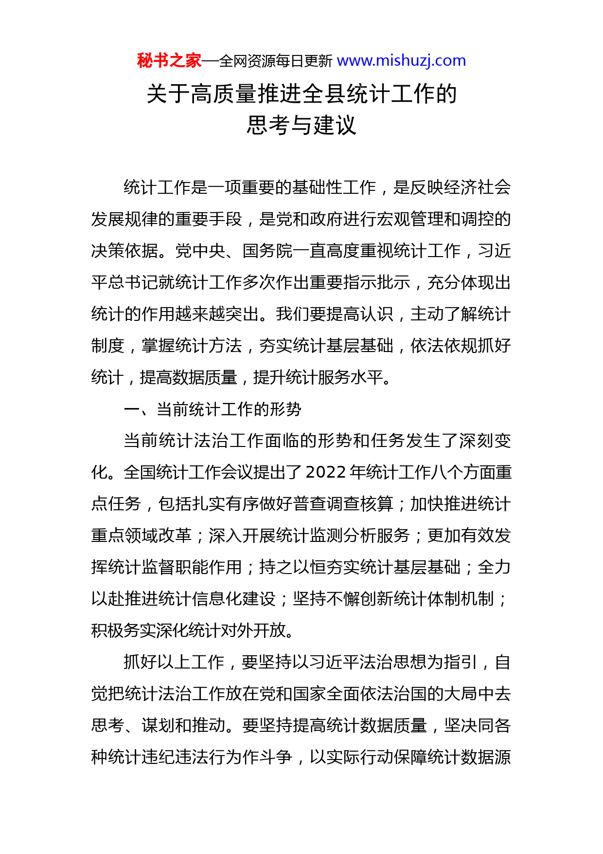 秘书之家—全网资源每日更新www.mishuzj.com关于高质量推进全县统计工作的思考与建议统计工作是一项重要的基础性工作,是反映经济社会发展规律的重要手段,是党和政府进行宏观管理和调控的决策依据。党中央、国务院一直高度重视统计工作,习近平总书记就统计工作多次作出重要指示批示,充分体现出统计的作用越来越突出。我们要提高认识,主动了解统计制度,掌握统计方法,夯实统计基层基础,依法依规抓好统计,提高数据质量,提升统计服务水平。一、当前统计工作的形势当前统计法治工作面临的形势和任务发生了深刻变化。全国统计工作会议提出了2022年统计工作八个方面重点任务,包括扎实有序做好普查调查核算;加快推进统计重点领域改革;深入开展统计监测分析服务;更加有效发挥统计监督职能作用;持之以恒夯实统计基层基础;全力以赴推进统计信息化建设;坚持不懈创新统计体制机制;积极务实深化统计对外开放。抓好以上工作,要坚持以习近平法治思想为指引,自觉把统计法治工作放在党和国家全面依法治国的大局中去思考、谋划和推动。要坚持提高统计数据质量,坚决同各种统计违纪违法行为作斗争,以实际行动保障统计数据源秘书之家—全网资源每日更新www.mishuzj.com洁流清。要坚持弘扬斗争精神,增强斗争本领,坚决打好打赢防范和惩治统计造假、弄虚作假战役。要坚持协同贯通凝聚合力,推动统计监督与纪律监督、巡视监督、审计监督等统筹衔接,进一步提升统计监督效能。近期,习近平总书记在省部级主要领导干部专题研讨班上的重要讲话,对当前和今后一段时期经济形势进行了科学合理的分析,也是今后抓好统计工作的根本遵循。我们要把深入学习贯彻习近平总书记重要讲话精神作为重大政治任务,深刻领悟“两个确立”的决定性意义,不断提高政治判断力、政治领悟力、政治执行力,始终在思想上政治上行动上同以习近平同志为核心的党中央保持高度一致。要坚持以中国式现代化推进中华民族伟大复兴,进一步提升统计工作的系统性、科学性、预见性、创造性,在中国式现代化进程中贡献统计力量。要准确把握当前我国经济发展面临的形势任务,全面落实疫情要防住、经济要稳住、发展要安全的要求,高效统筹疫情防控和统计工作,加强经济形势分析研判,强化对重大政策贯彻落实情况的统计监测,为巩固经济回升向好趋势提供真实可靠信息依据。要统筹发展和安全,抓好第五次全国经济普查筹备、统计云工程建设、第四届联合国世界数据论坛筹备等统计重点任务,着力强化网络安全和数据安全。二、2022年统计工作的重点任务秘书之家—全网资源每日更新www.mishuzj.com2022年统计工作,要以迎接和开好党的二十大为主线,坚持稳中求进工作总基调,认真贯彻党中央、国务院关于统计工作决策部署,深入推进依法统计依法治统,抓好中央《关于更加有效发挥统计监督职能作用的意见》重点工作贯彻落实。要着力提升统计督察效能,扎实开展统计督察“回头看”,认真做好统计督察“后半篇文章”。要保持统计违纪违法行为查处高压态势,建立健全统计执法常态化机制,严肃责任追究,加大通报曝光力度。要进一步健全统计法律法规,积极推进统计法修改,广泛开展统计法治宣传。根据全国统计工作提出的八项重点任务,结合X实际,X统计工作主要“围绕一个中心,做到两个坚持,抓好三项工作”。一个中心,即围绕全县经济高质量发展这一中心,扎实做好统计服务。具体包括,做好统计数据资料的编撰工作,及时准确向X政府提供科学决策和指导工作的依据,做到“用数据说话,为决策服务”;加强统计分析监测,通过加大对经济社会运行情况监测预警力度,准确研判宏观经济形势;加强统计社会化服务工作。坚持政府统计的公益性,坚持为人民服务的方向,通过新闻发布会、政务公开网等多种手段,积极推进政府统计信息公开,及时准确向社会发布统计数据、统计信息等,为社会公众提供更秘书之家—全网资源每日更新www.mishuzj.com加广泛、及时的统计信息服务,更好地满足社会日益增多的统计信息需求;做好GDP和各项专业指标预测预判工作;做好经济运行考评工作。两个坚持,一是坚持底线思维,进一步提升统计数据质量。加大统计执法检查力度;严格执行重大投资项目解锁制度,切实提升投资数据质量;扎实开展“统计服务千企”活动,帮助企业查缺补漏,梳理完善统计基础资料,促进企业依法统计,数出有据;强化企业纳统指导等靠前服务;巩固国家统计督察和省执法检查成果。二是坚持依法统计,进一步加强统计法治建设。积极采取多种方式宣传统计法律法规,营造依法统计的浓厚氛围;积极推动X政府及相关部门开展统计法律法规学习,对相关法律法规做好宣传解读。抓好三项工作,一是抓好统计基层基础建设工作,建立健全制度机制,增强服务基层能力,加强基层统计人员管理,不断提升统计规范化水平。二是抓好机关党建工作,持续强化政治引领,锲而不舍推进正风肃纪反腐,充分发挥党建引领作用。三是抓好统计队伍建设,坚持抓制度执行,形成规范有序约束机制,营造积极向上的干事氛围。做好2022年工作,必须坚持以习近平新时代中国特色社会主义思想为指导,全面贯彻党的十九大和十九届历次秘书之家—全网资源每日更新www.mishuzj.com全会与中央经济工